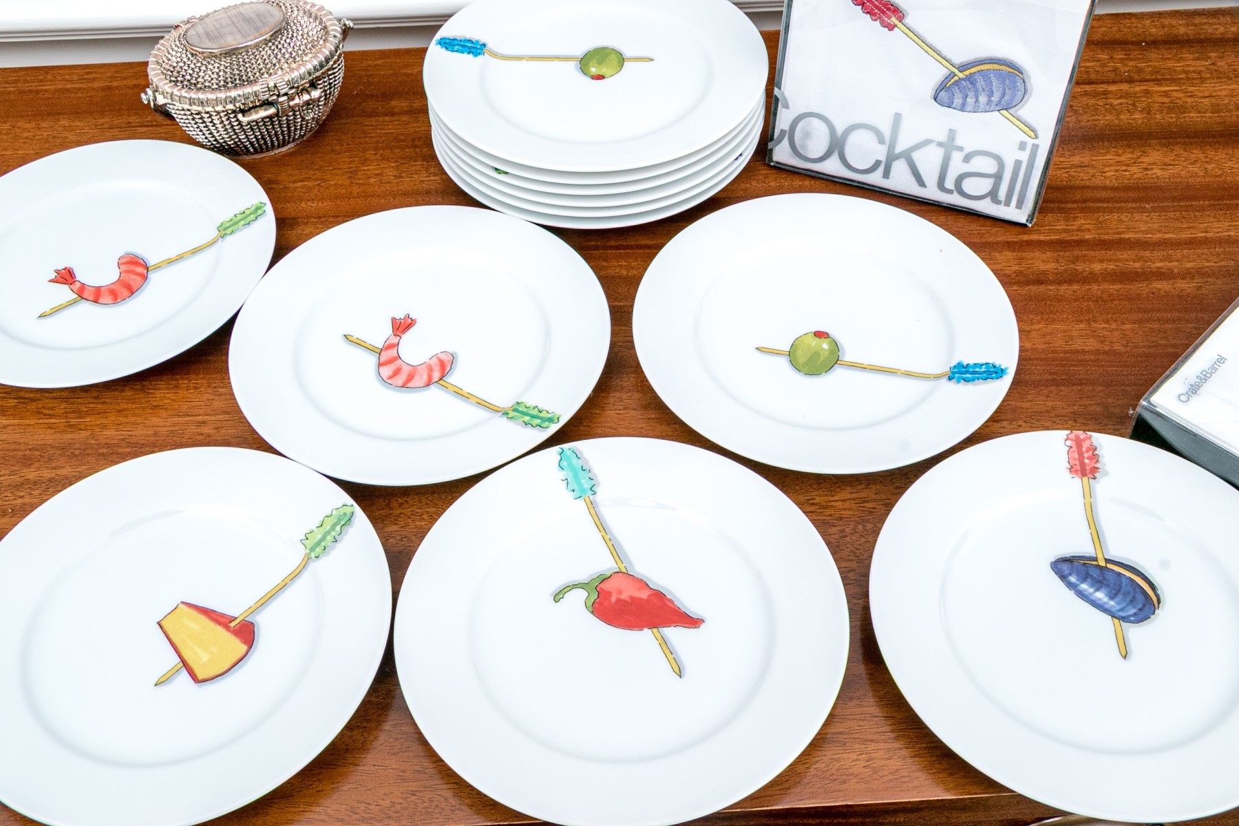 A fabulous set of twelve Nancy Green Crate & Barrel "Tidbits" ceramic cocktail plates along with two unopened boxes of cocktail napkins, all decorated with fun motifs of horderves on colorful toothpicks.