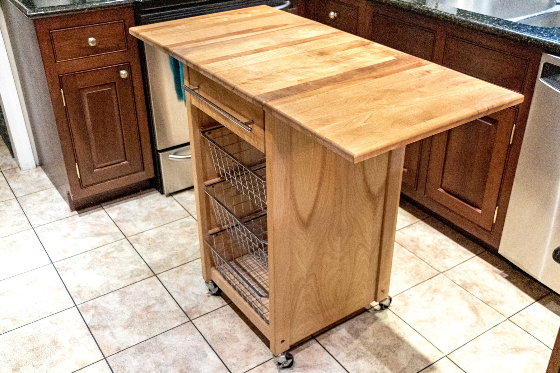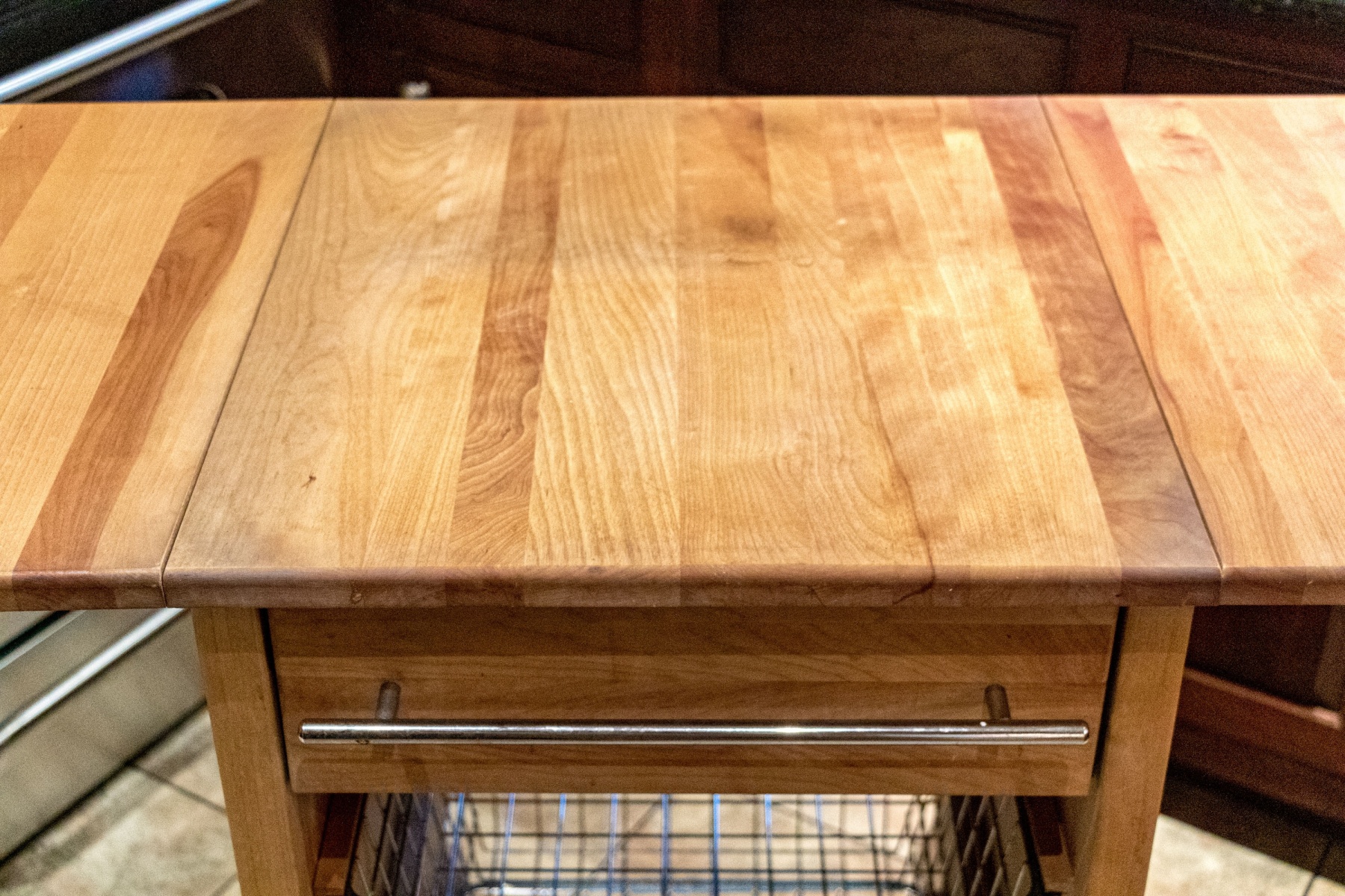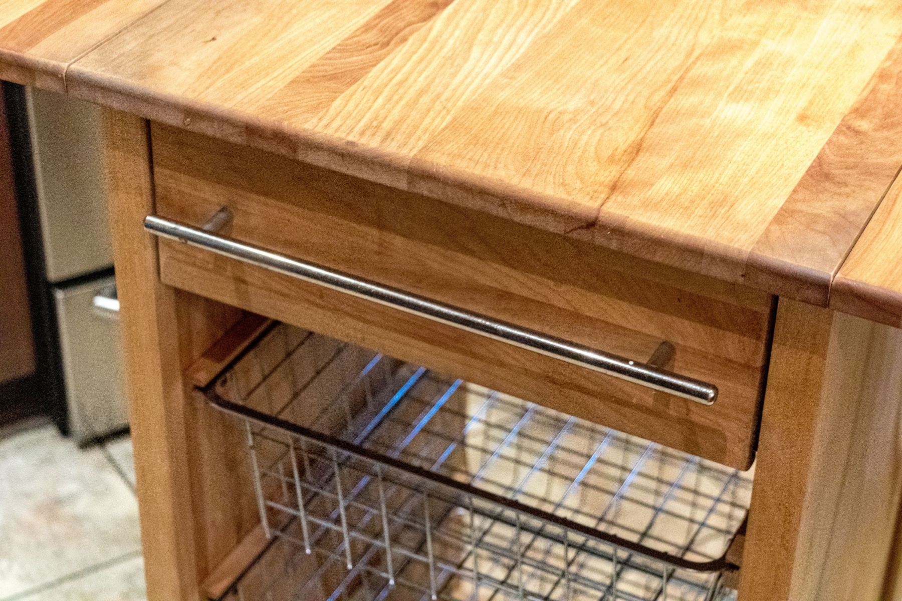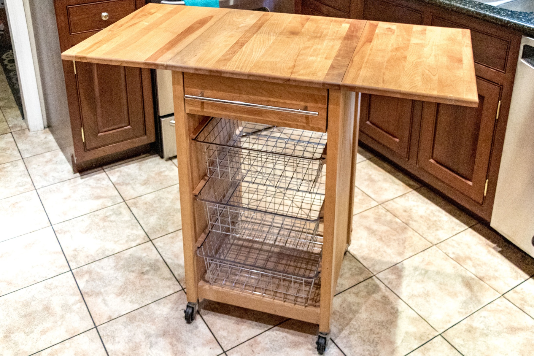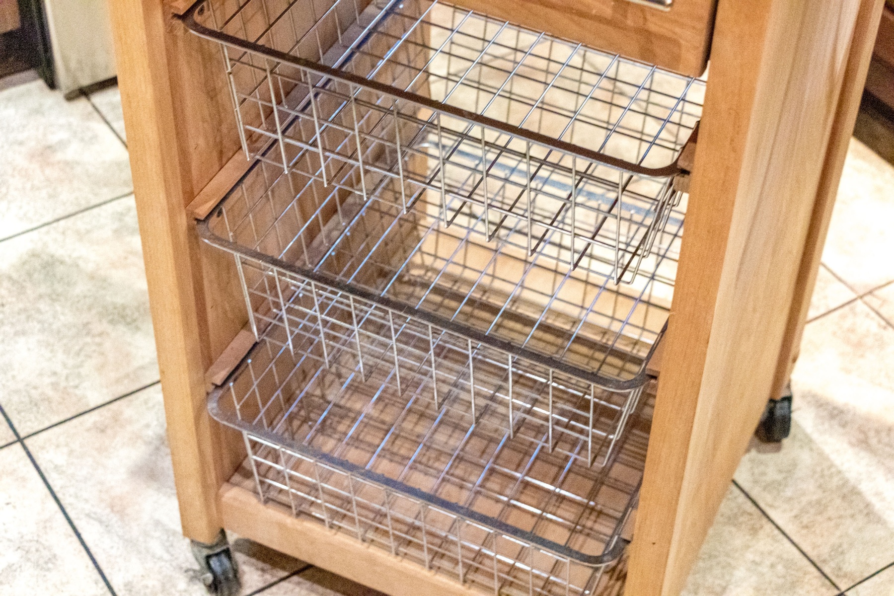 A handy Crate & Barrel mobile kitchen island raised on four large industrial casters with three metal wire baskets that can slide out for use with single drawer with butcher block style top and two hinged wings for additional cutting board space.