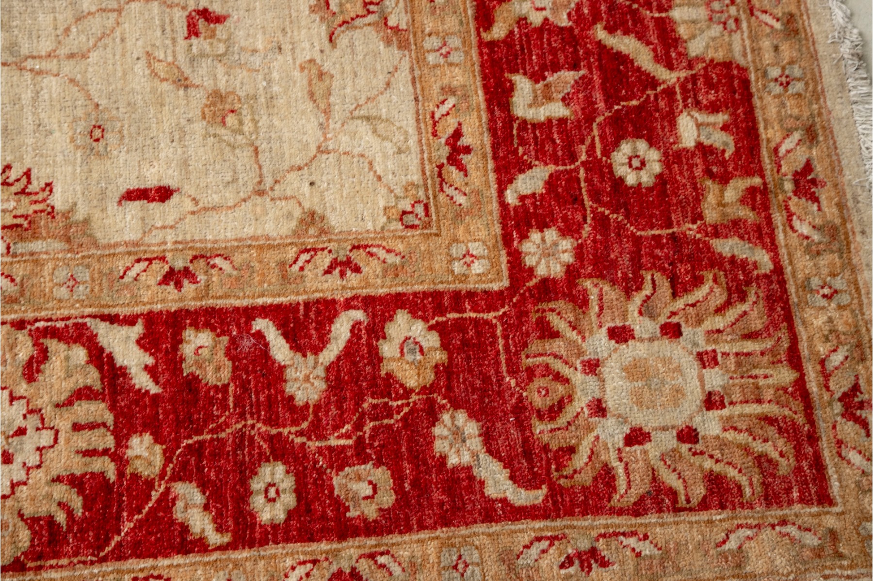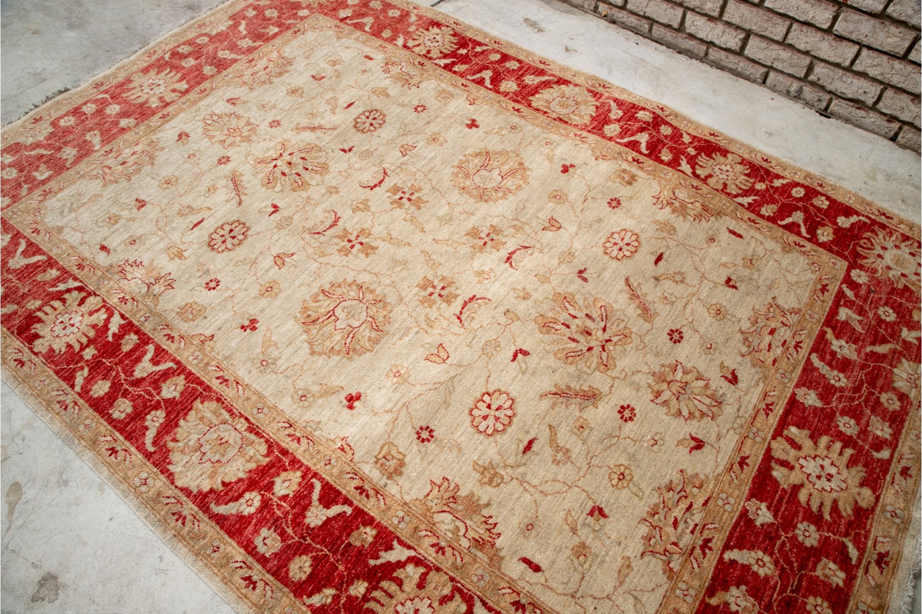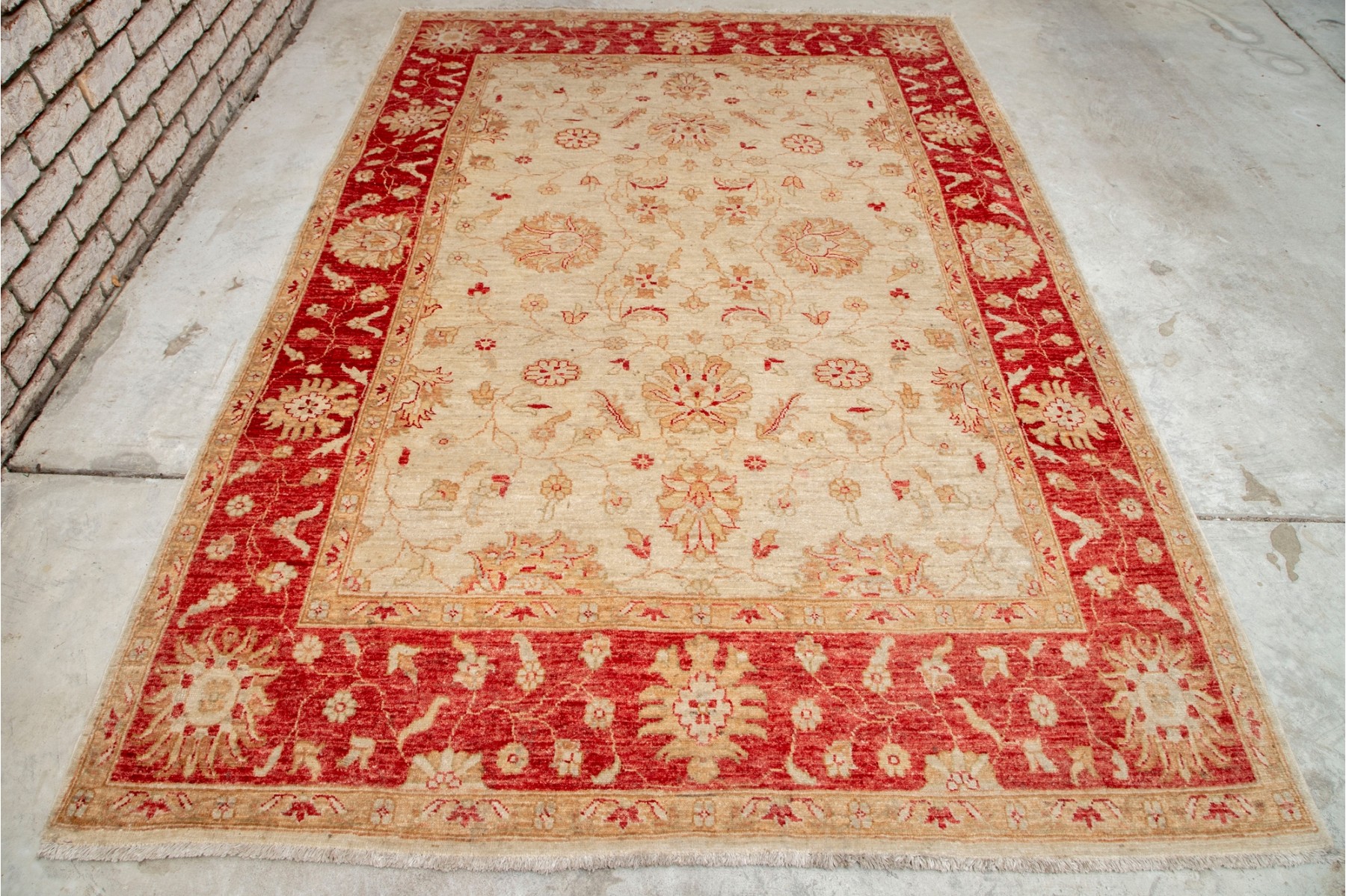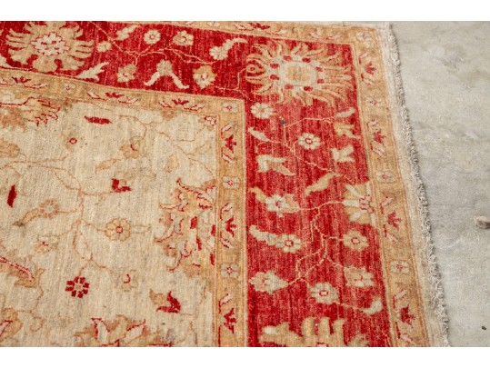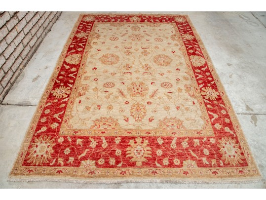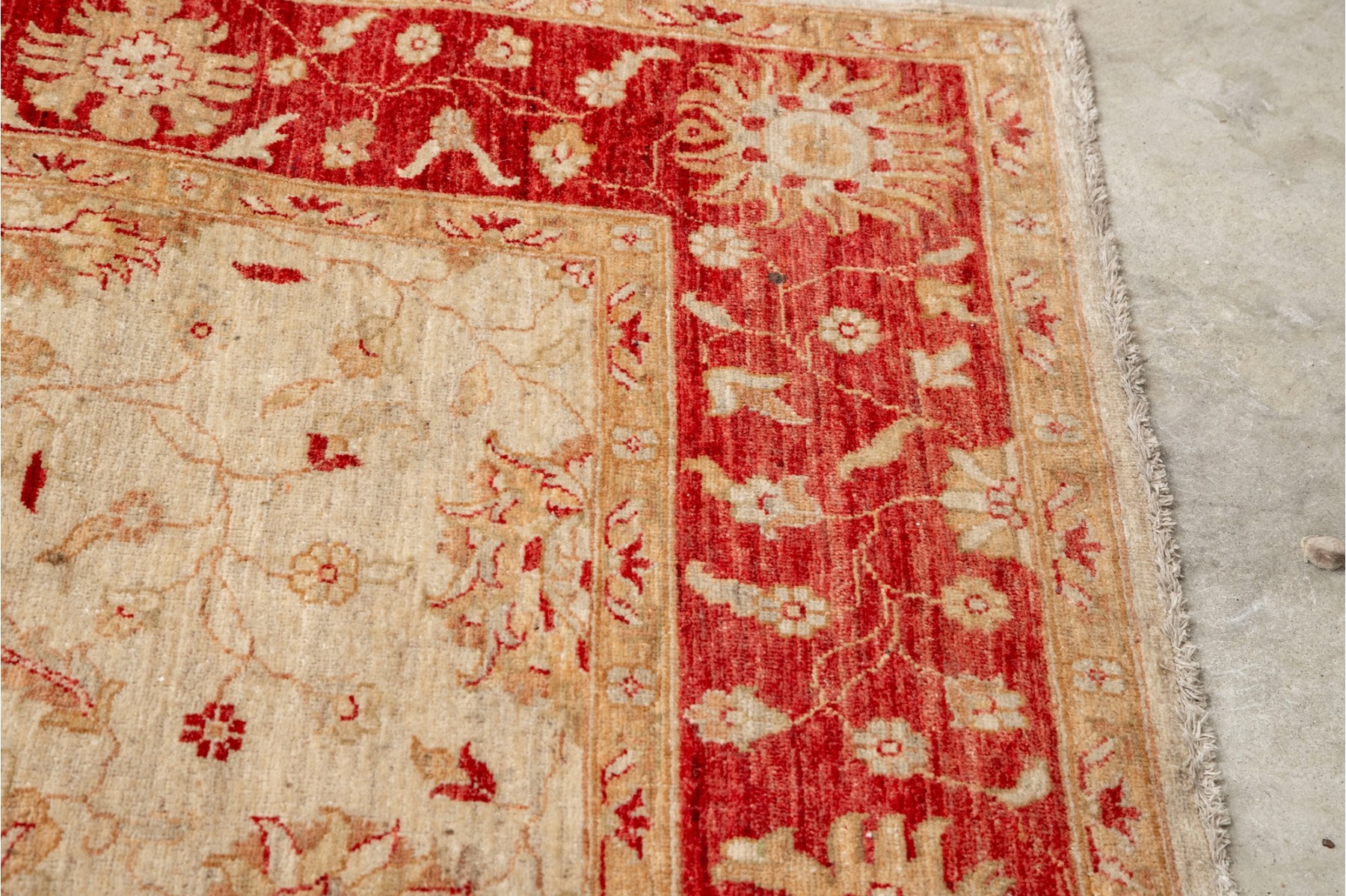This exquisite cream & brick red wool Oushak Rug (7'11" x 5'6") blends a soft cream field with a beautifully framed brick red border, creating a striking contrast complimented by floral and geometric motifs throughout.