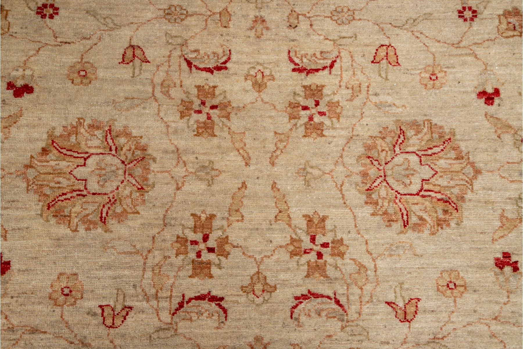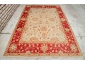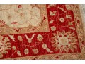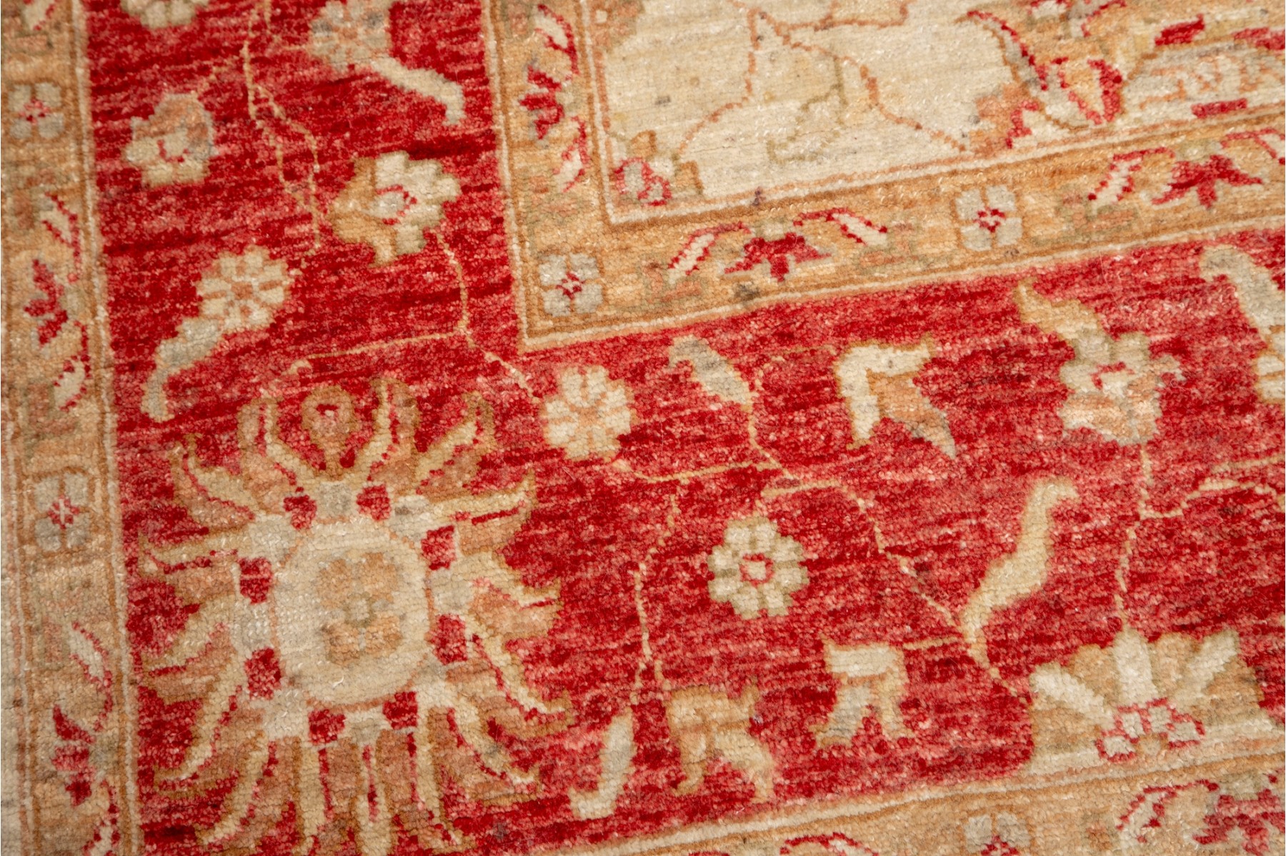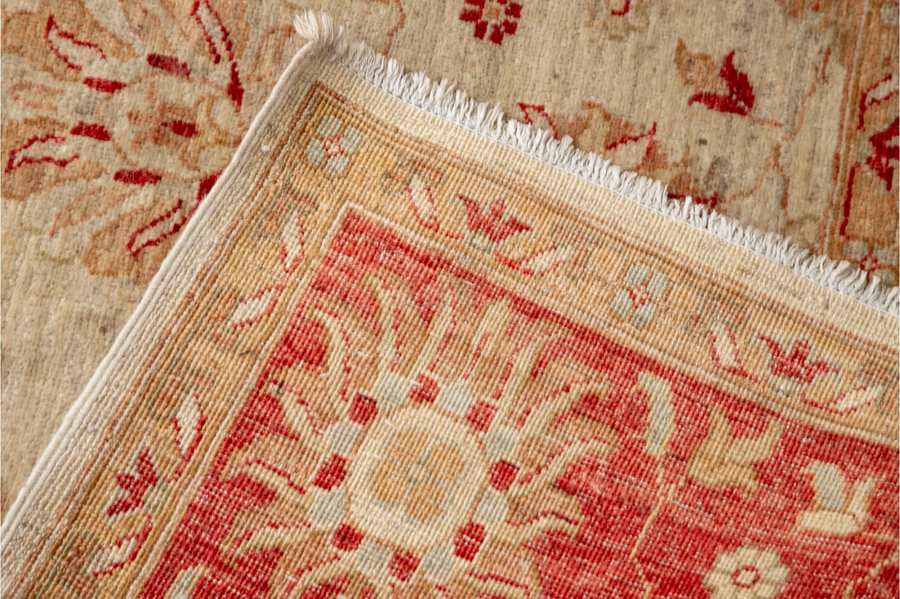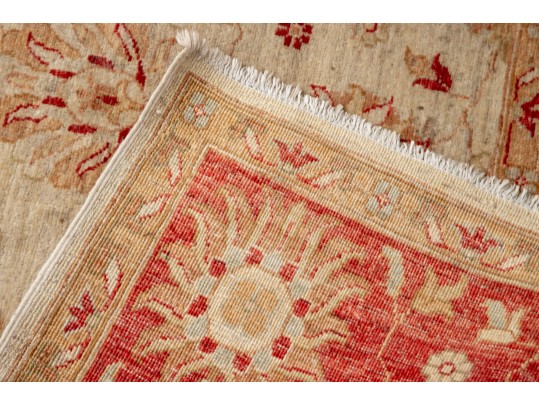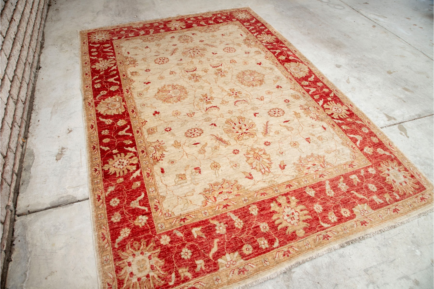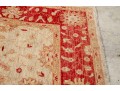 This exquisite cream & brick red wool Oushak Rug (7'11" x 5'6") blends a soft cream field with a beautifully framed brick red border, creating a striking contrast complimented by floral and geometric motifs throughout.