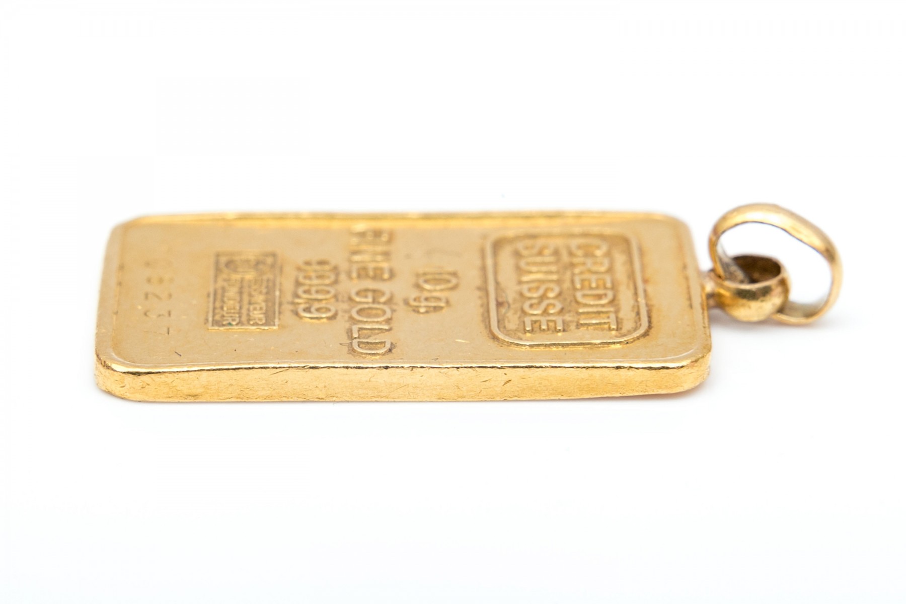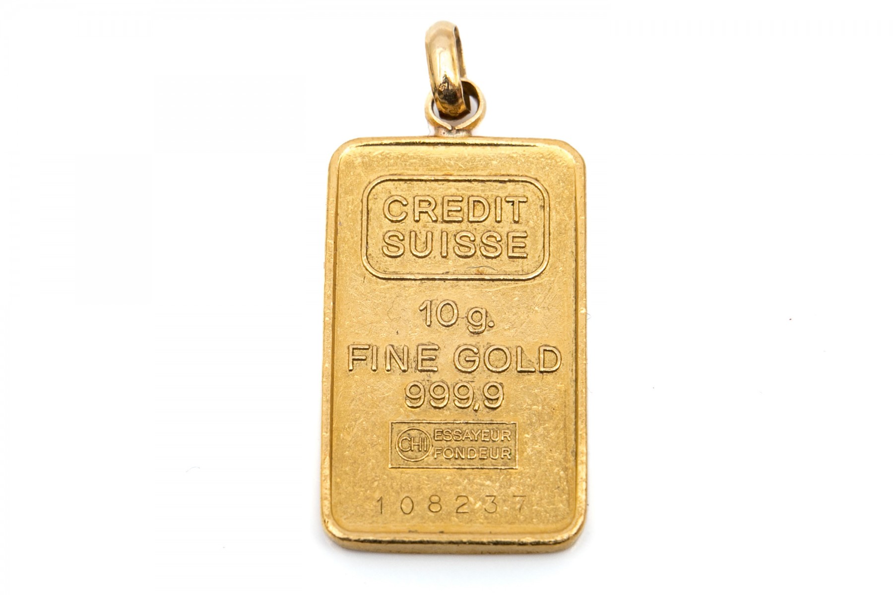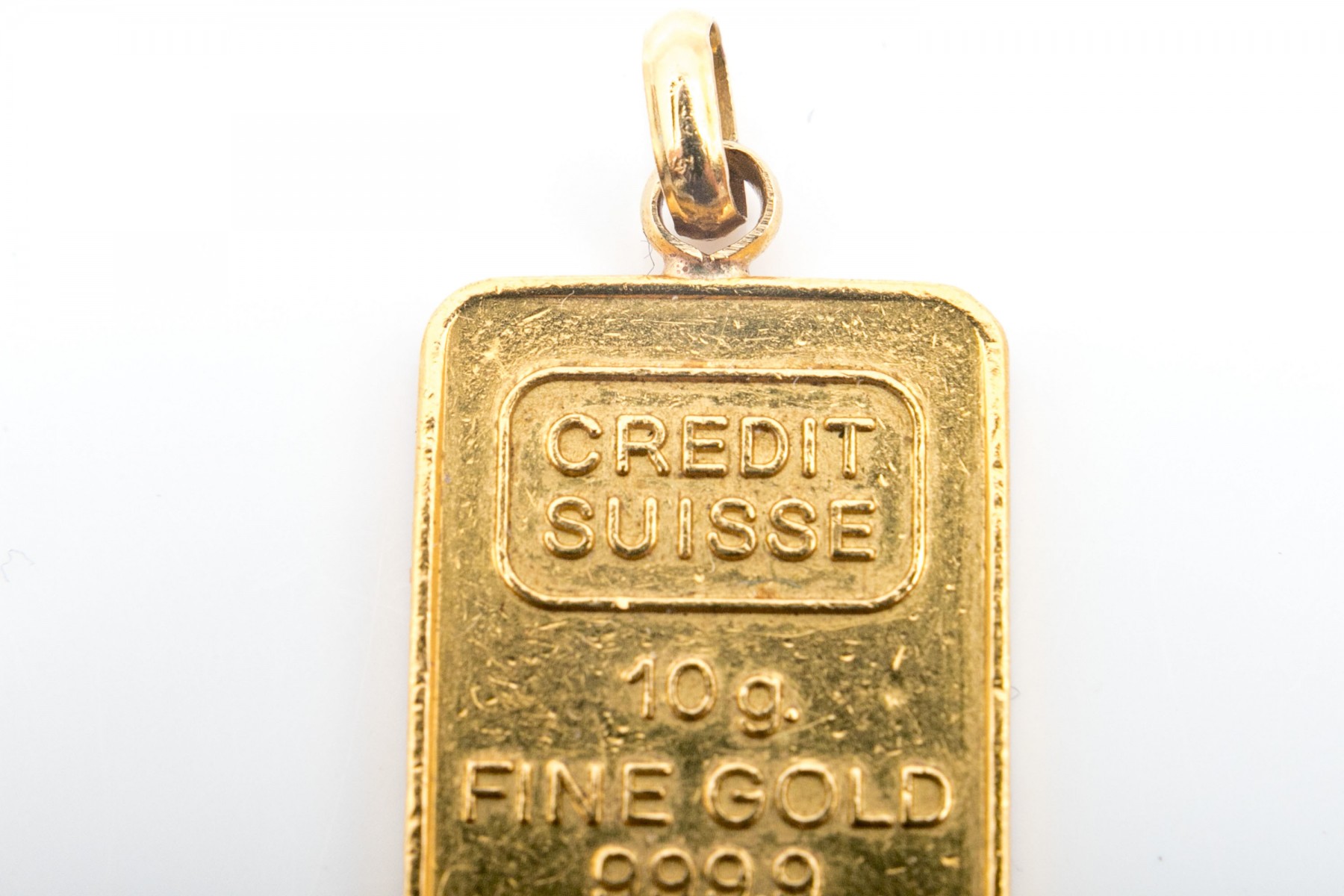 Credit Suisse 10g Fine Gold 999,9 CHI Essayeur Foundeur bullion as a pendant on an oval bail.