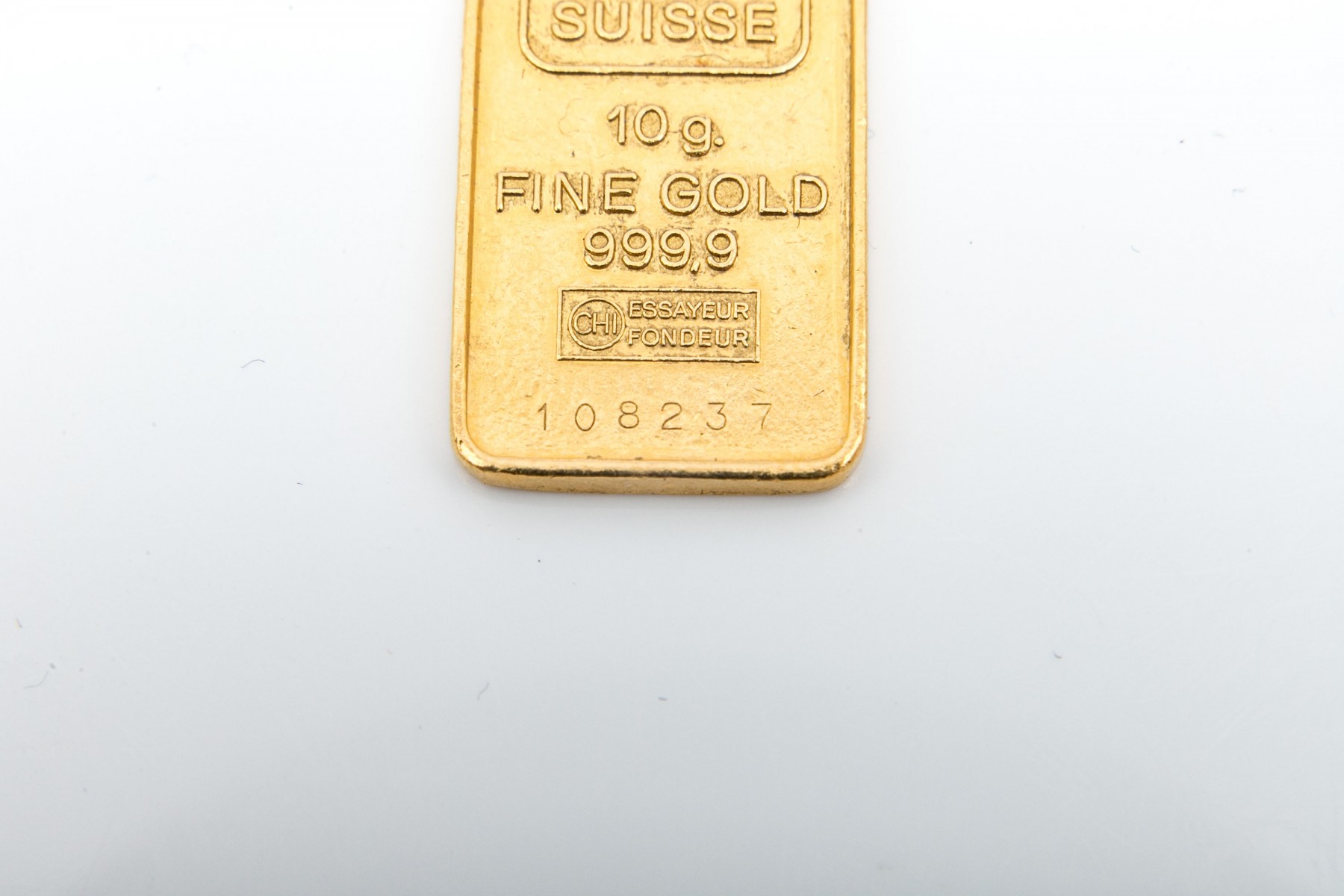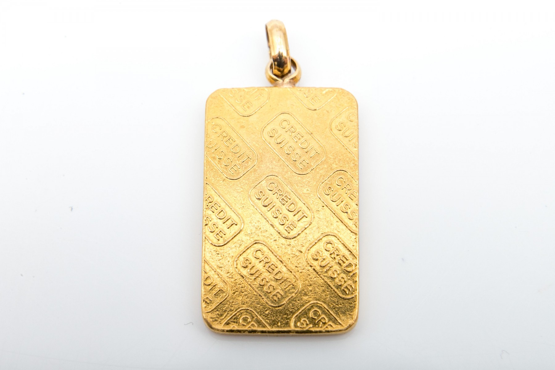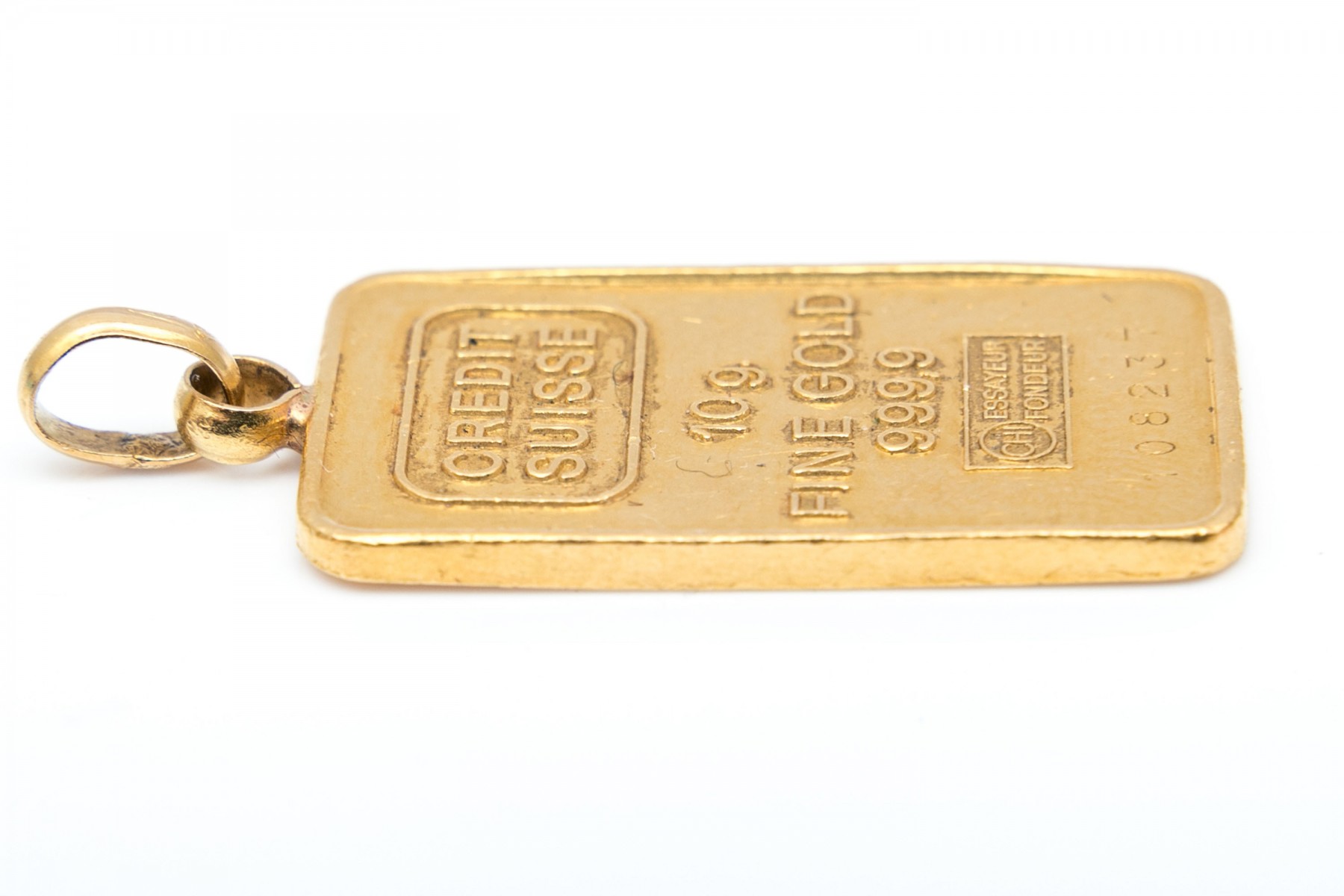 Credit Suisse 10g Fine Gold 999,9 CHI Essayeur Foundeur bullion as a pendant on an oval bail.