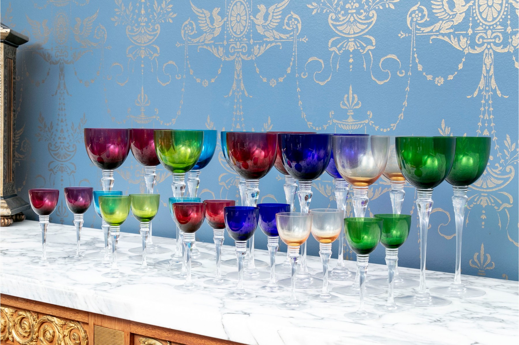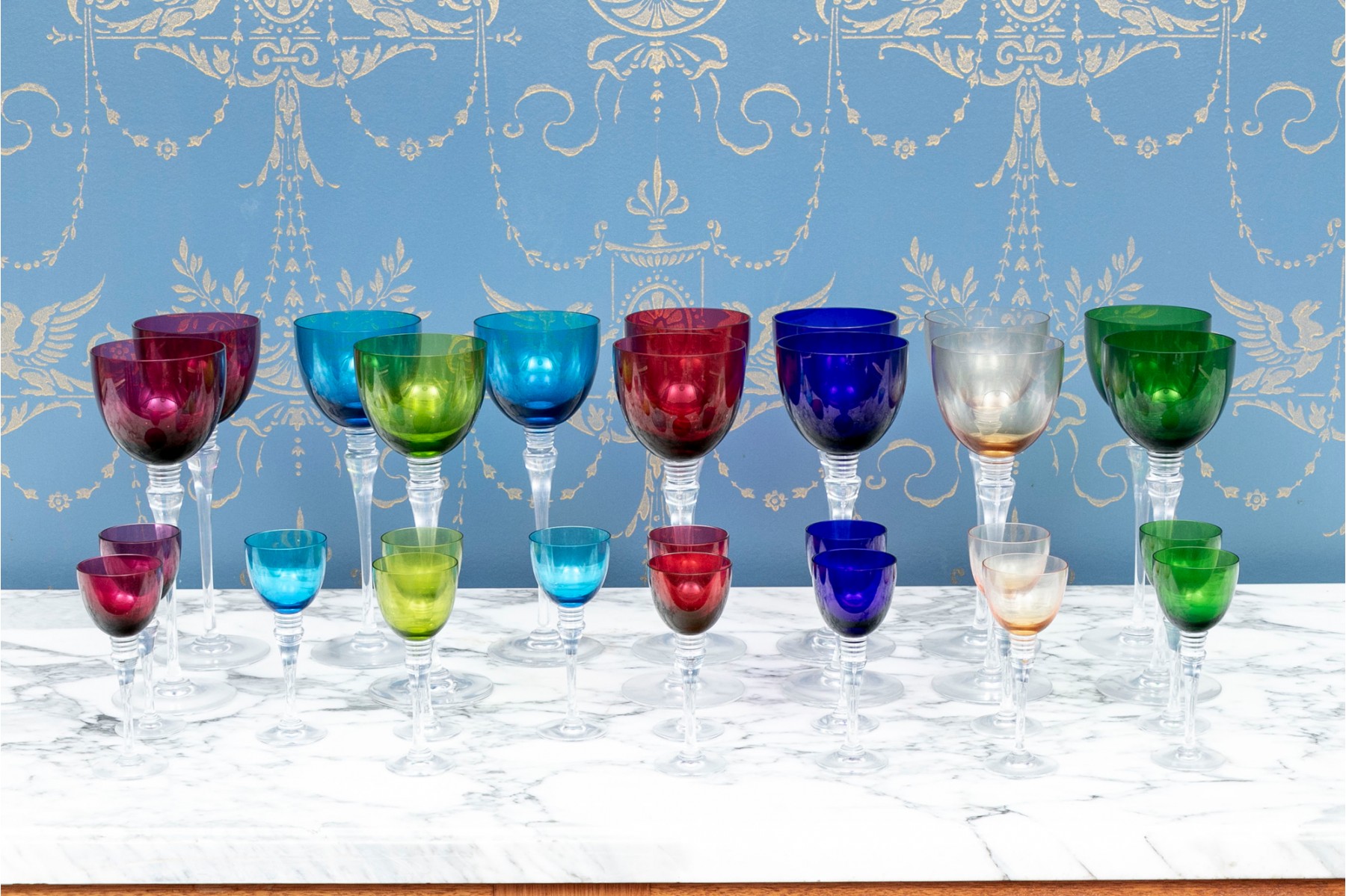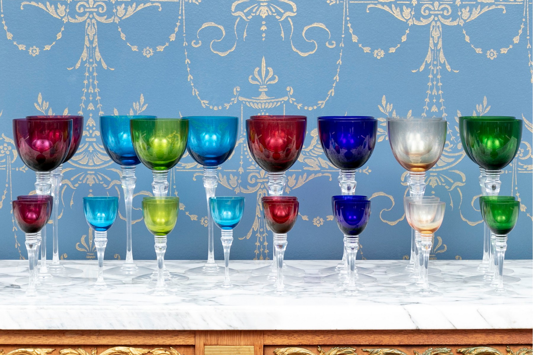 The Cristal St. Louis Grand Lieu stemware set includes 13 multi-colored wine glasses and 14 shooters, offering a vibrant and elegant collection for various occasions.