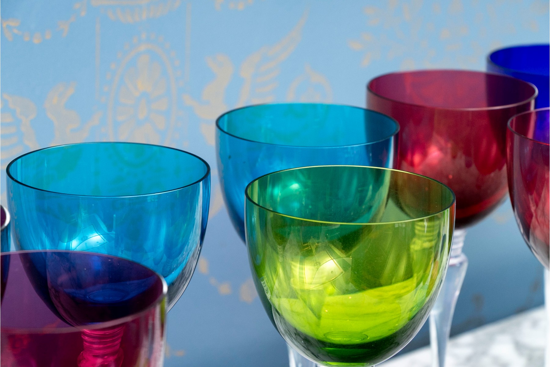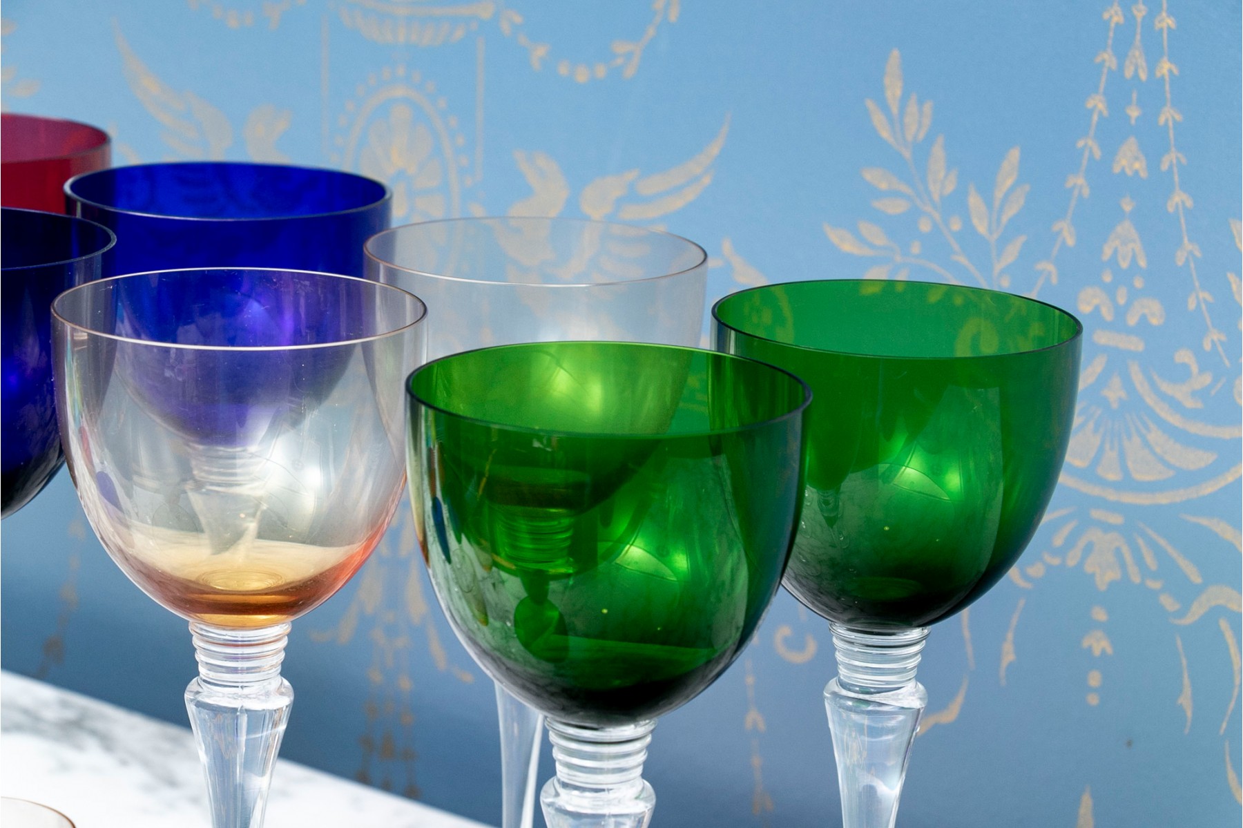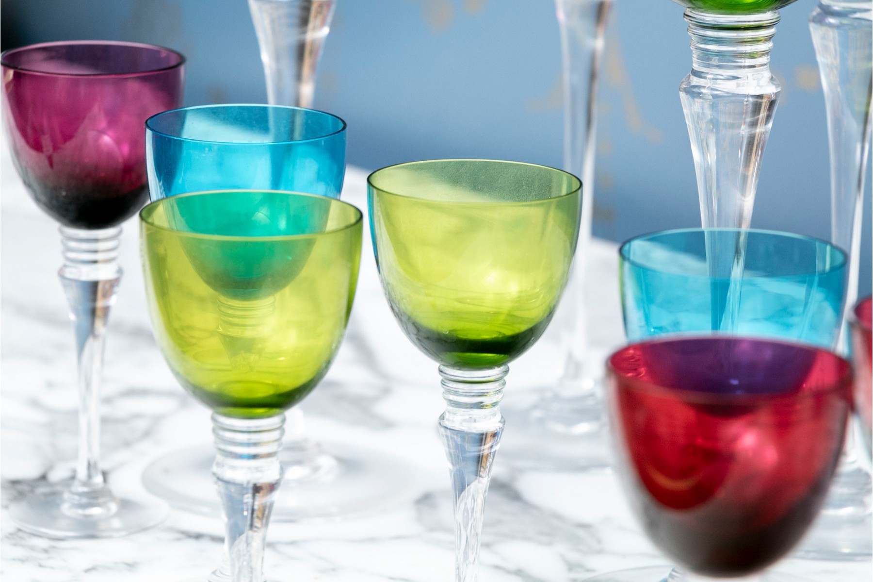The Cristal St. Louis Grand Lieu stemware set includes 13 multi-colored wine glasses and 14 shooters, offering a vibrant and elegant collection for various occasions.