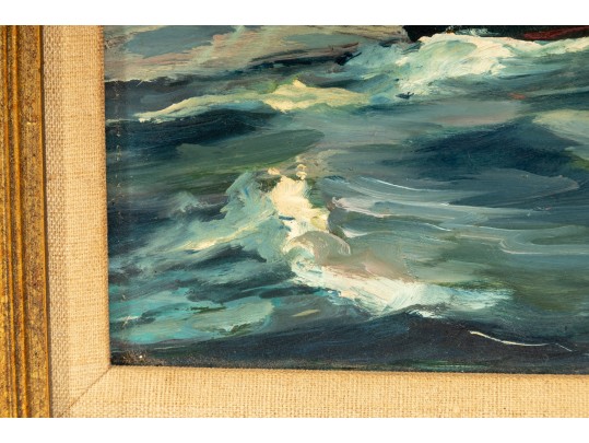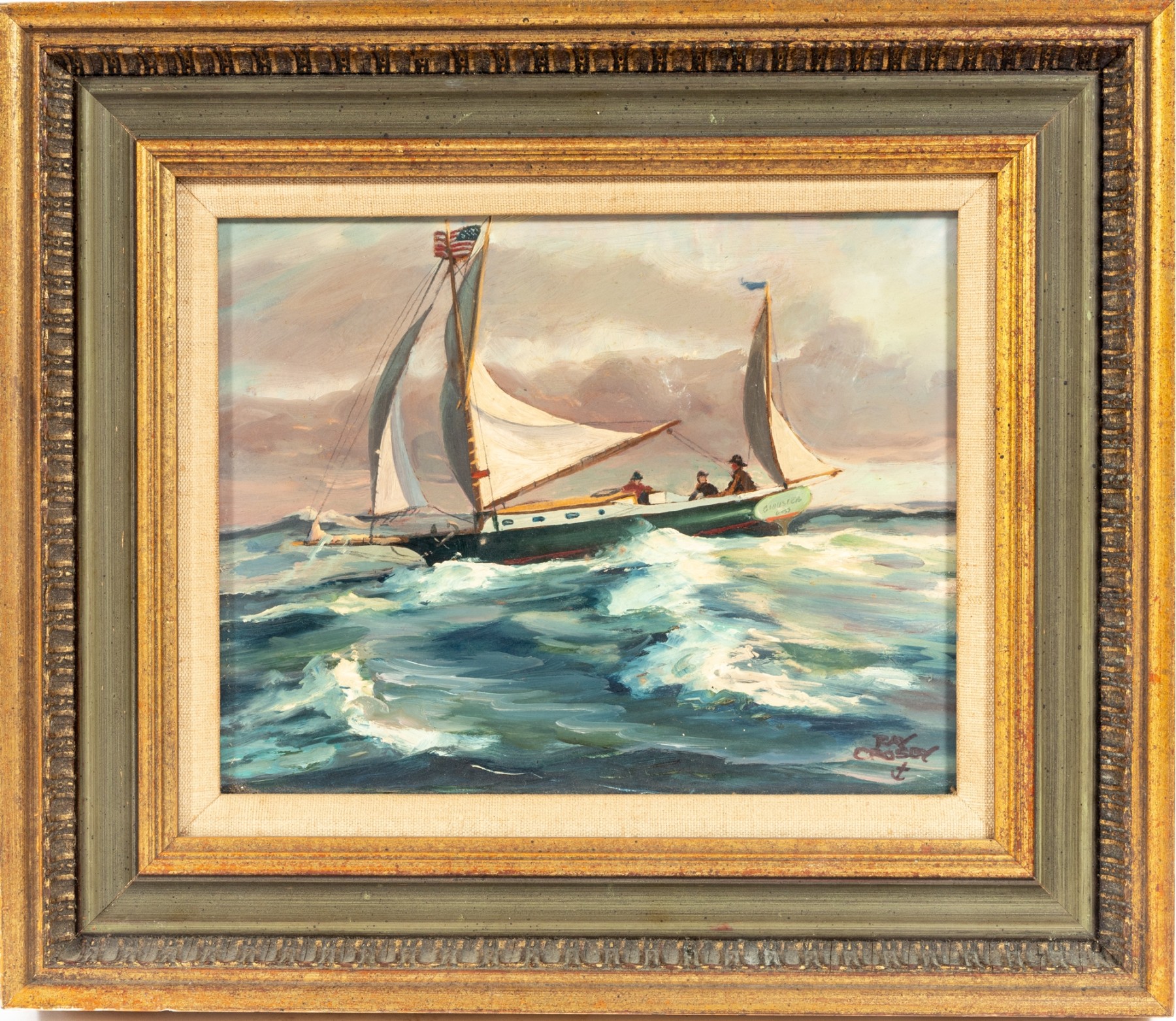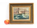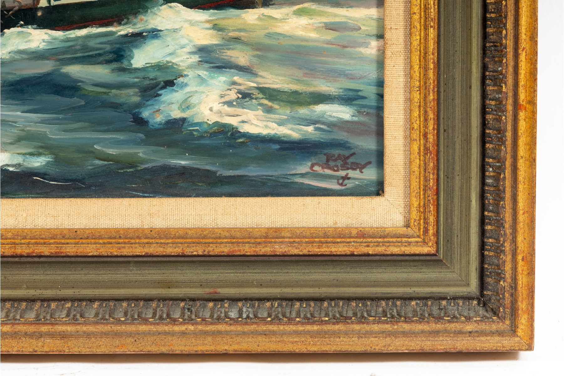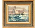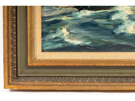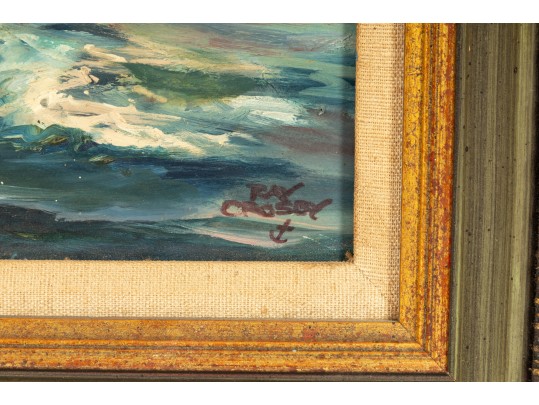 Original oil on board by Raymond Morrell Crosby (American, 20th Century), depicting a dynamic nautical scene with a sailboat navigating through crashing waves under a dramatic sky. The composition captures the tension and energy of the open sea, rendered in rich, textured brushstrokes. The artwork is signed bottom right, and presented openly within a gold-tone frame.