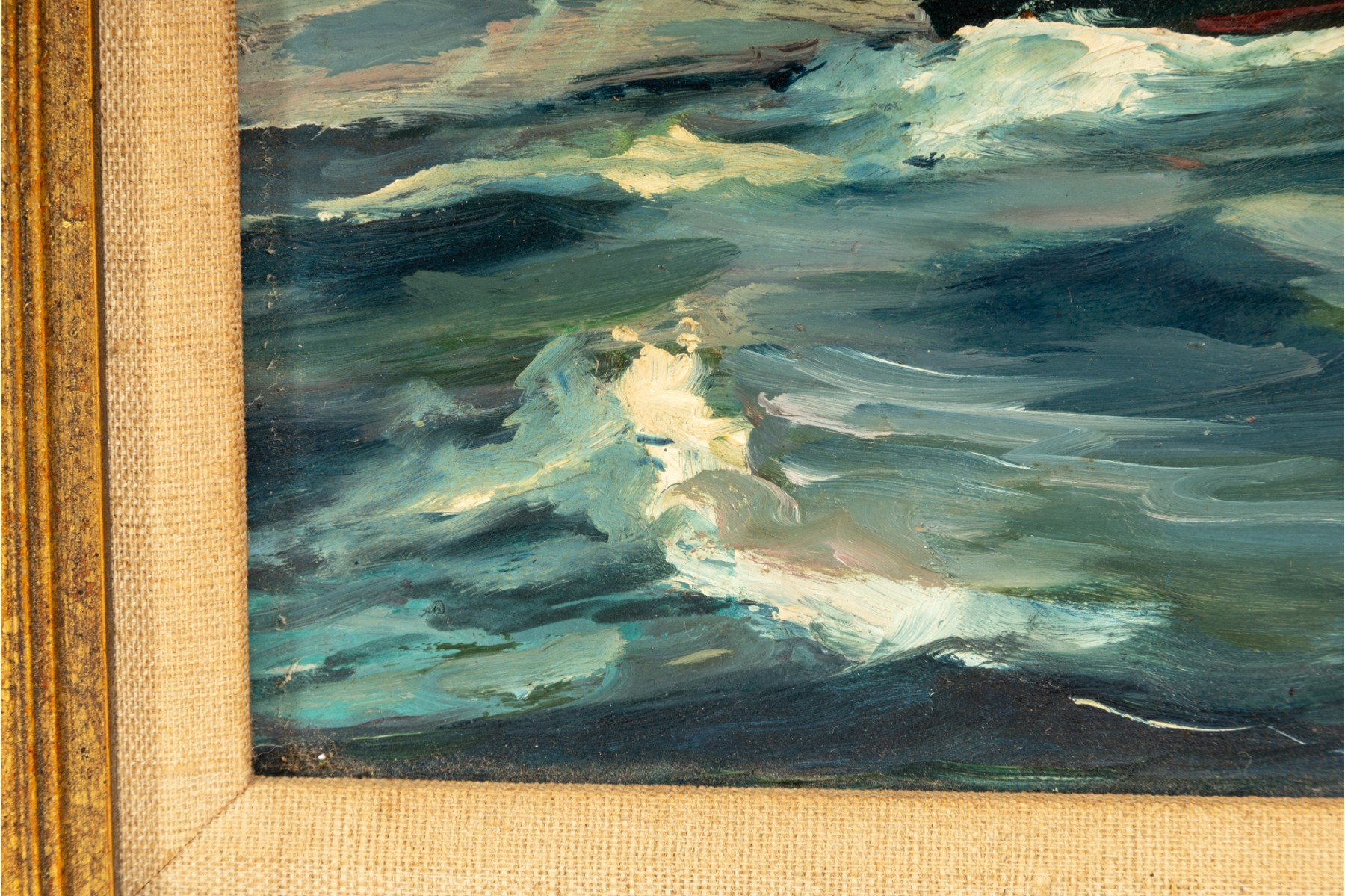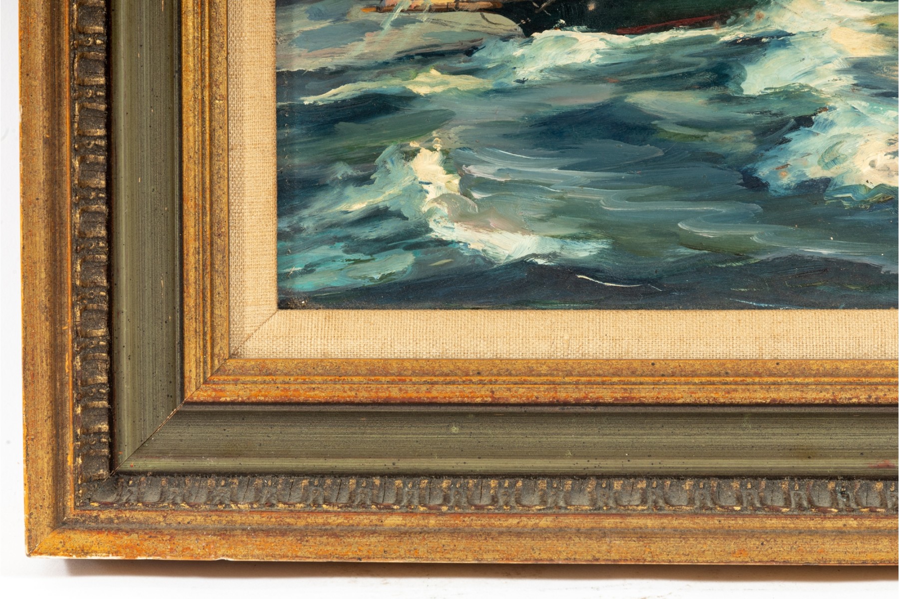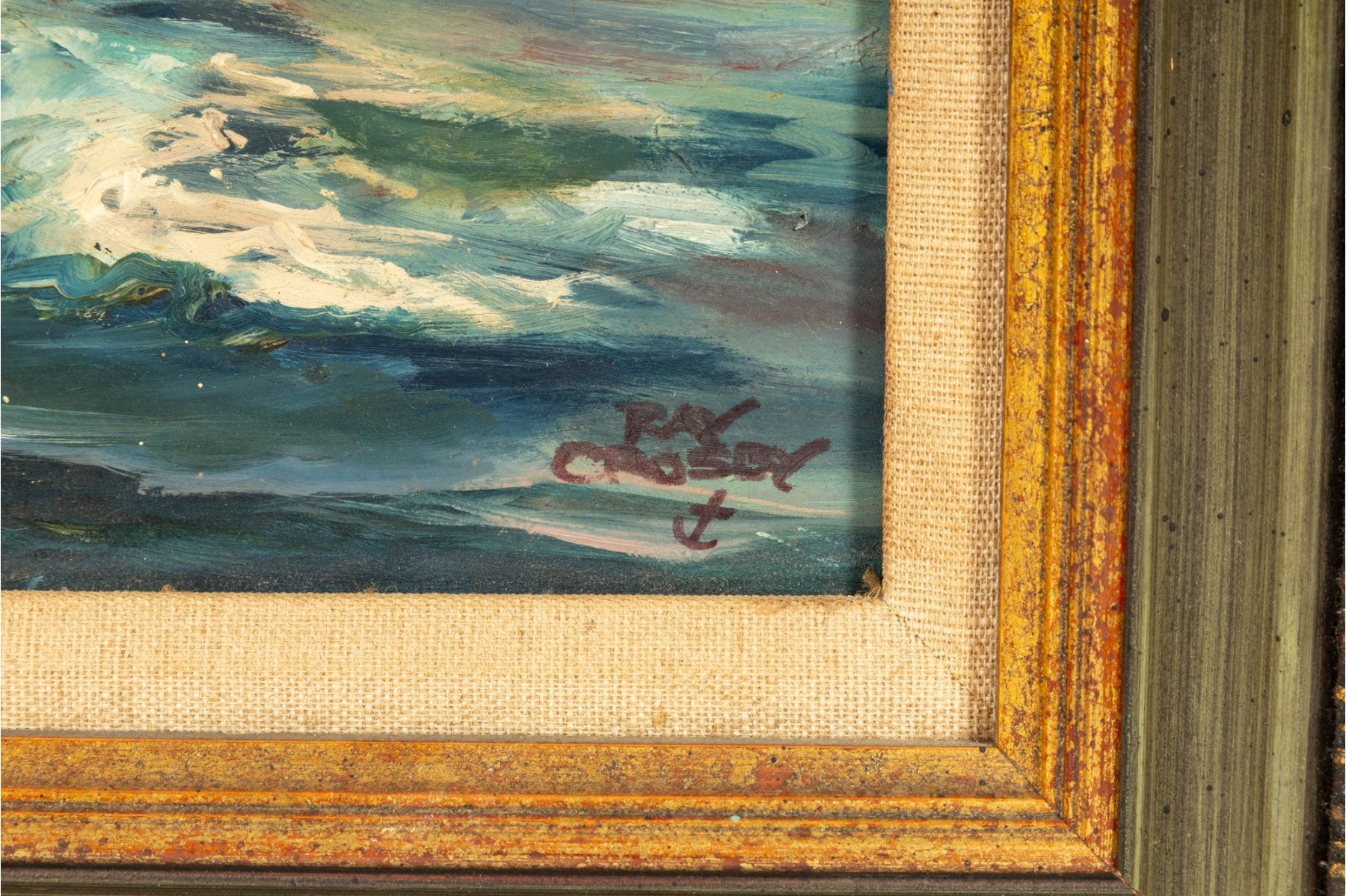 Original oil on board by Raymond Morrell Crosby (American, 20th Century), depicting a dynamic nautical scene with a sailboat navigating through crashing waves under a dramatic sky. The composition captures the tension and energy of the open sea, rendered in rich, textured brushstrokes. The artwork is signed bottom right, and presented openly within a gold-tone frame.