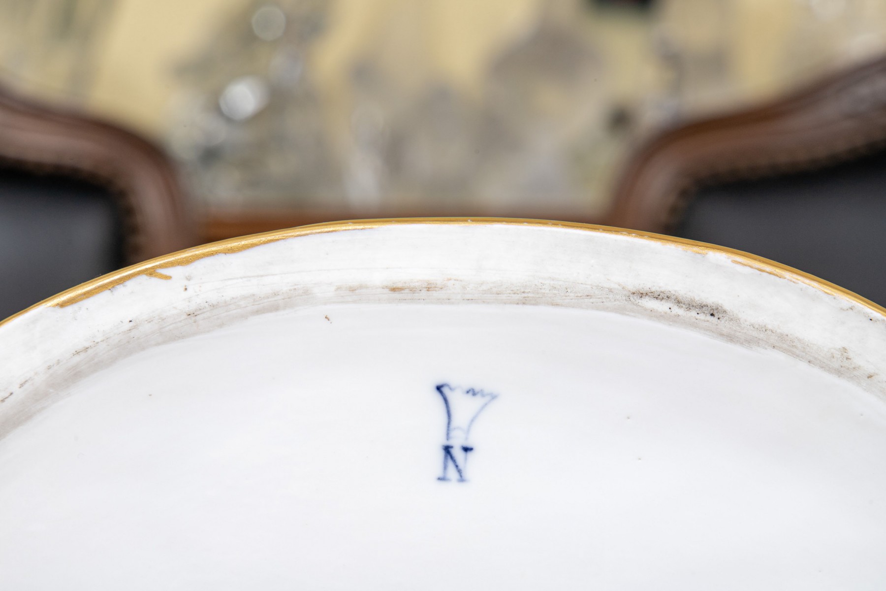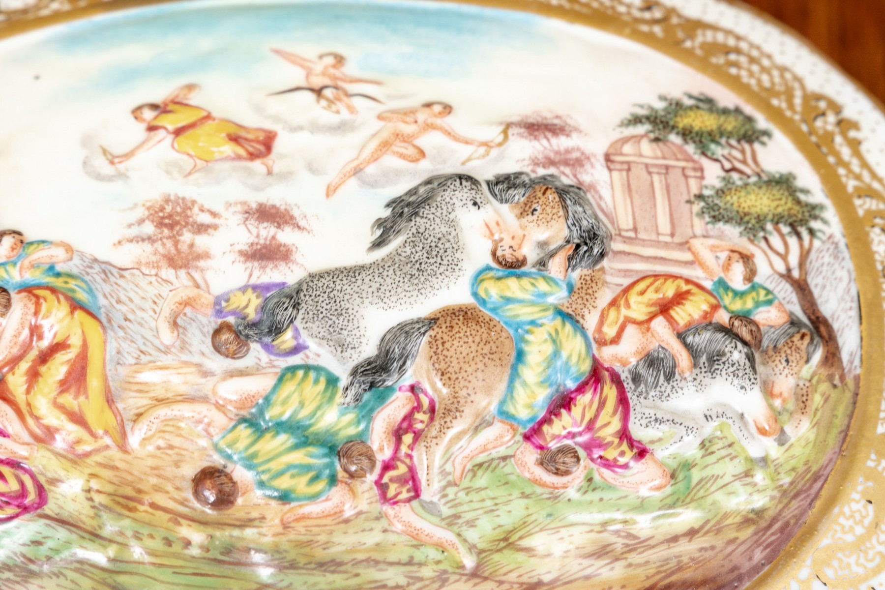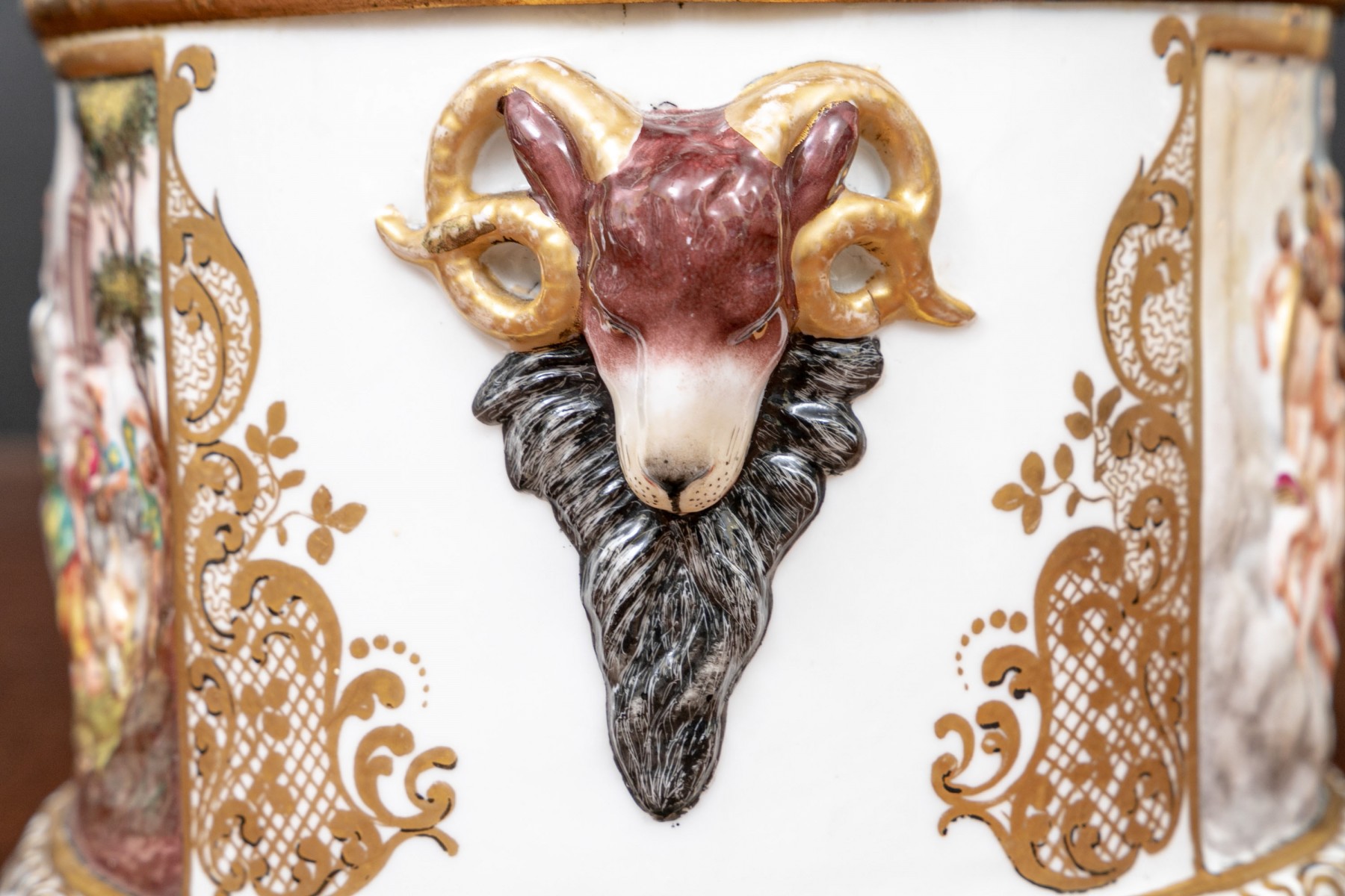 The body with mythological, figural reserves within gilt finished bands, flanked by ornate gilt scroll motif on white ground. The oval foot with gilt finished scroll motif all around.