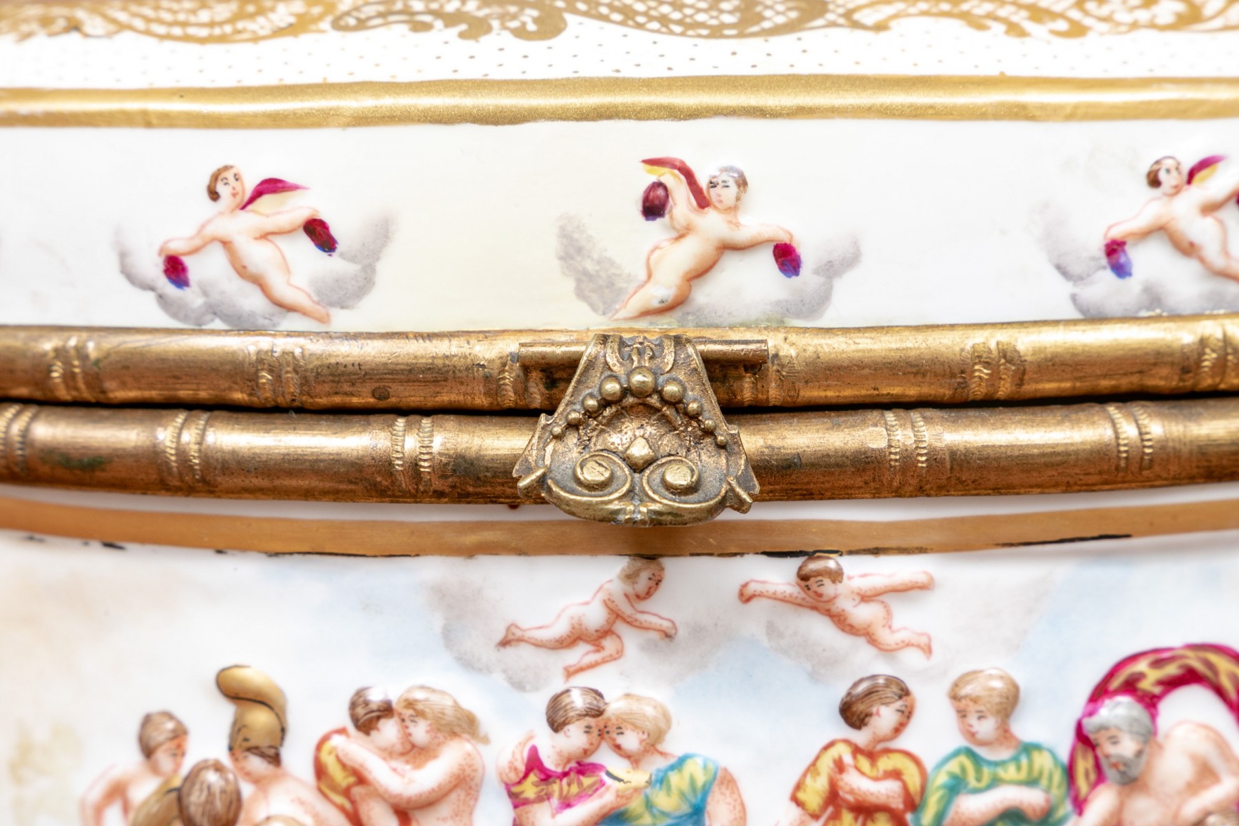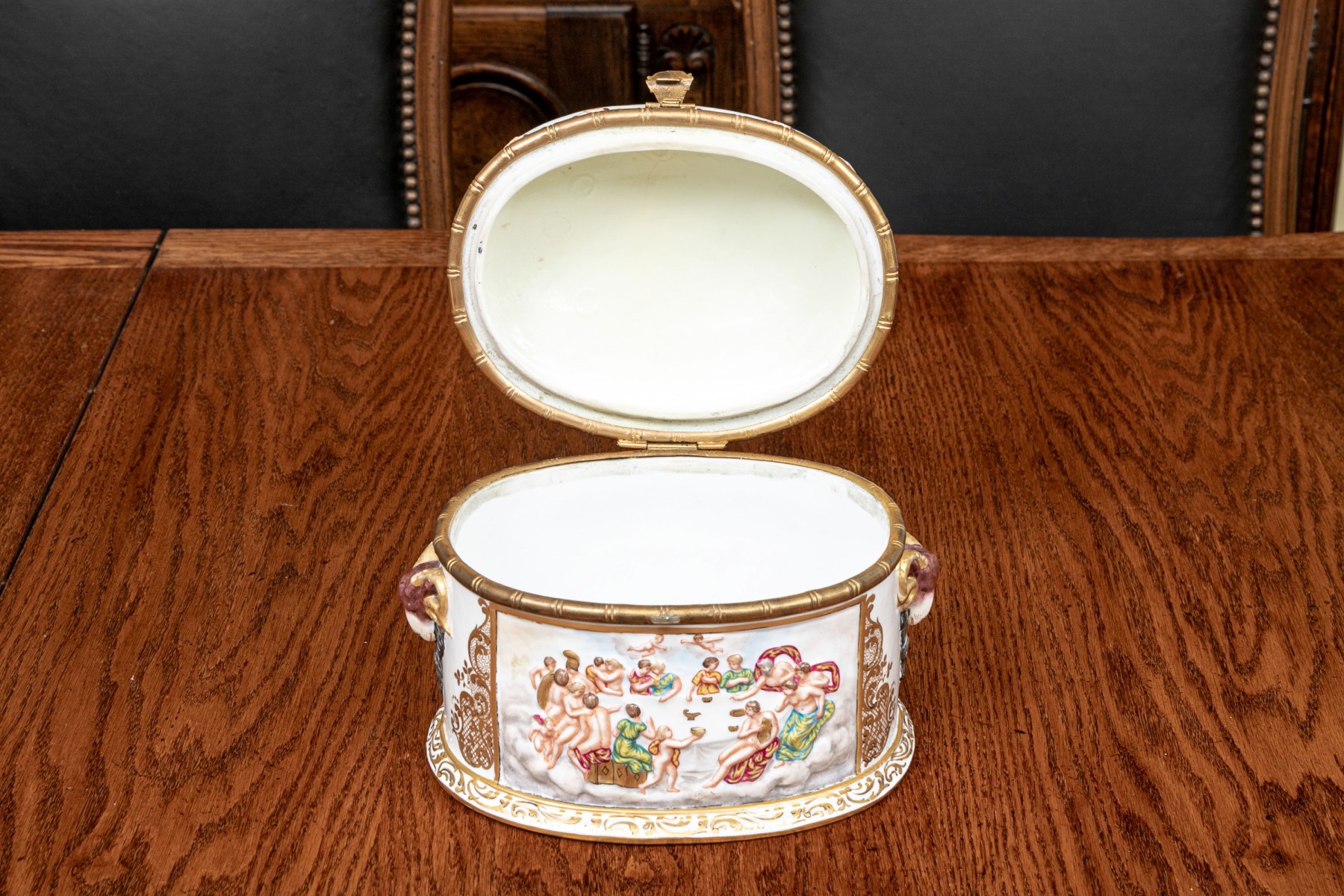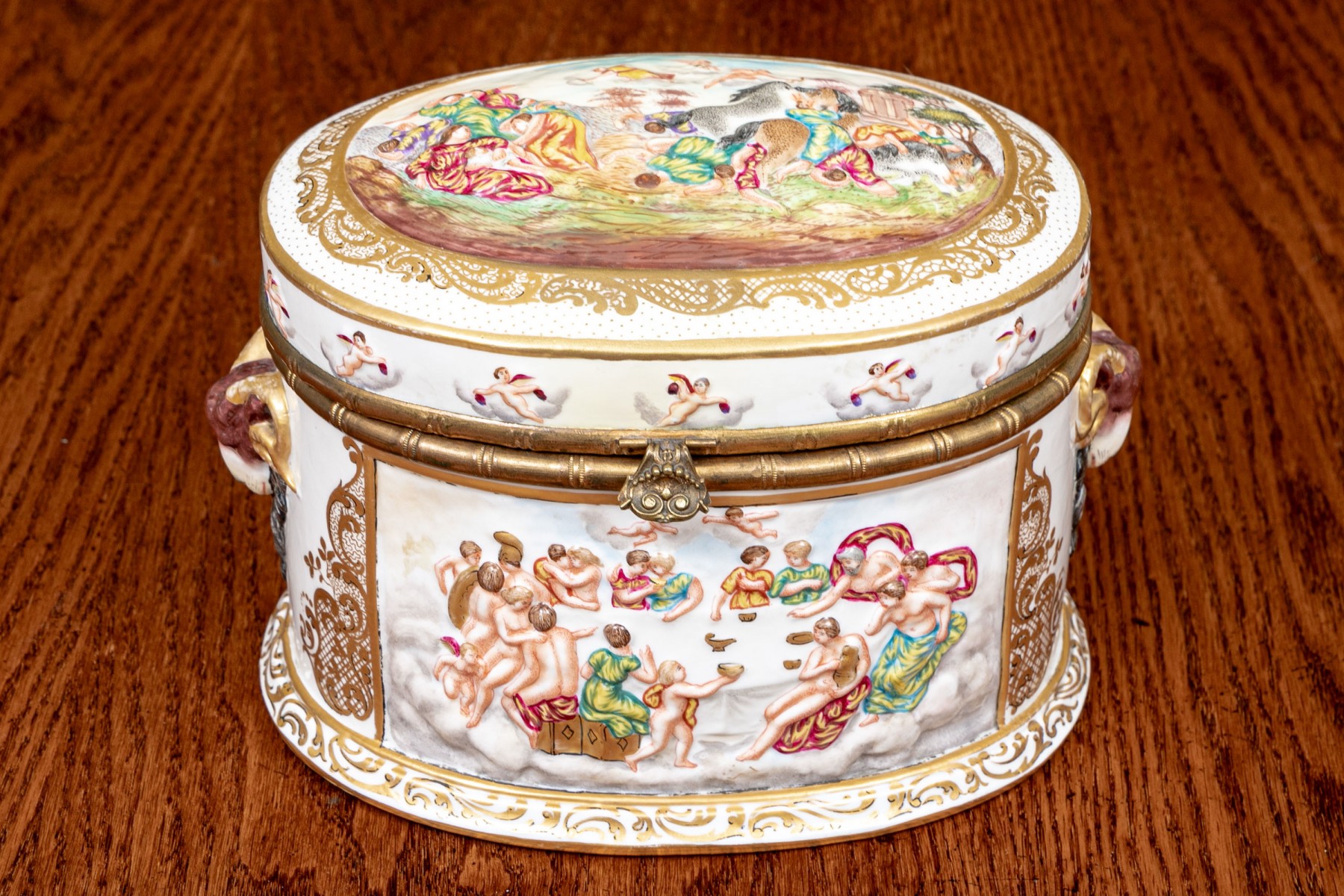 An impressive Crown Naples Capodimonte porcelain two handled box with hinged lid. The box mounted with gilt bronze around the mouth rim and lid rim, fitted with a cast close clasp.