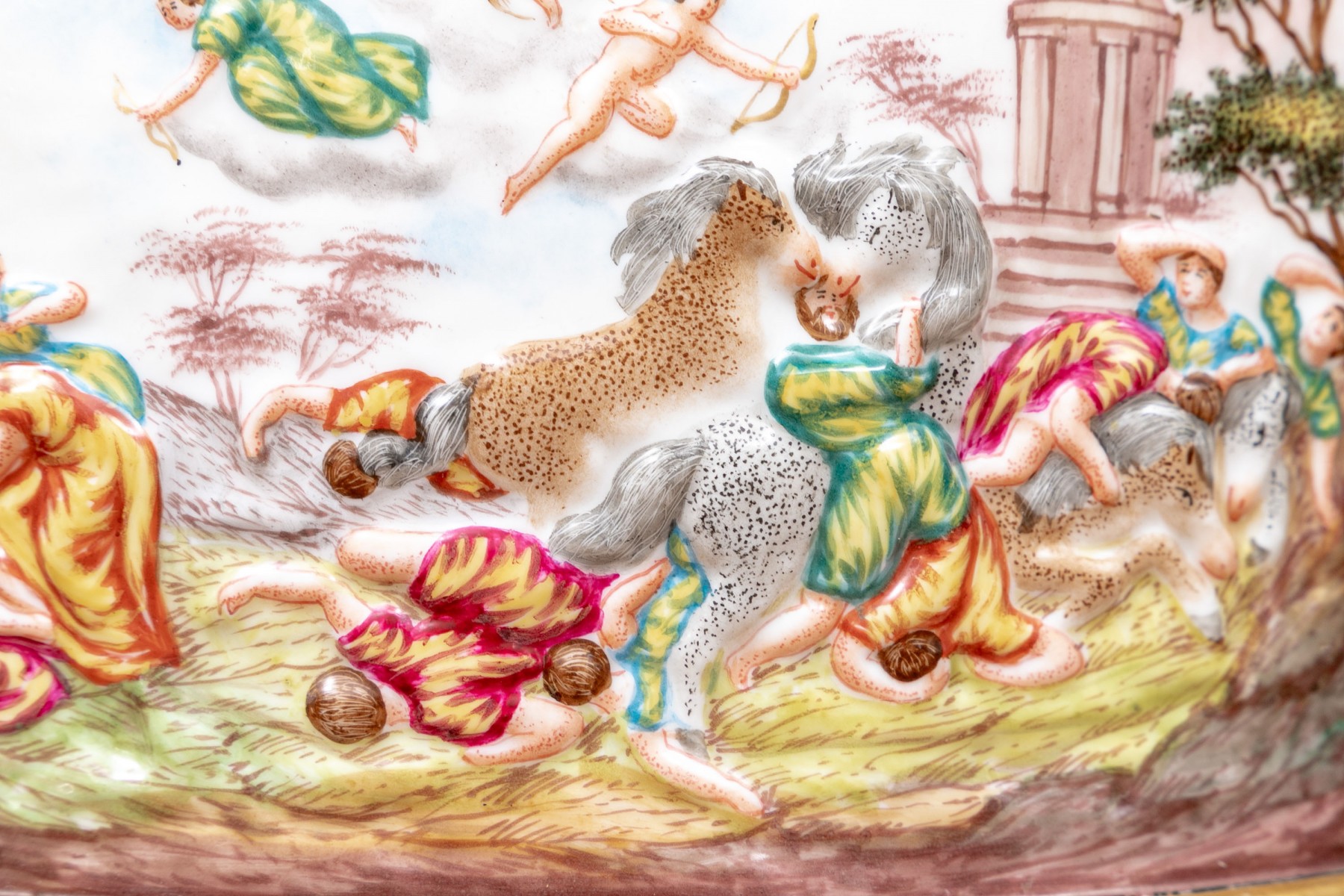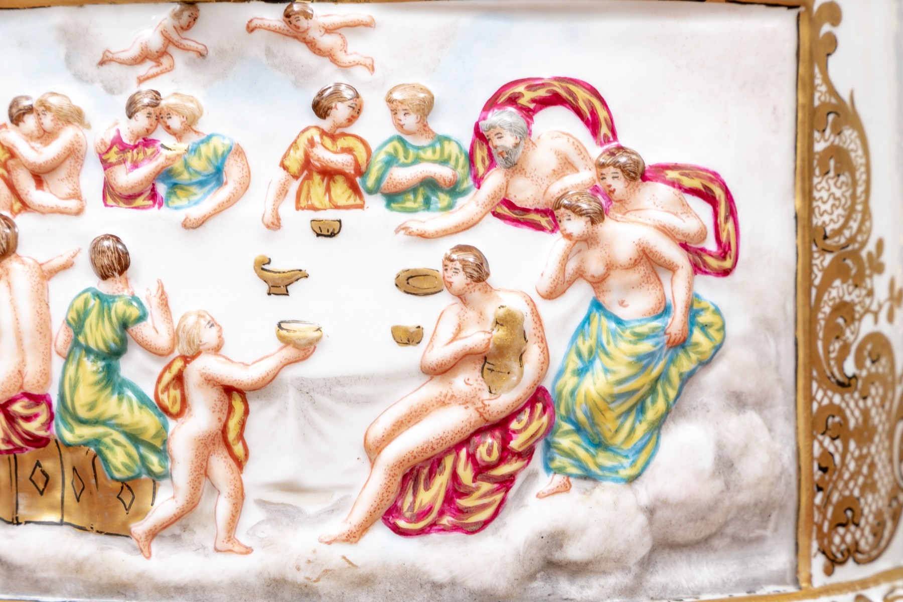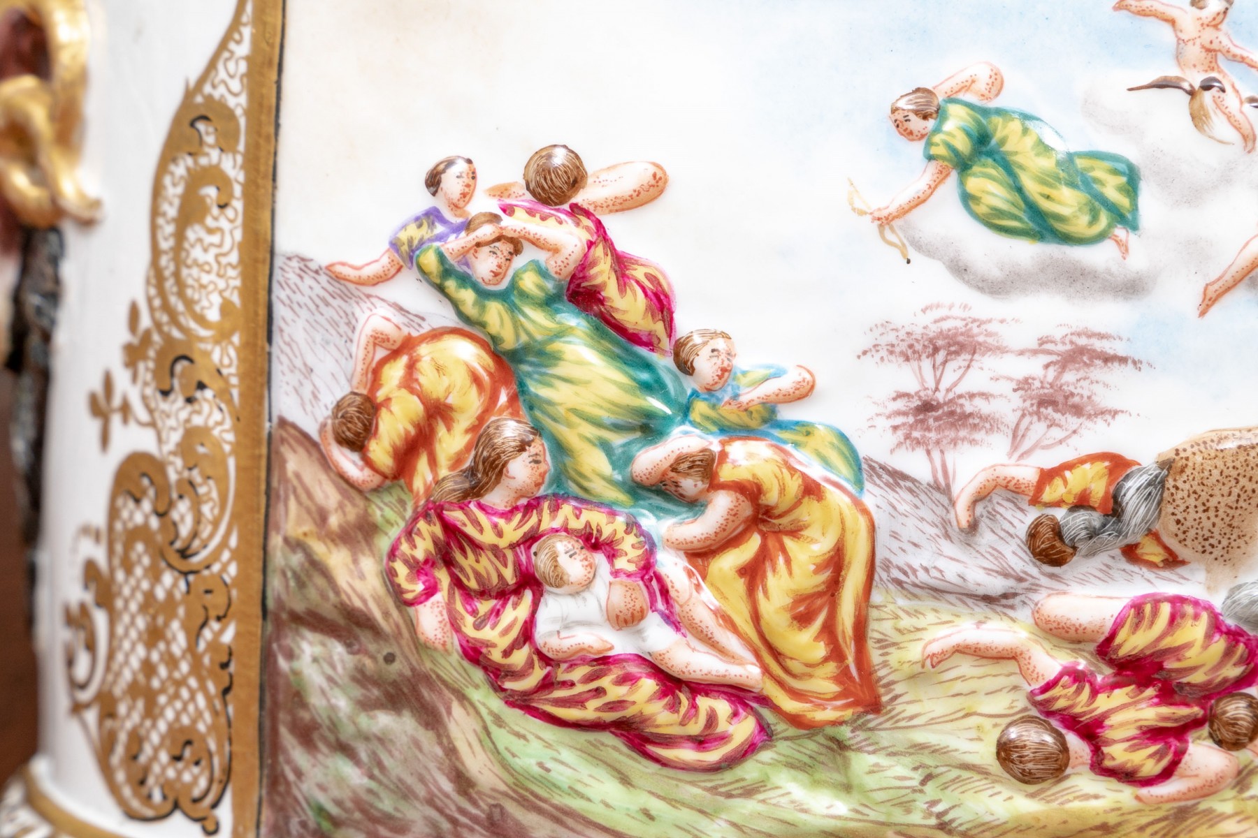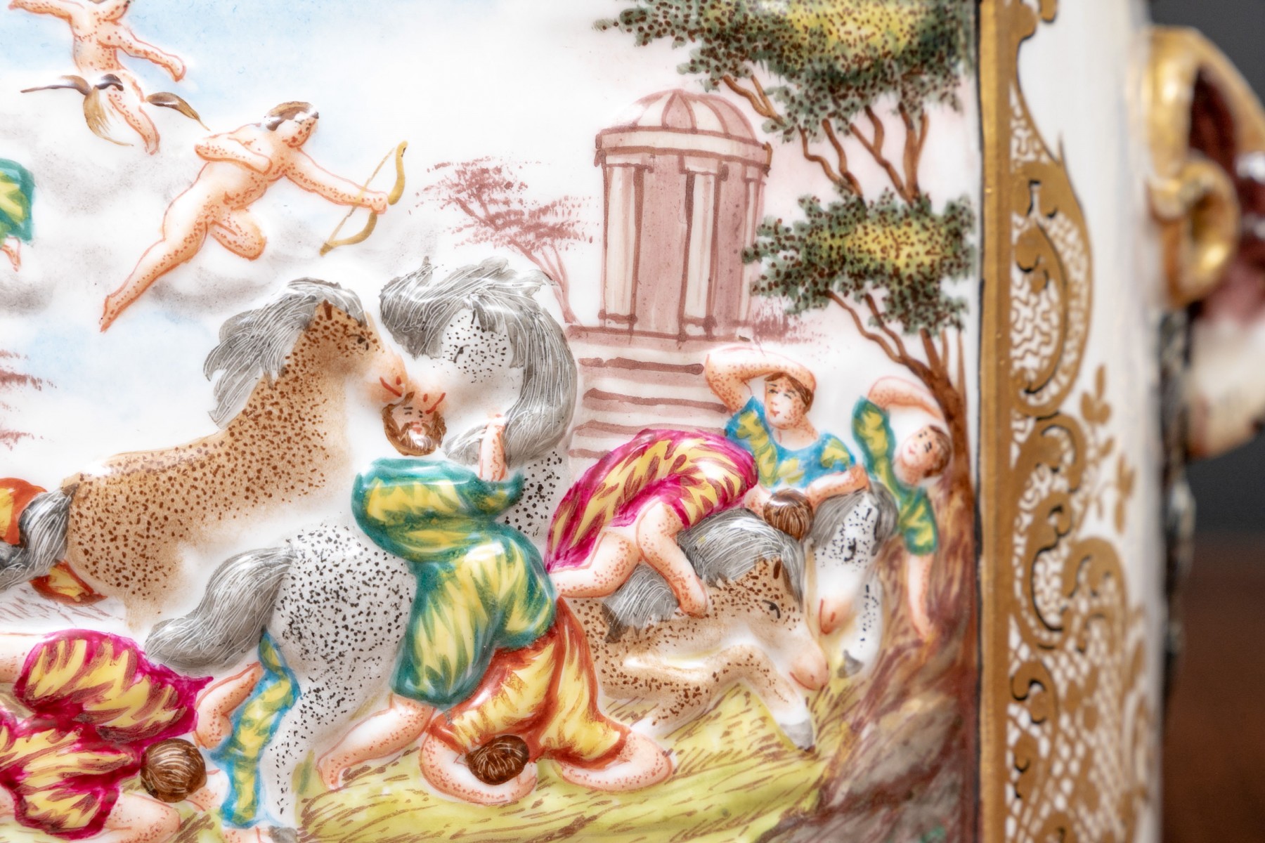 An impressive Crown Naples Capodimonte porcelain two handled box with hinged lid. The box mounted with gilt bronze around the mouth rim and lid rim, fitted with a cast close clasp.