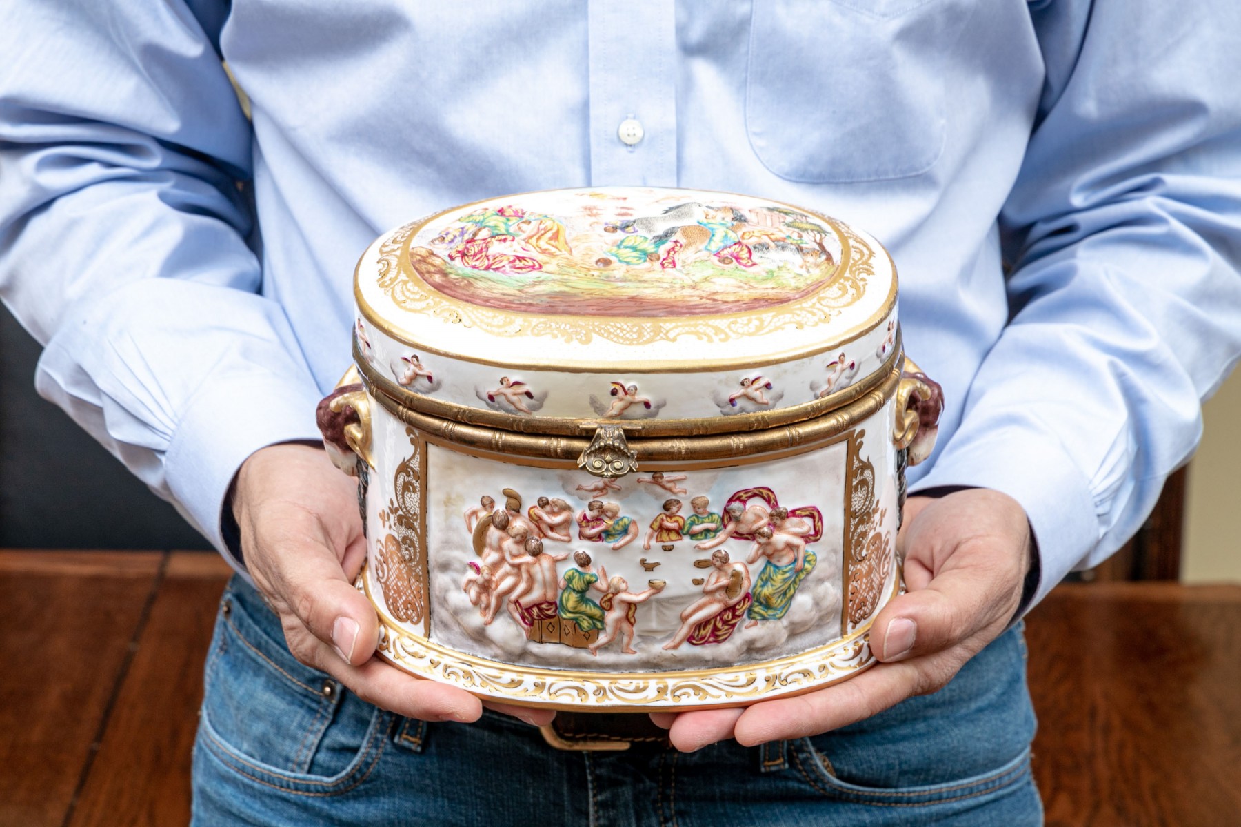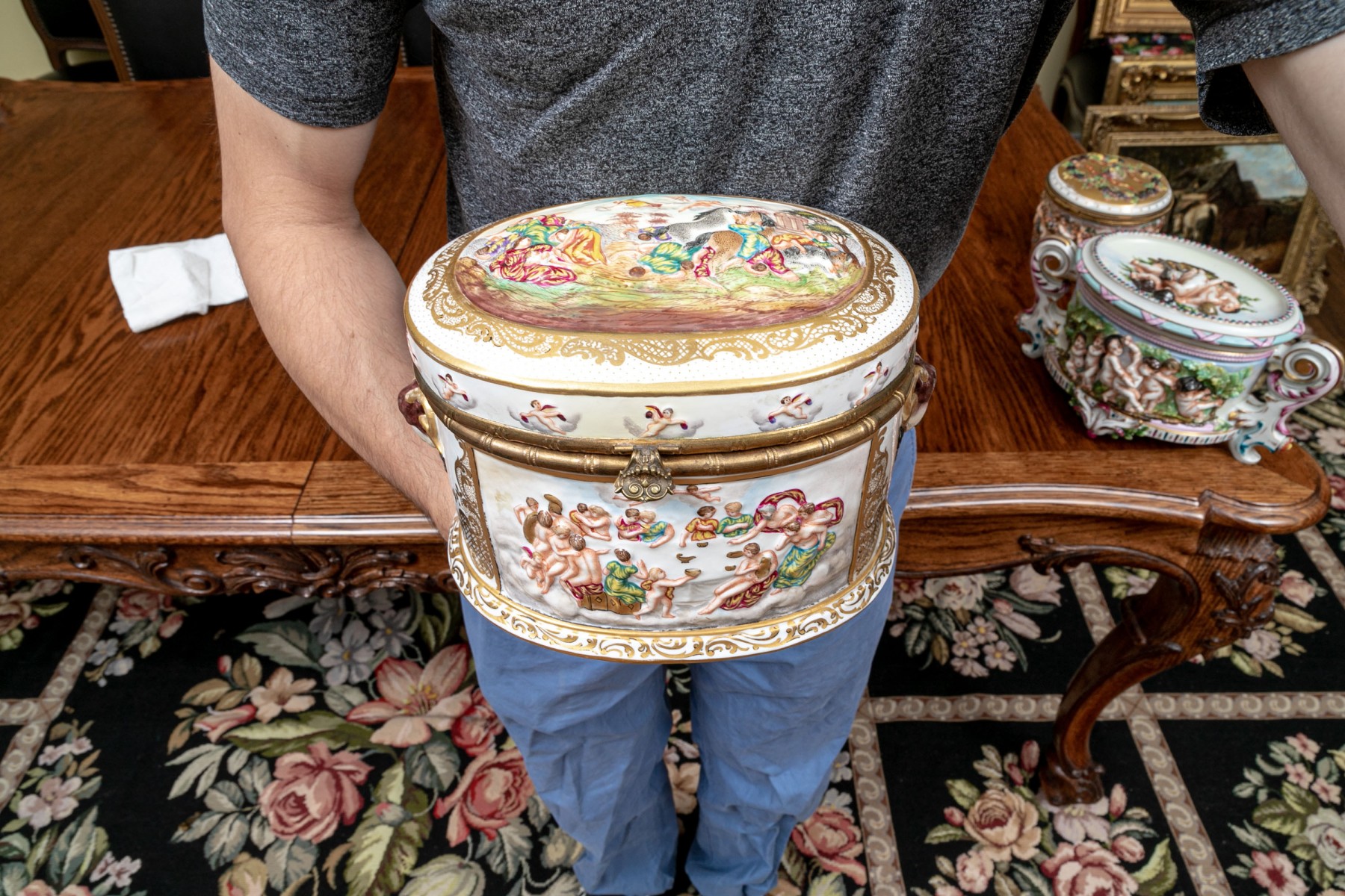 Crown Naples Capodimonte Porcelain Two Handled Box With Hinged Lid, 19th-20th C. #251103. Black Rock Galleries provides high end estate liquidation services through online estate auctions and a 50,000 sq ft designer showroom. estate liquidator, estate sale, online auction, antiques, fine art, liquidation, clean outs, auction, consignment, interior design, fine jewelry, collectibles, appraisals, estate appraisals, estate services, decor, furniture, furniture consignment, antique center, consignment shop. We offer appraisal services and specialize in fine art, jewelry, antiques and decorative arts. Sell with us. Black Rock Galleries is the tri-state's largest estate liquidator serving New England and the greater New York City area. We are the trusted source for expert appraisals, auction services, estate sales, and consignments. Black Rock Galleries is the east coast's largest and most trusted estate liquidator, with locations in Connecticut, greater Boston, MA and Raleigh, NC, Fairfield, Southport, Apex, TX. We are the best source for expert appraisals, auction services, estate sales and consignments. We have served thousands of families and estates with compassion, professionalism and expertise. BRG works with attorneys, executors, realtors and families to bring the greatest return on personal and estate property in the current market. Our unique combination of services make us the easy choice to get the job done in a timely and stress-free manner. We are with you from the initial consultation to the final clean out. Our house-built online auction software platform offers clients a dynamic approach to liquidating their personal property. This venue is most successful in bringing the best return with the least amount of disruption for our clients. See our services page for a complete description of this offering. Crown Naples Capodimonte Porcelain Two Handled Box With Hinged Lid, 19th-20th C. #251103