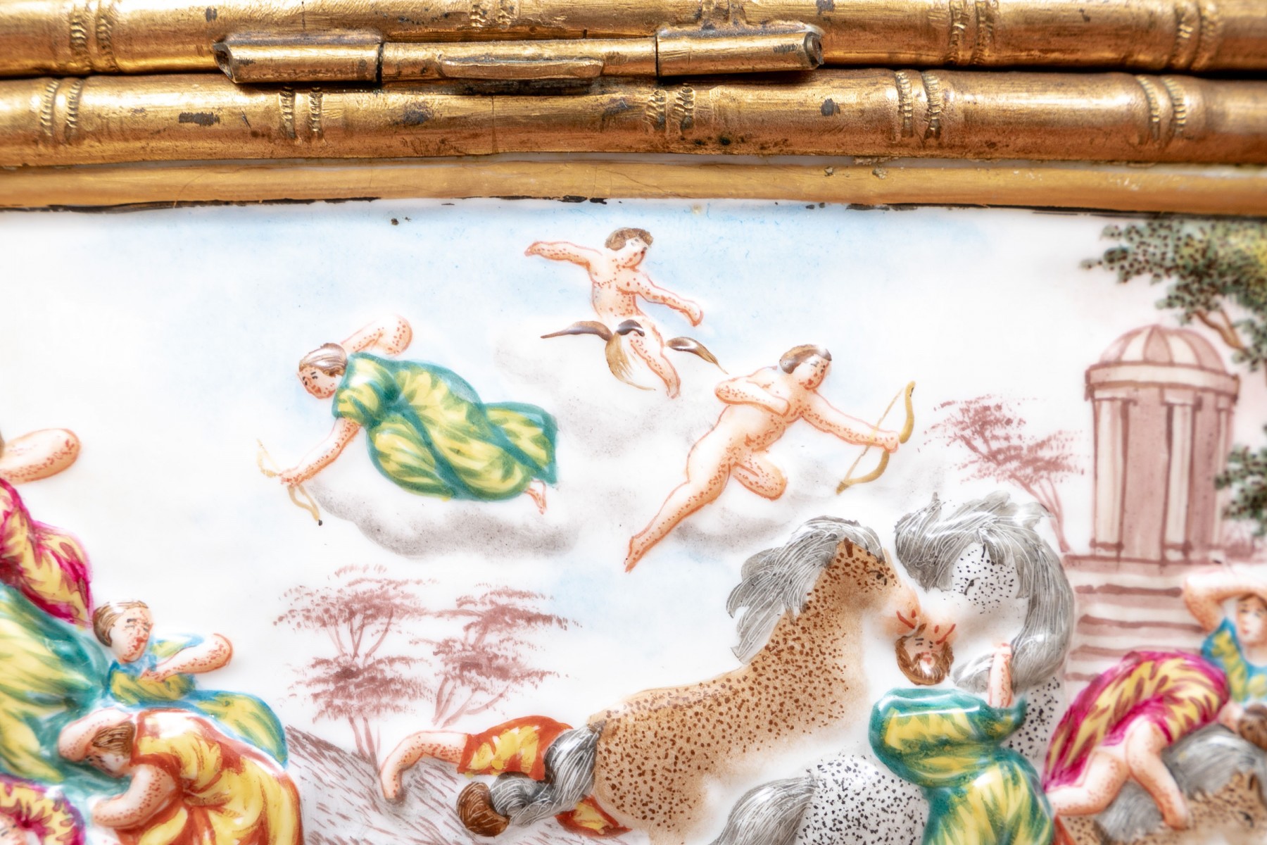 Condition: There appears to have been older restoration to the lid which can be seen with UV light to the lids underside. Some in painting and touching up but overall aside from wear to the polychromatic finish and nics to the porcelain the box is in good form and presents very well.
