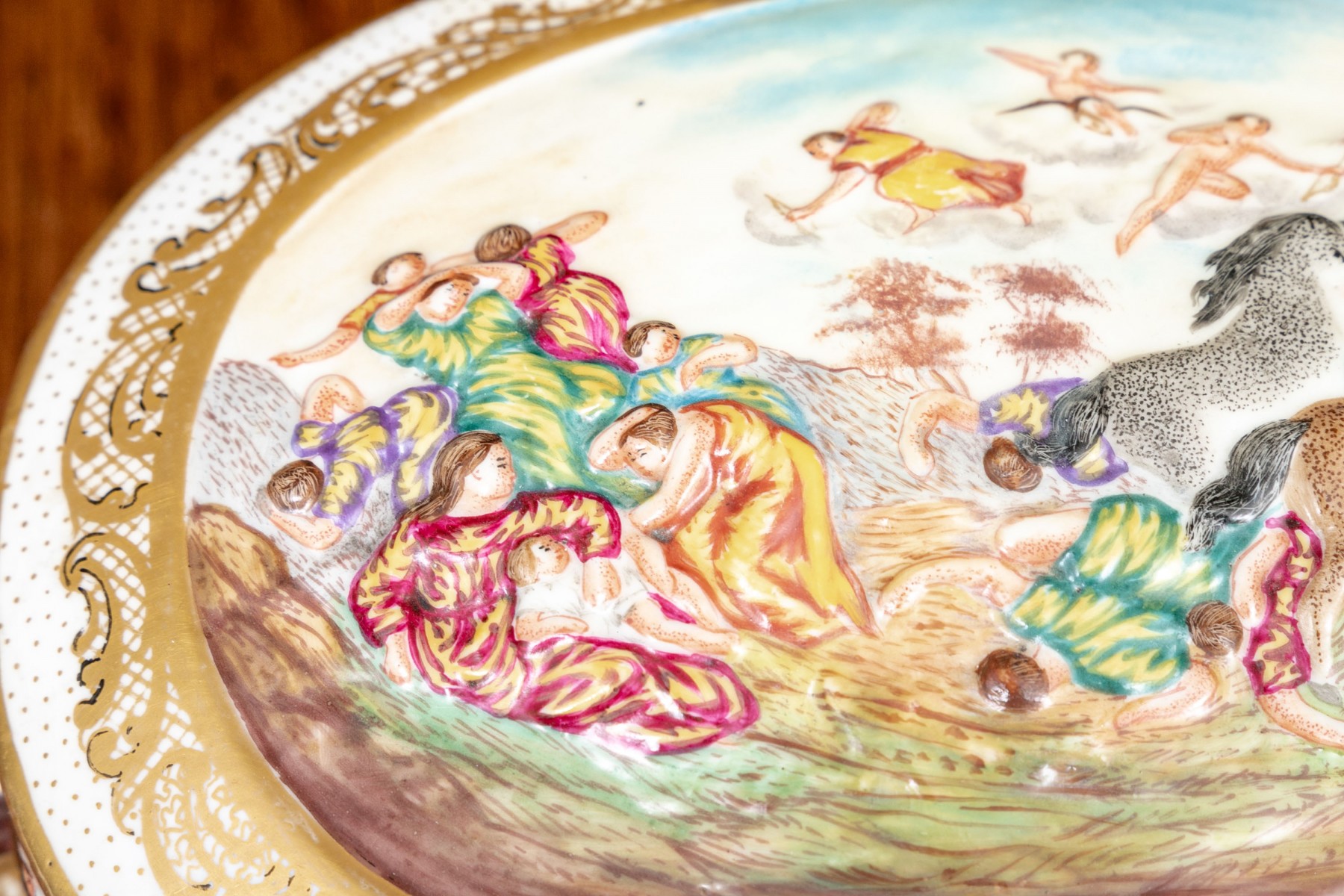 the lid with a central reserve depicting a mythological, figural scene with figures in an outdoor landscape with architecture to the right hand side.
