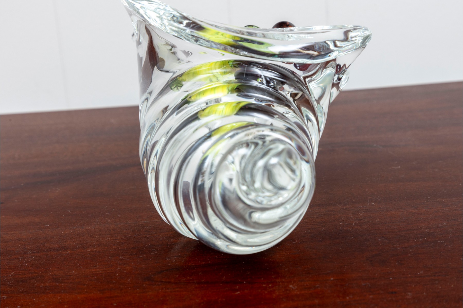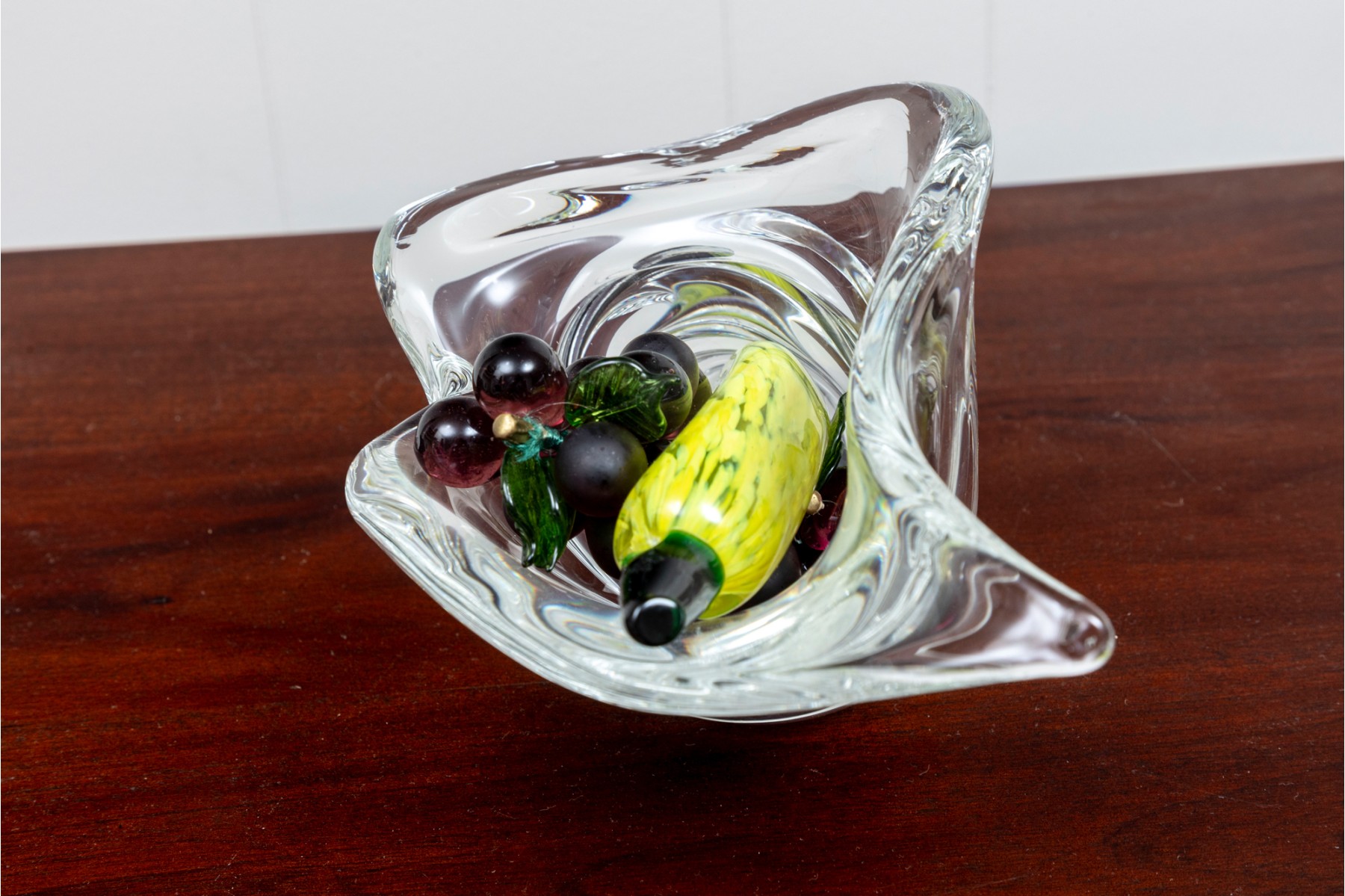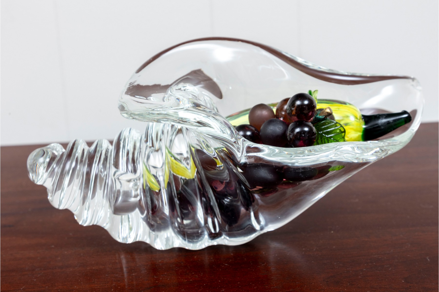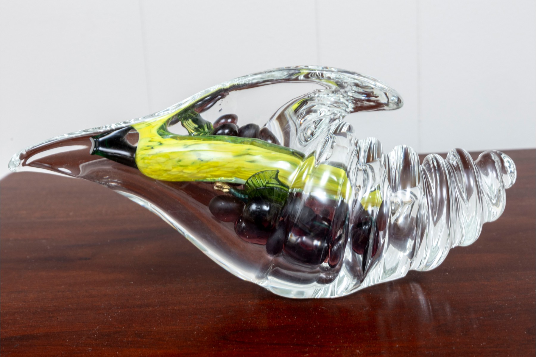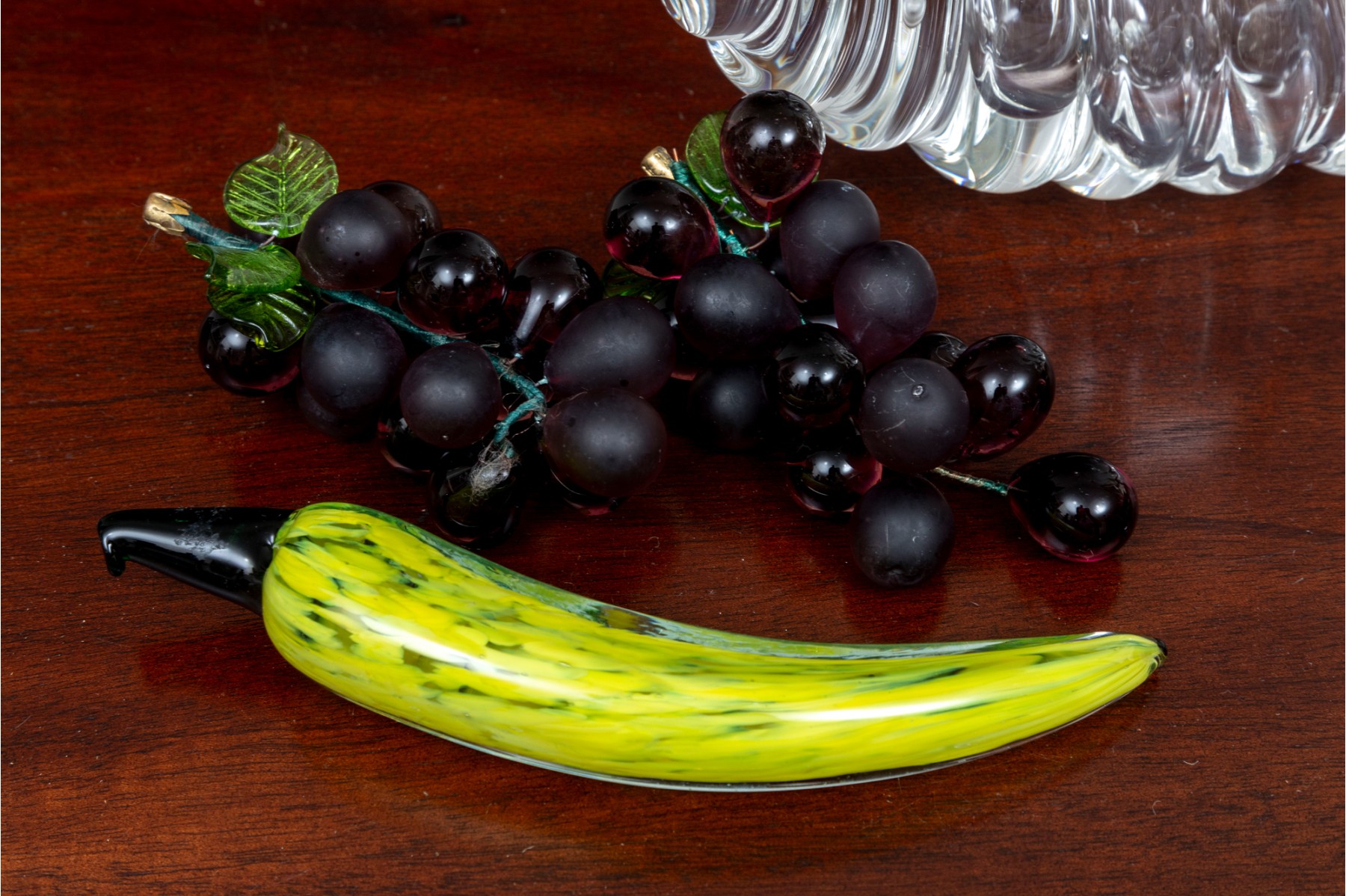 A fabulous glass cornucopia bowl accompanied by art glass fruit including clusters of grapes and a banana or pepper.