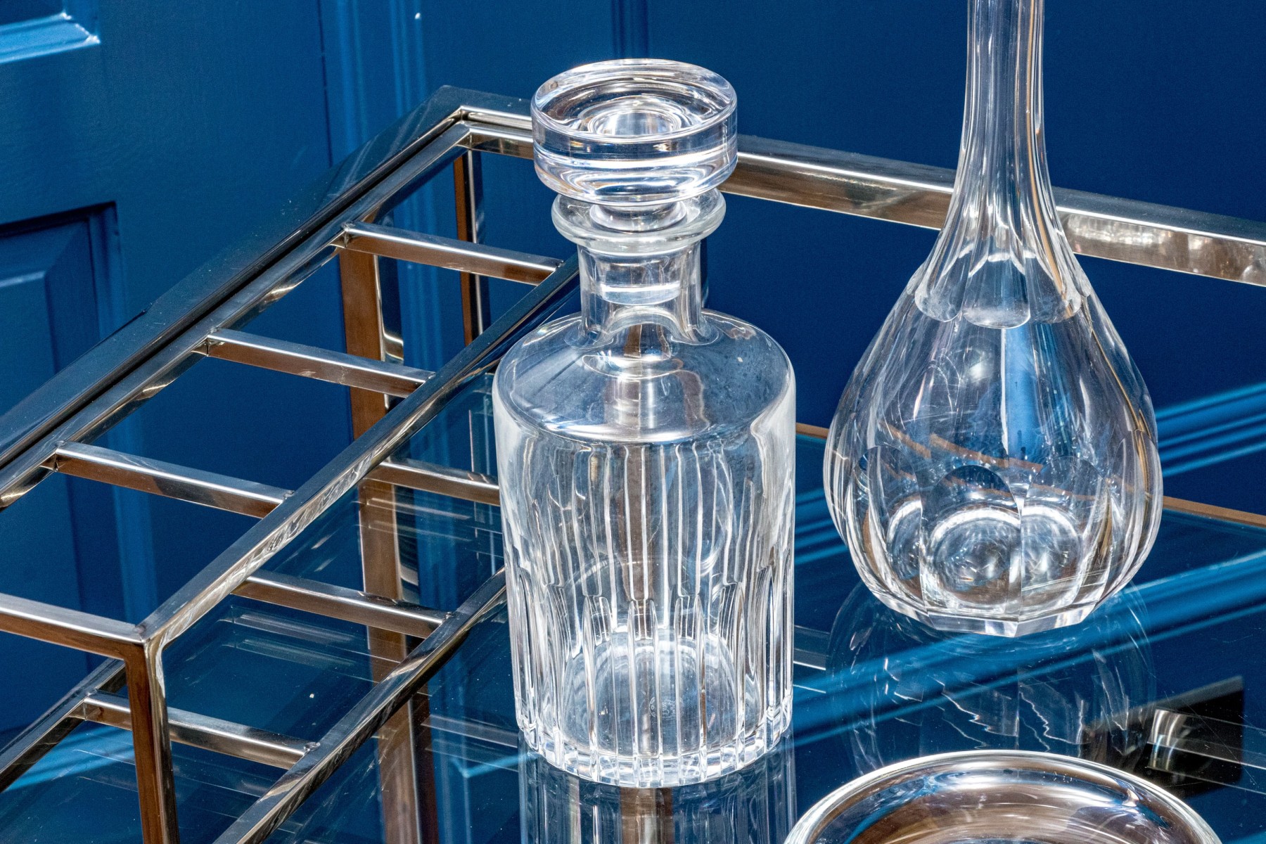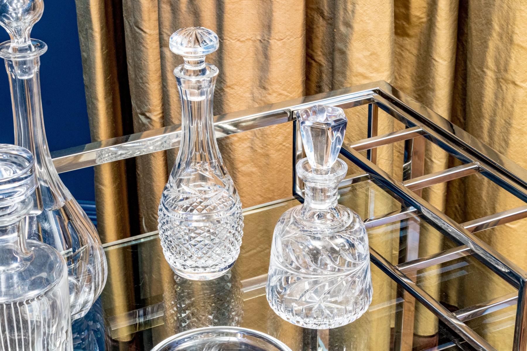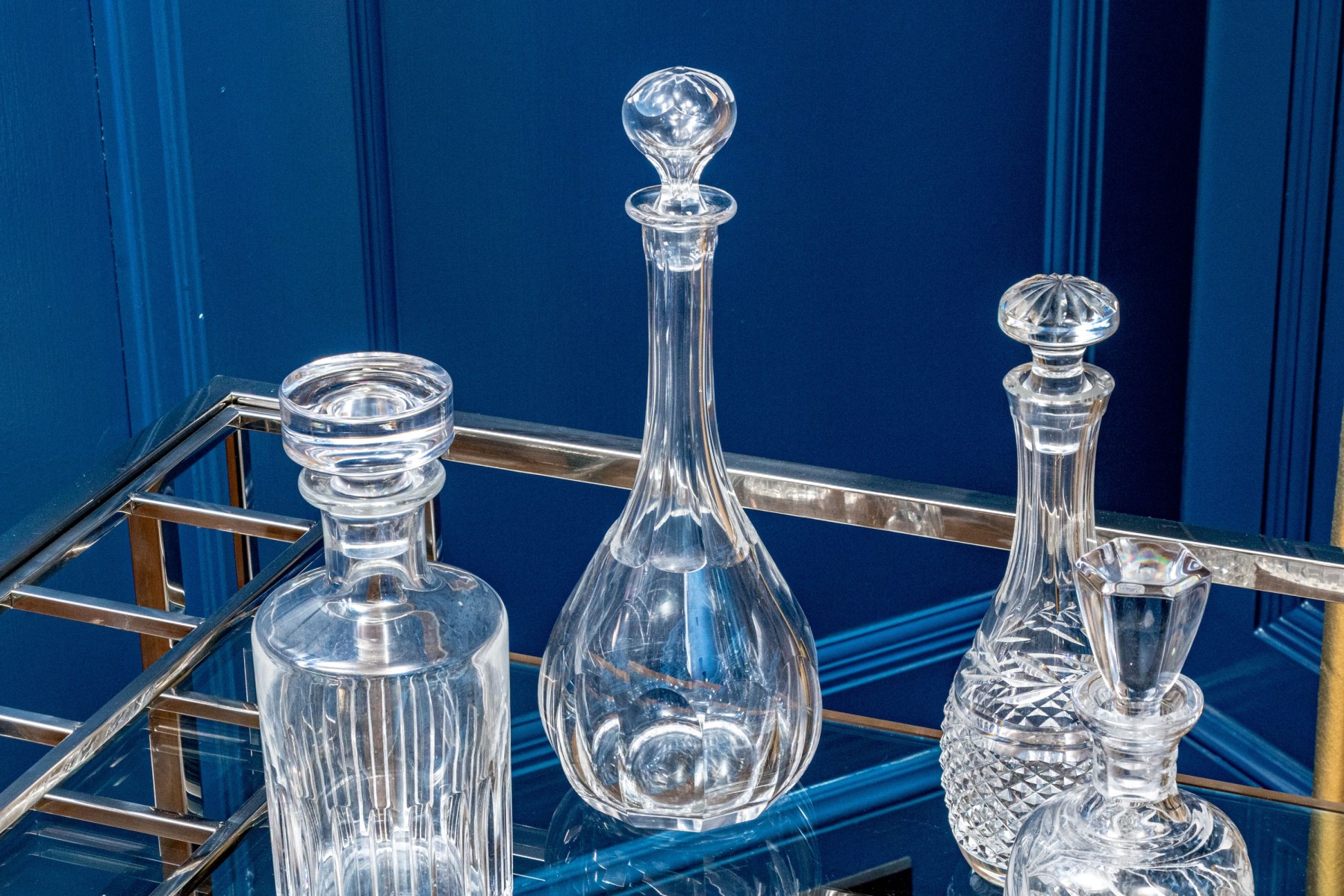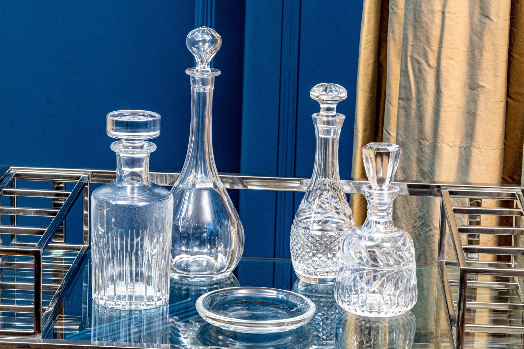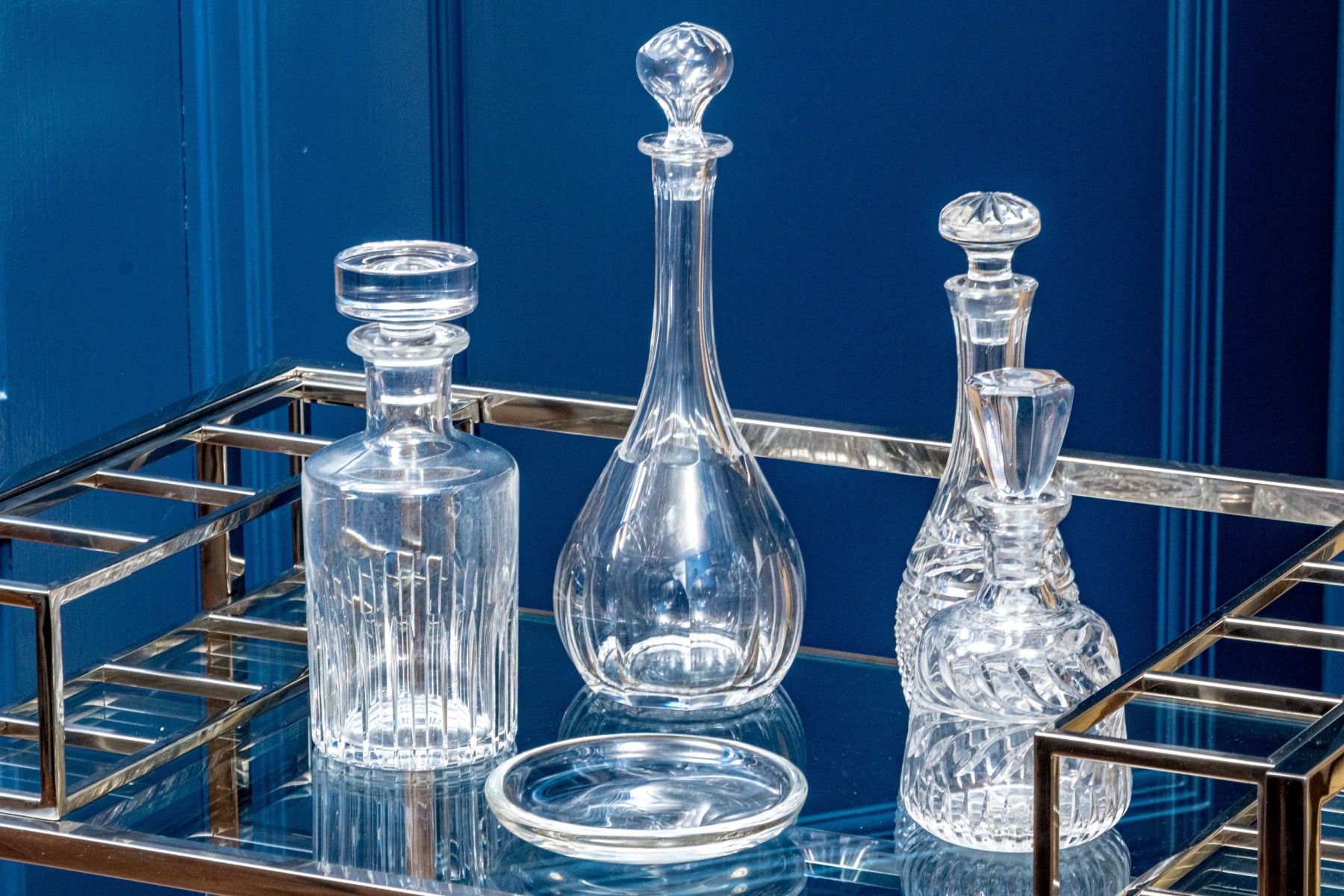 A delightful collection of crystal including four elegantly cut decanters with stoppers and a shallow bowl. Makers include Baccarat, Waterford, and Steuben.