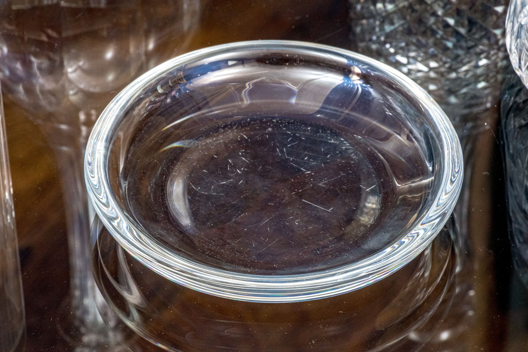 Presents well overall. The Steuben bowl has some minor surface scratches underfoot and one decanter is a little cloudy.