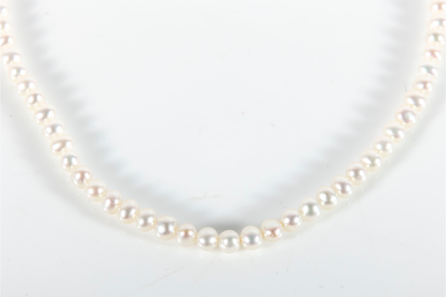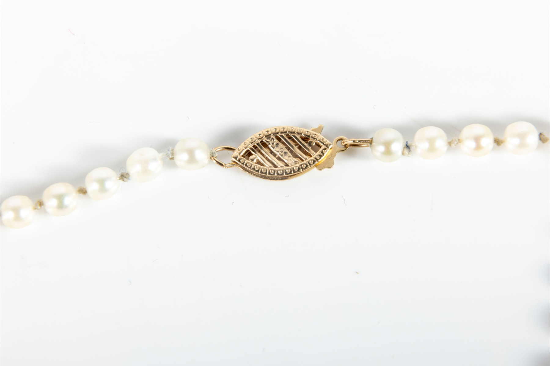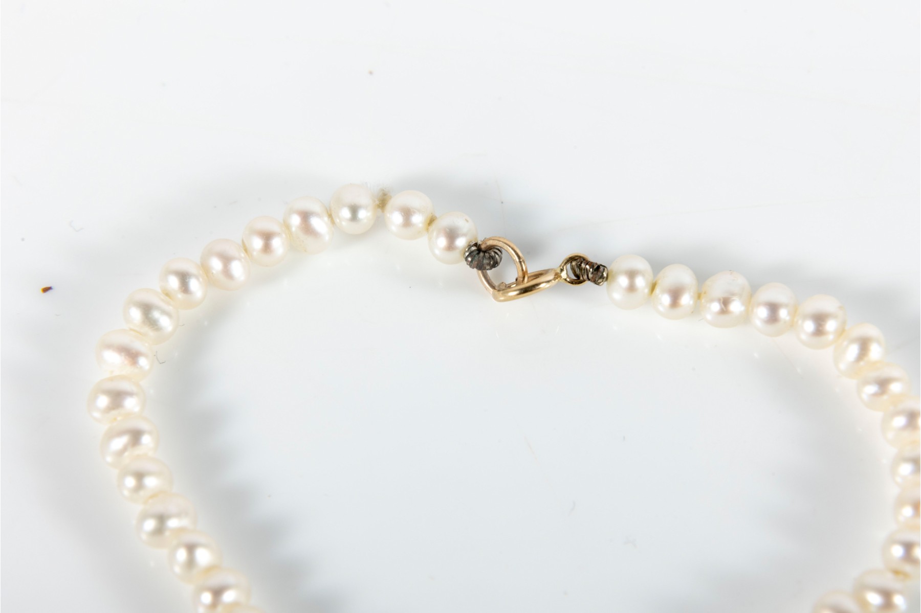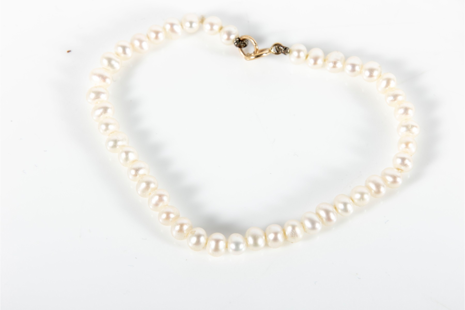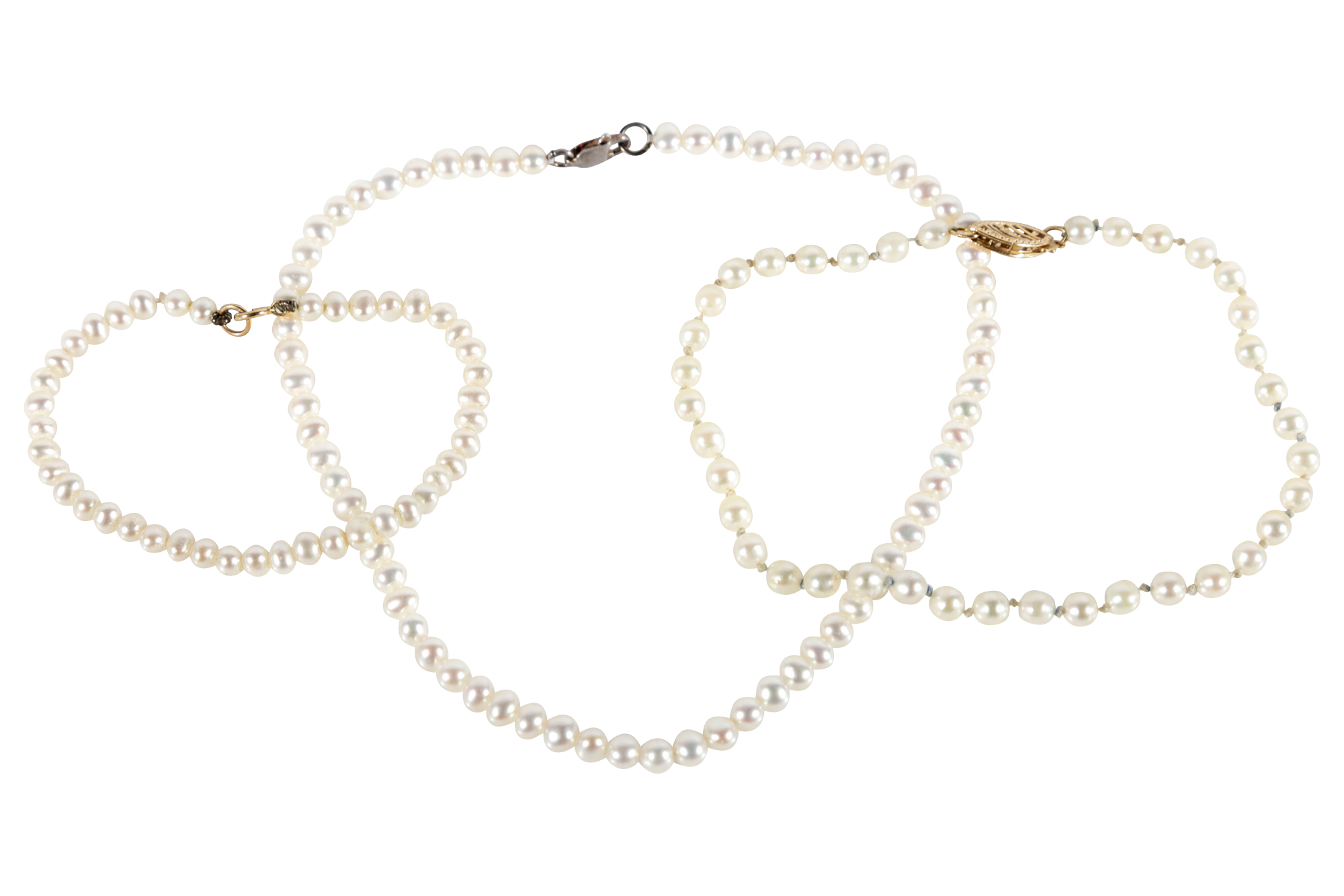 A lovely collection of cultured pearl accessories, including a bracelet with a yellow gold clasp, an anklet with a sterling clasp, and a child or infant-sized bracelet with a yellow gold clasp.