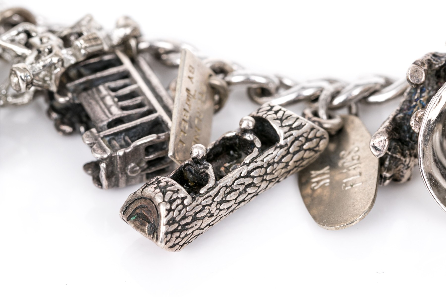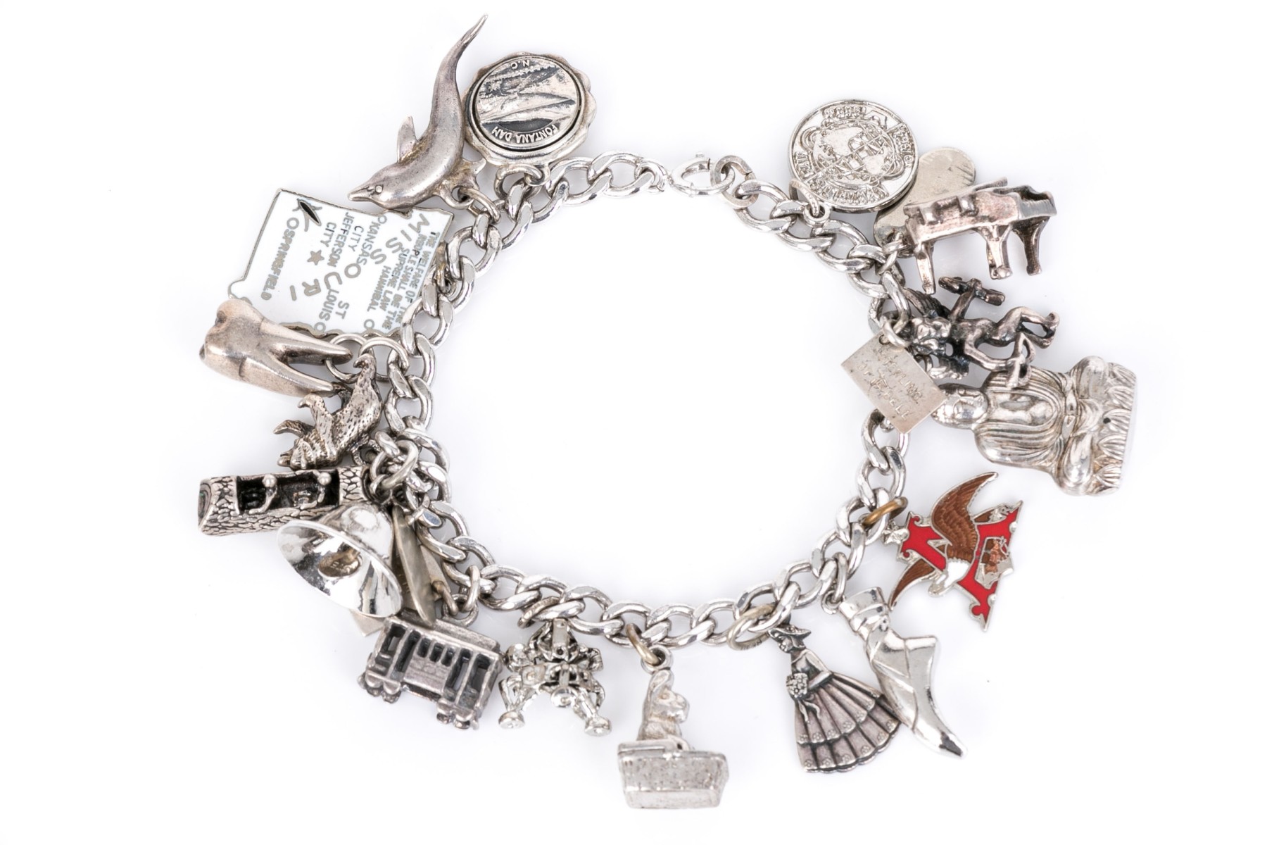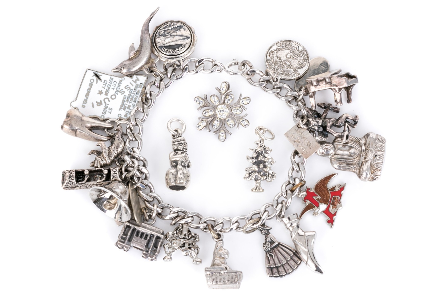 Curb link charm bracelet with assorted sterling and silverplate charms, some loose, finished with a spring ring clasp; bracelet is silverplate