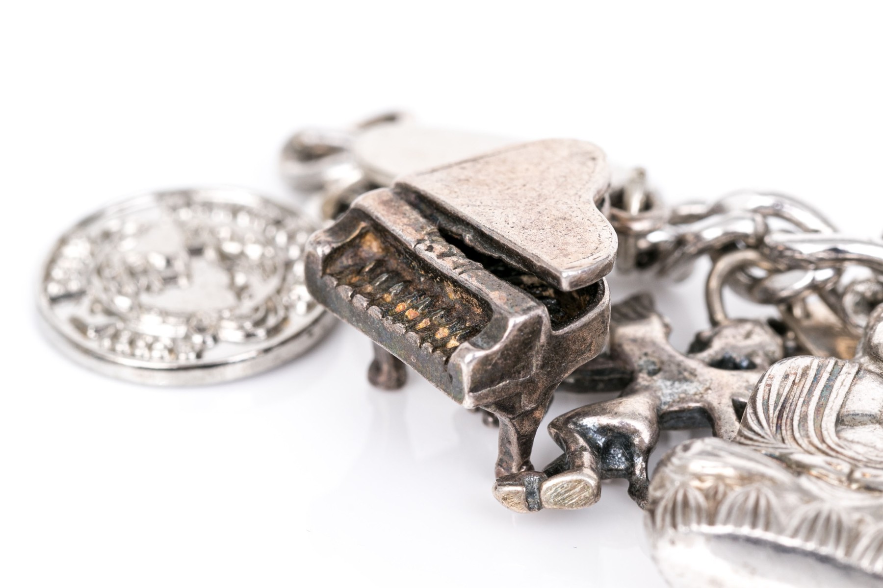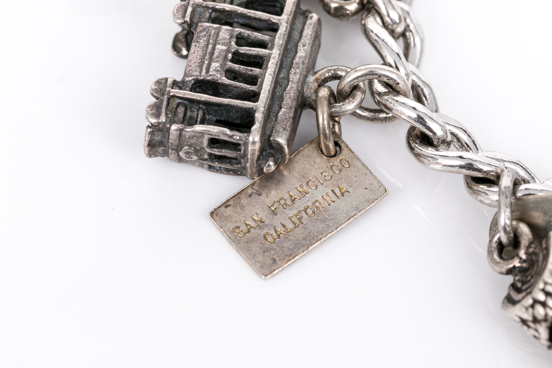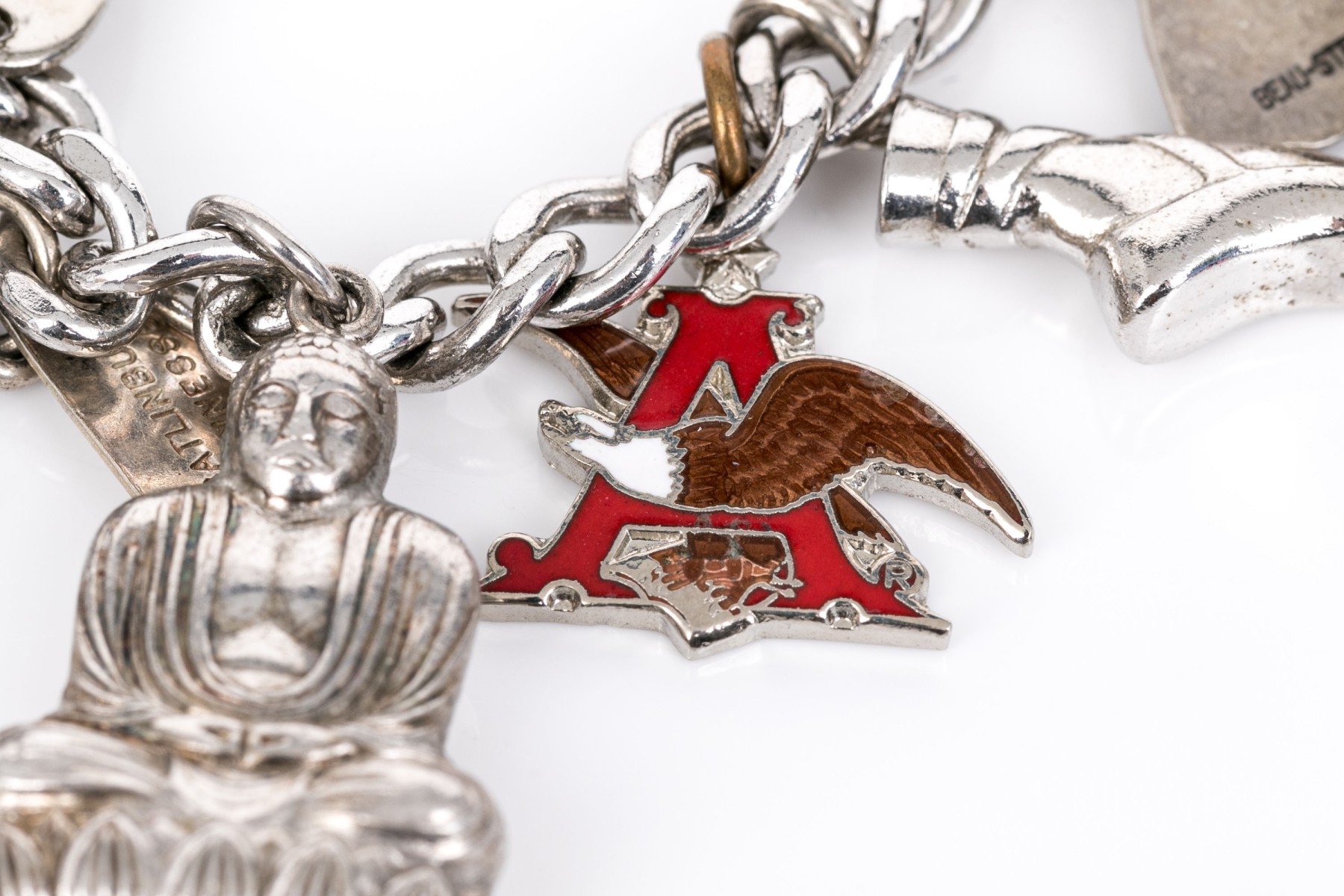 Curb link charm bracelet with assorted sterling and silverplate charms, some loose, finished with a spring ring clasp; bracelet is silverplate