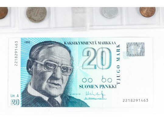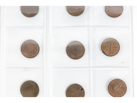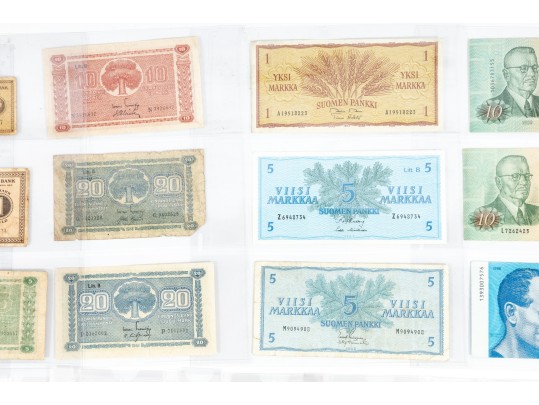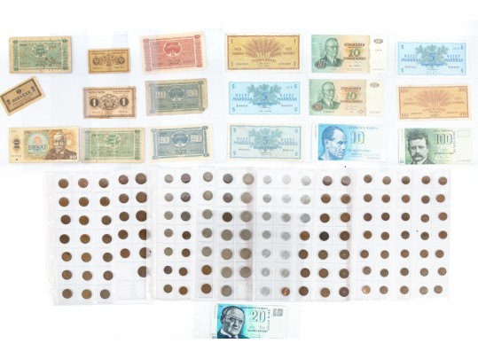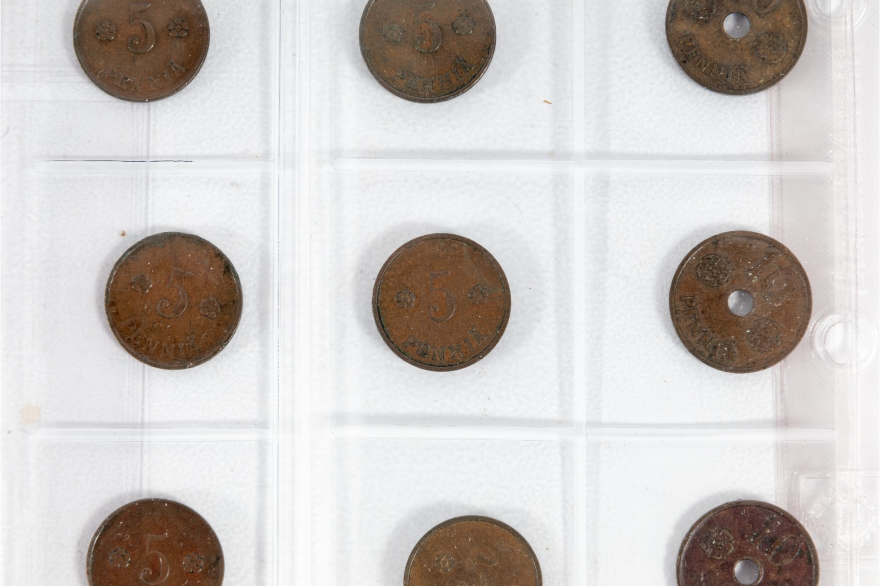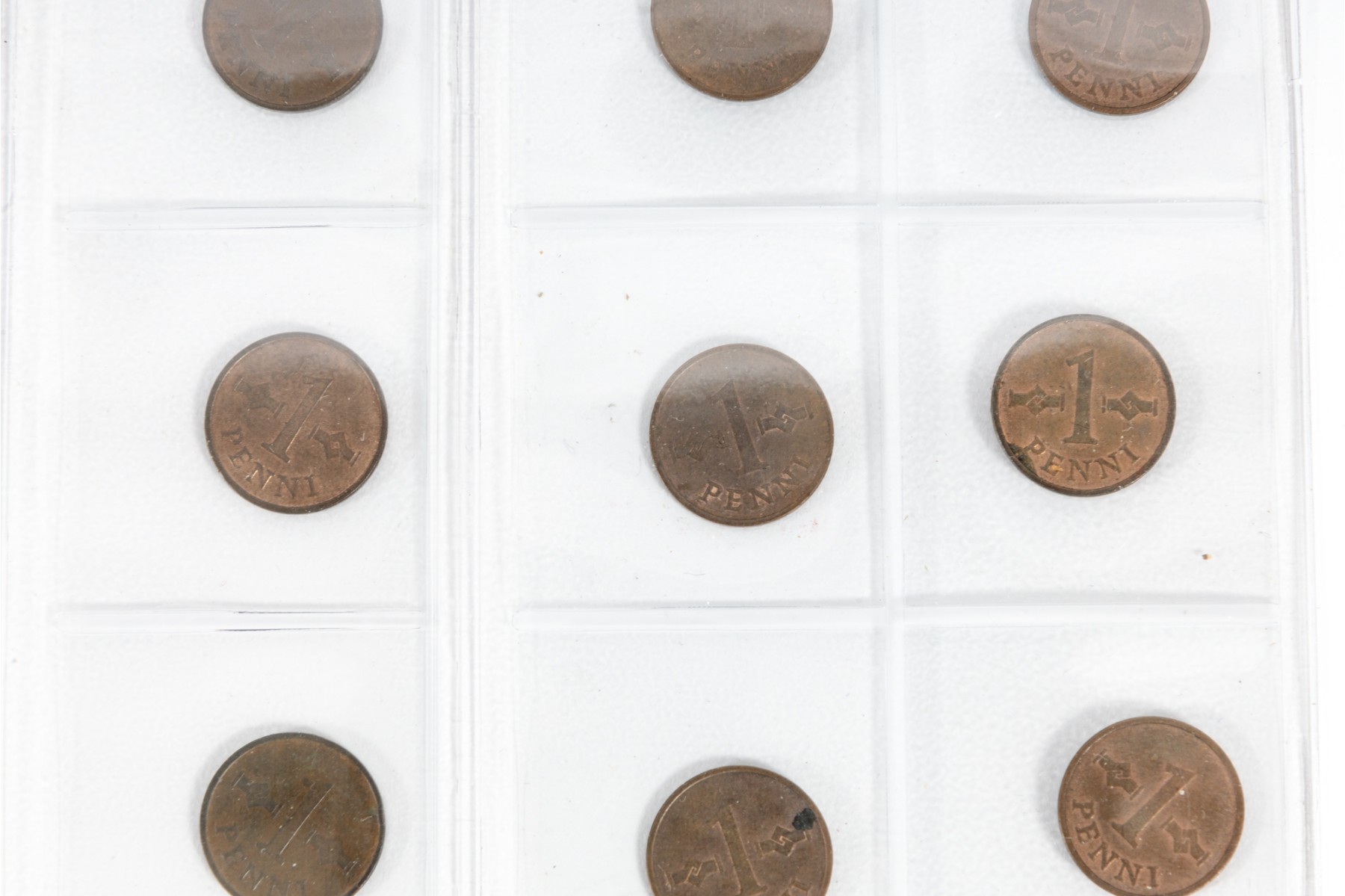 a comprehensive binder containing various Finish coins -- standard circulation coins; 1 Markka, Pennia, Penni coins alongside varied bank notes. See photos for details.