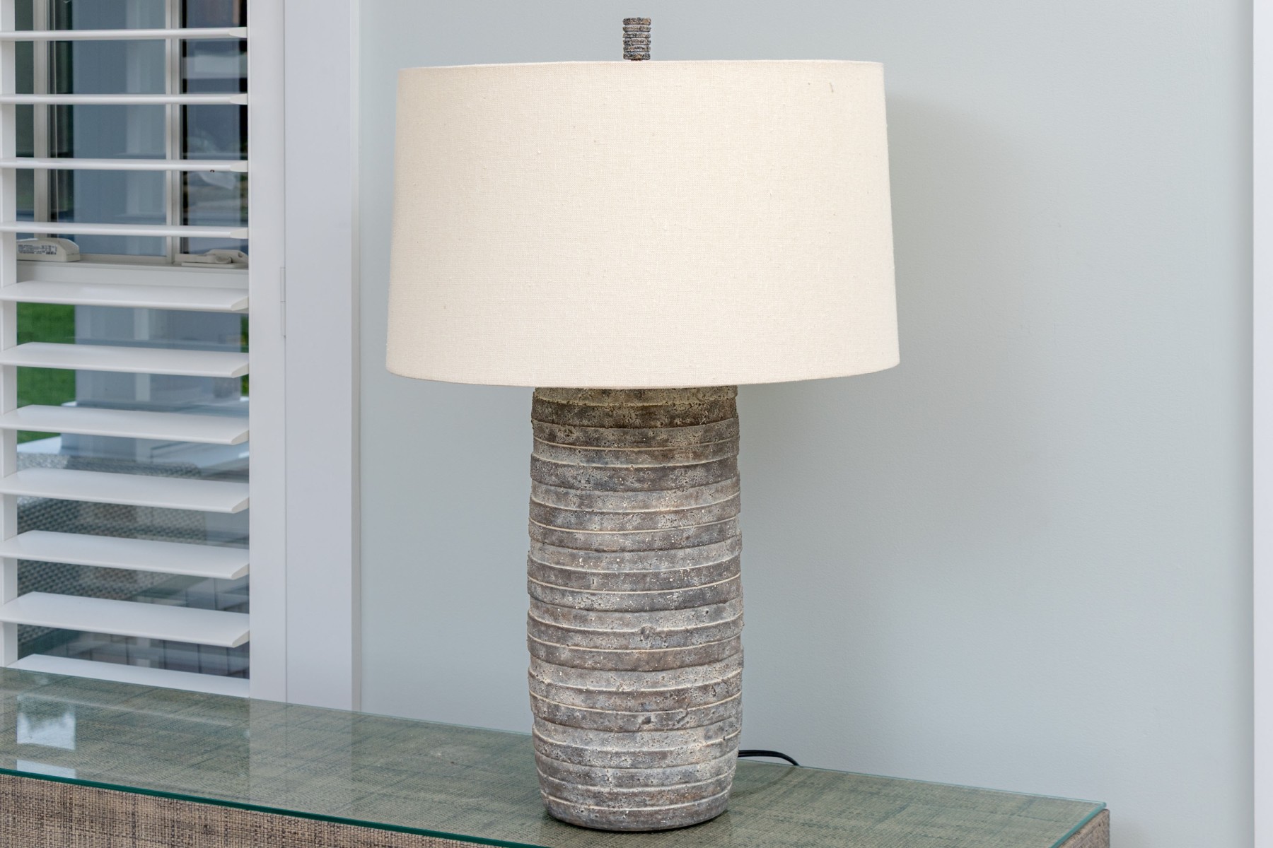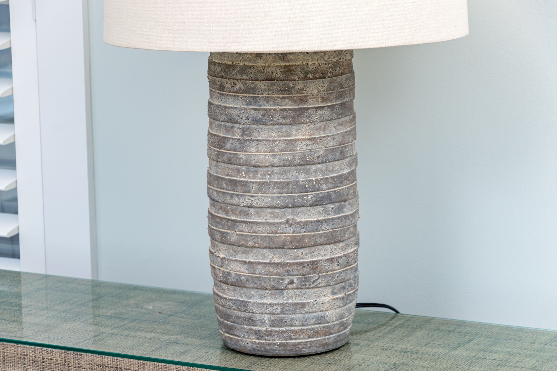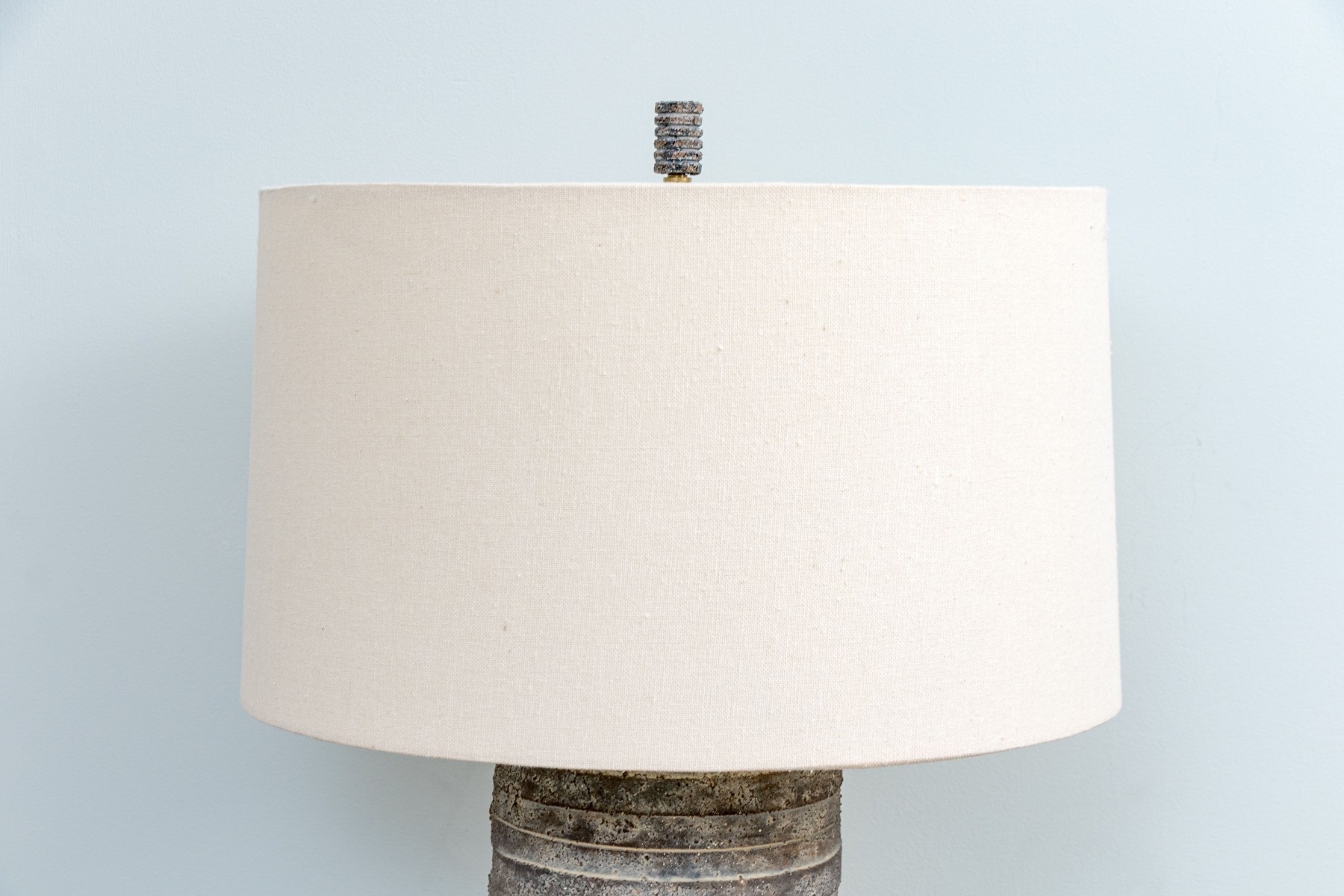 Ian Thornton for Currey and Company "Innkeeper" table lamp featuring a heavy terracotta column in a gray finish creating the appearance of stacked stone for a fabulous and versatile rustic flair. Surmounted by a cream drum shade with a matching finial.