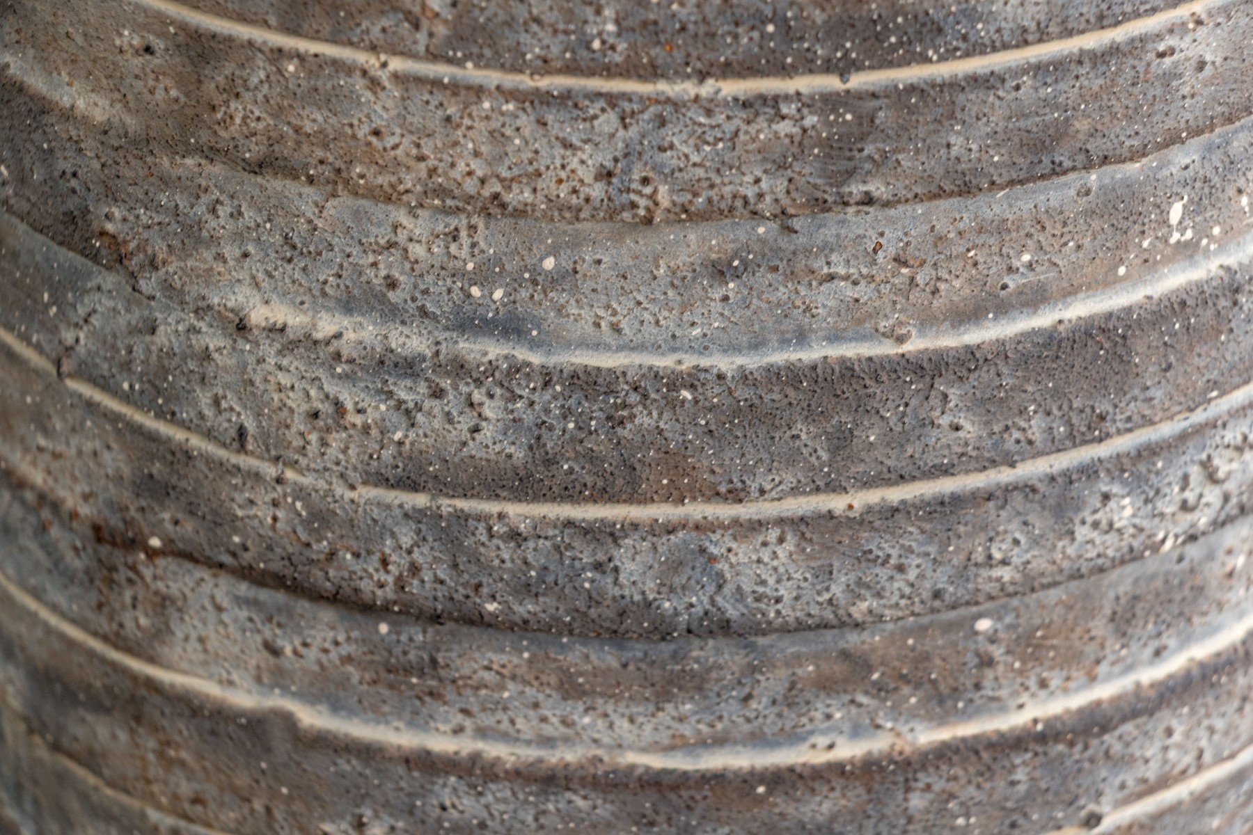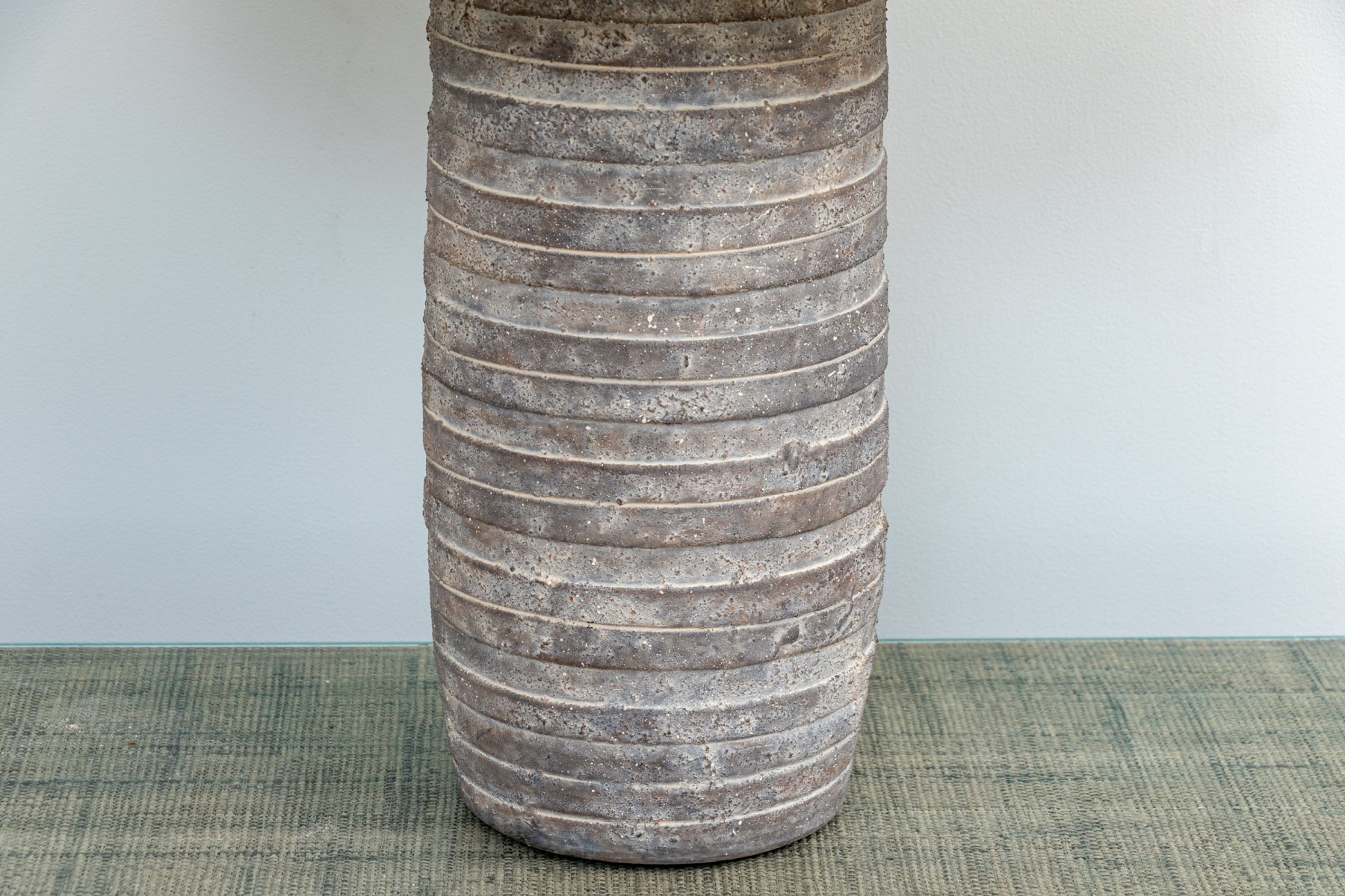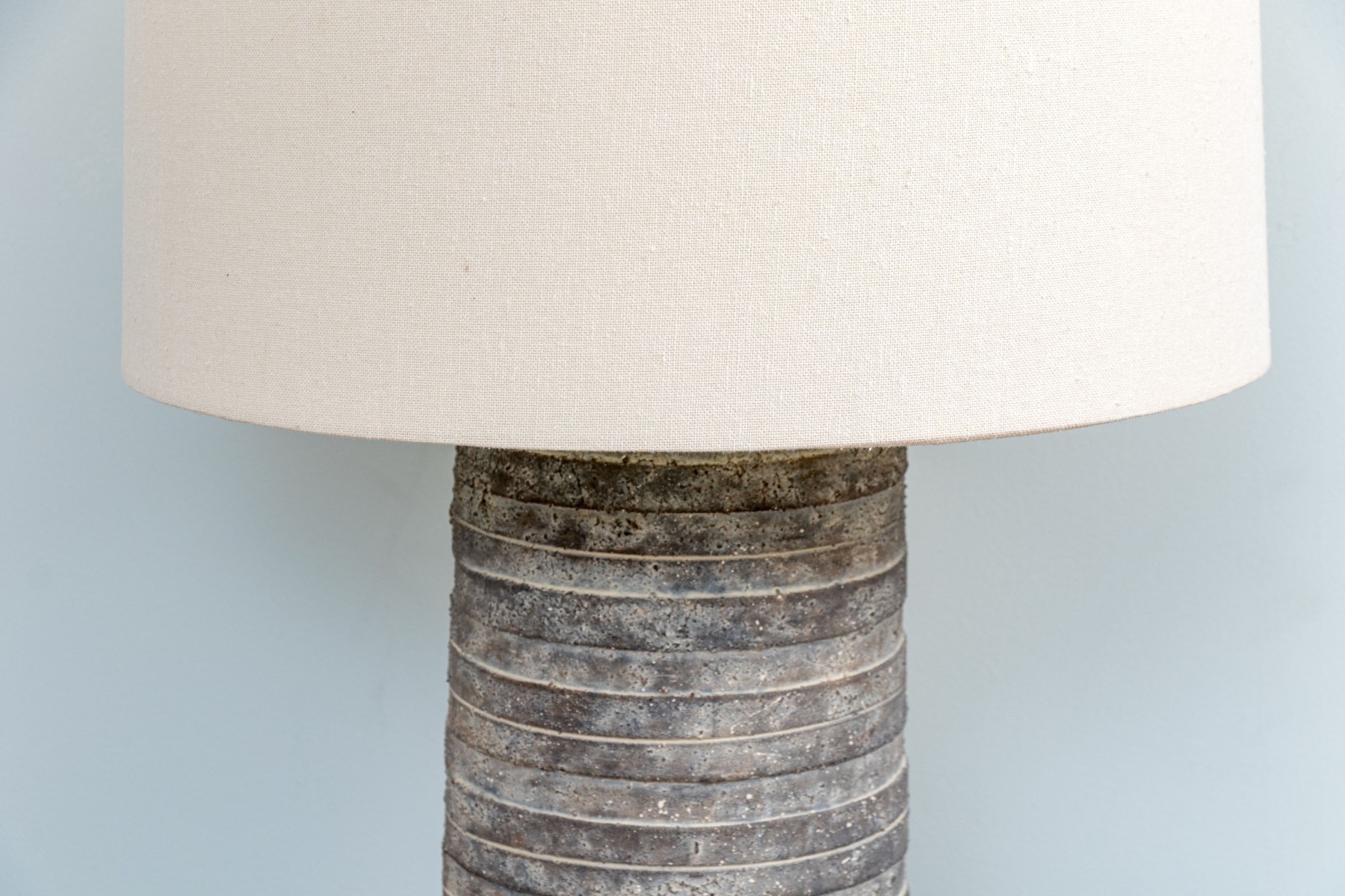 Ian Thornton for Currey and Company "Innkeeper" table lamp featuring a heavy terracotta column in a gray finish creating the appearance of stacked stone for a fabulous and versatile rustic flair. Surmounted by a cream drum shade with a matching finial.