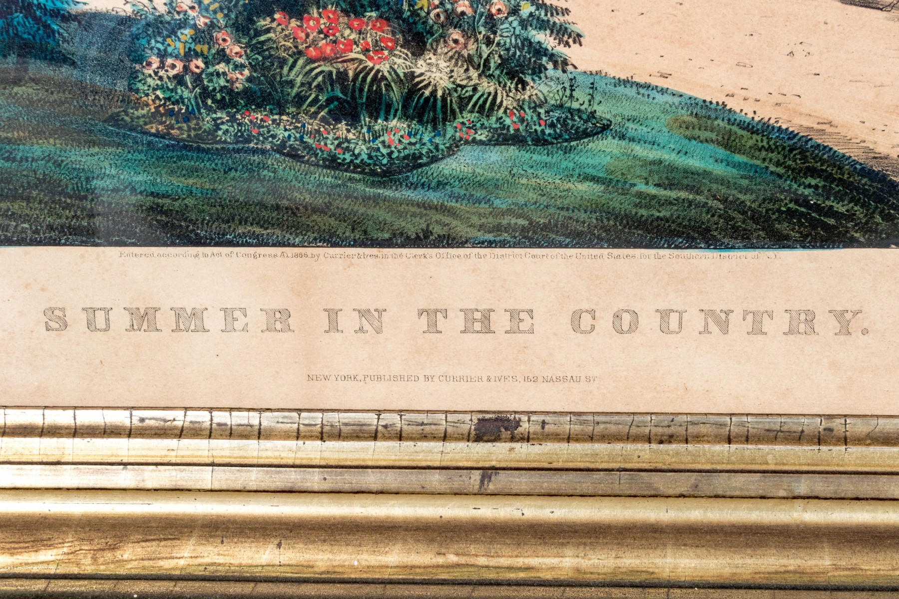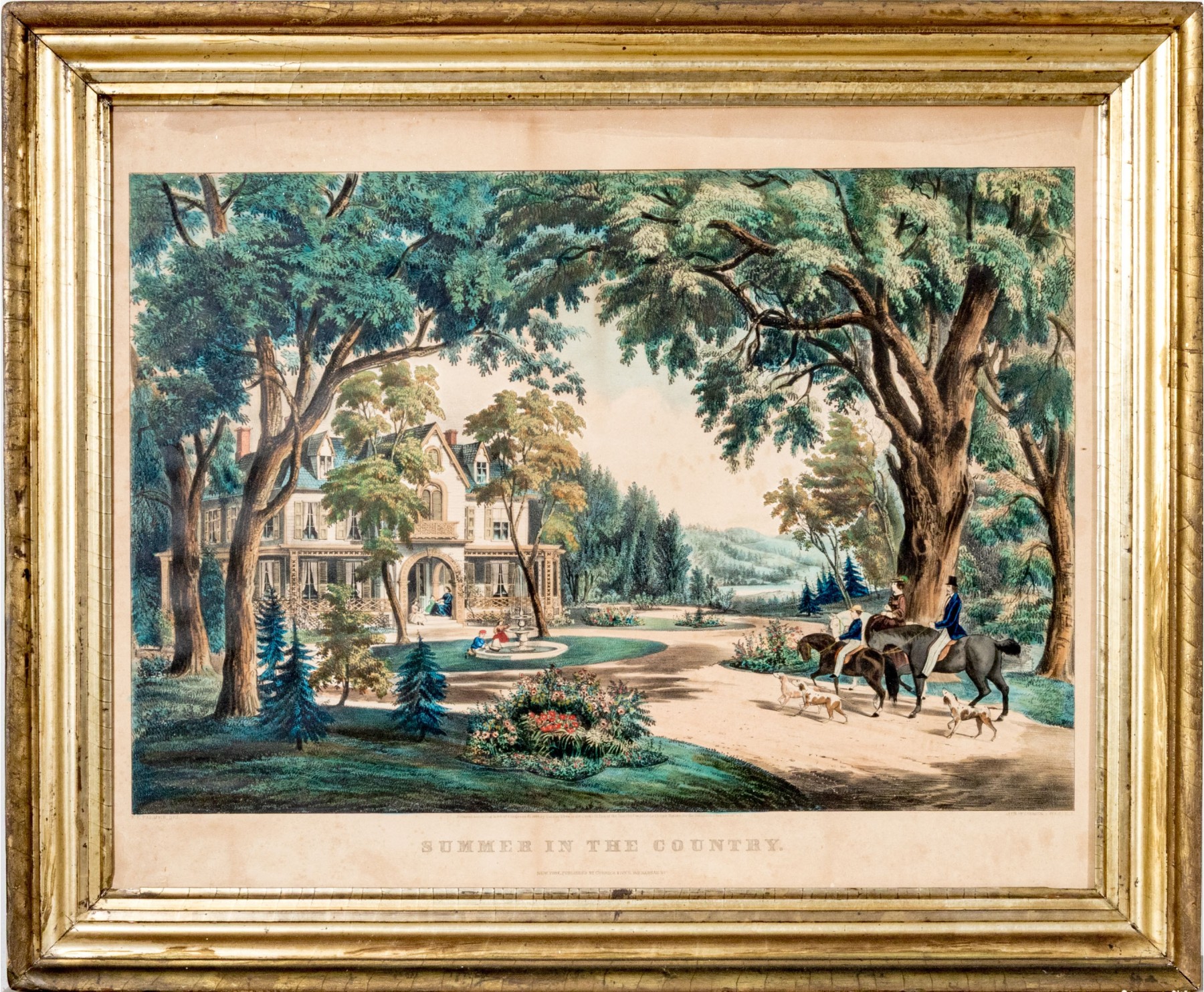 A wonderful 19th century Currier & Ives hand-colored lithograph of Frances "Fanny" Flora Bond Palmer (English, 1812-1876) "Summer in the Country" depicting a stately cene of men on horseback with hunting dogs trotting down a path flanked by lush foliage leading up to an estate with children playing in a fountain.