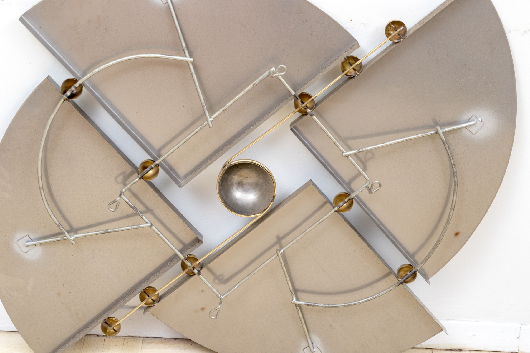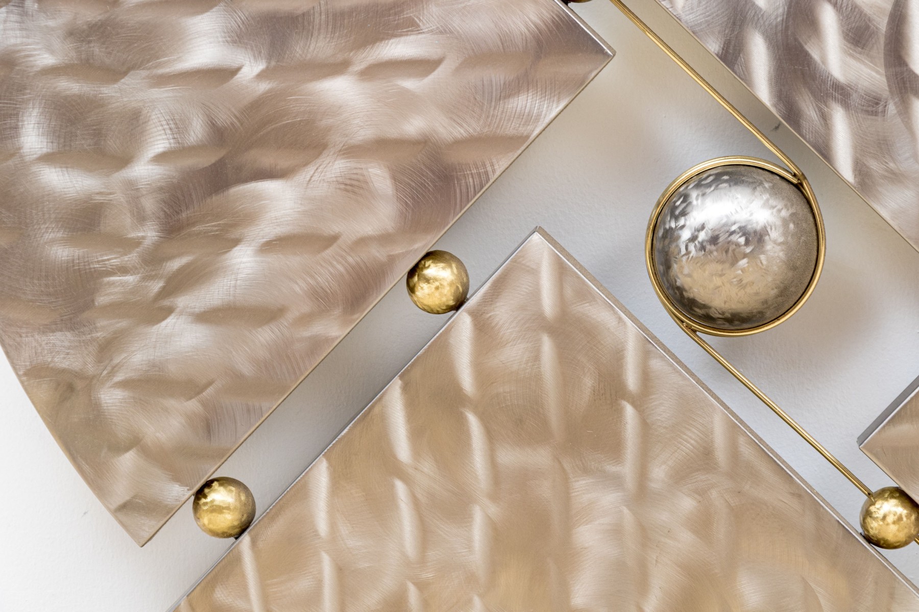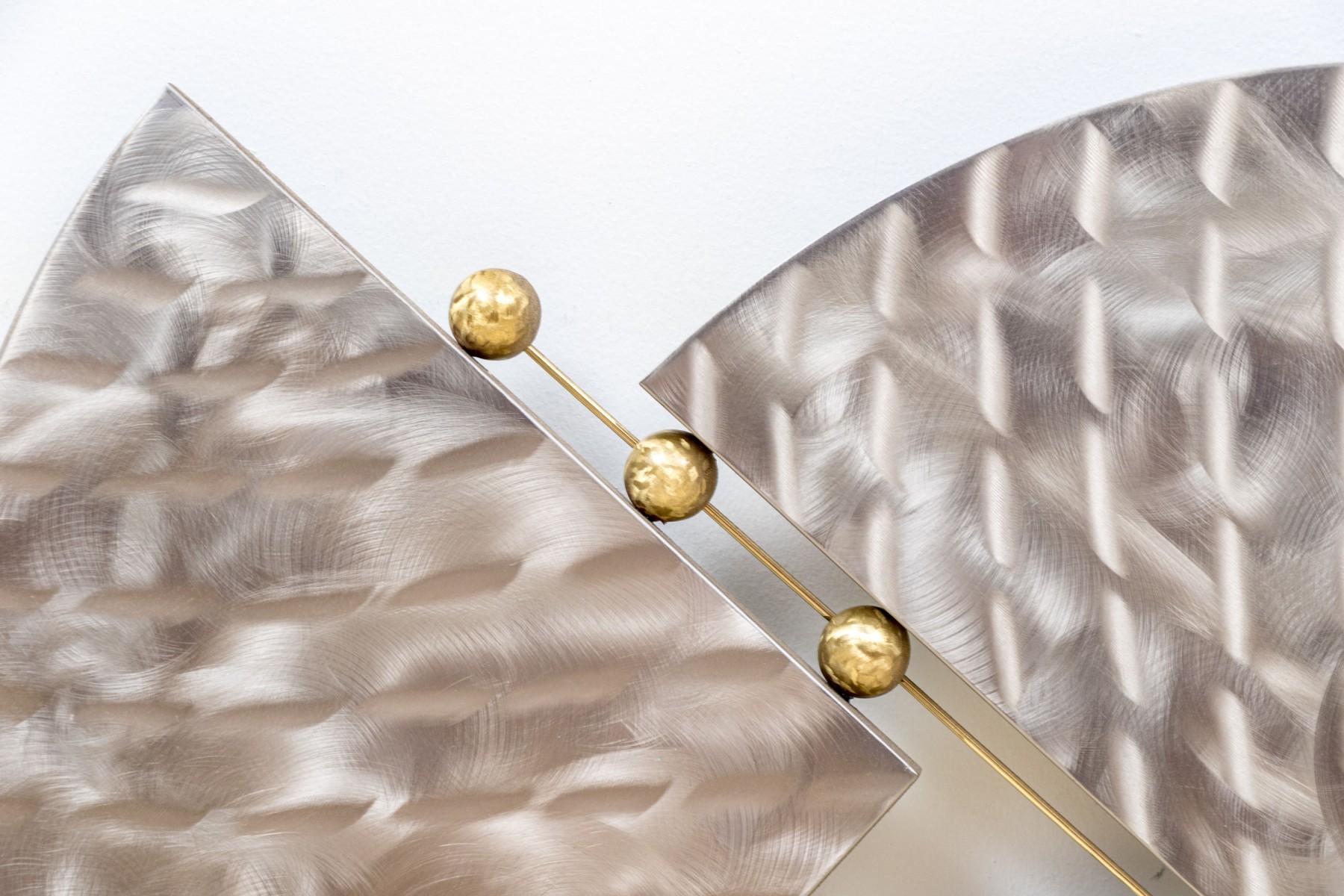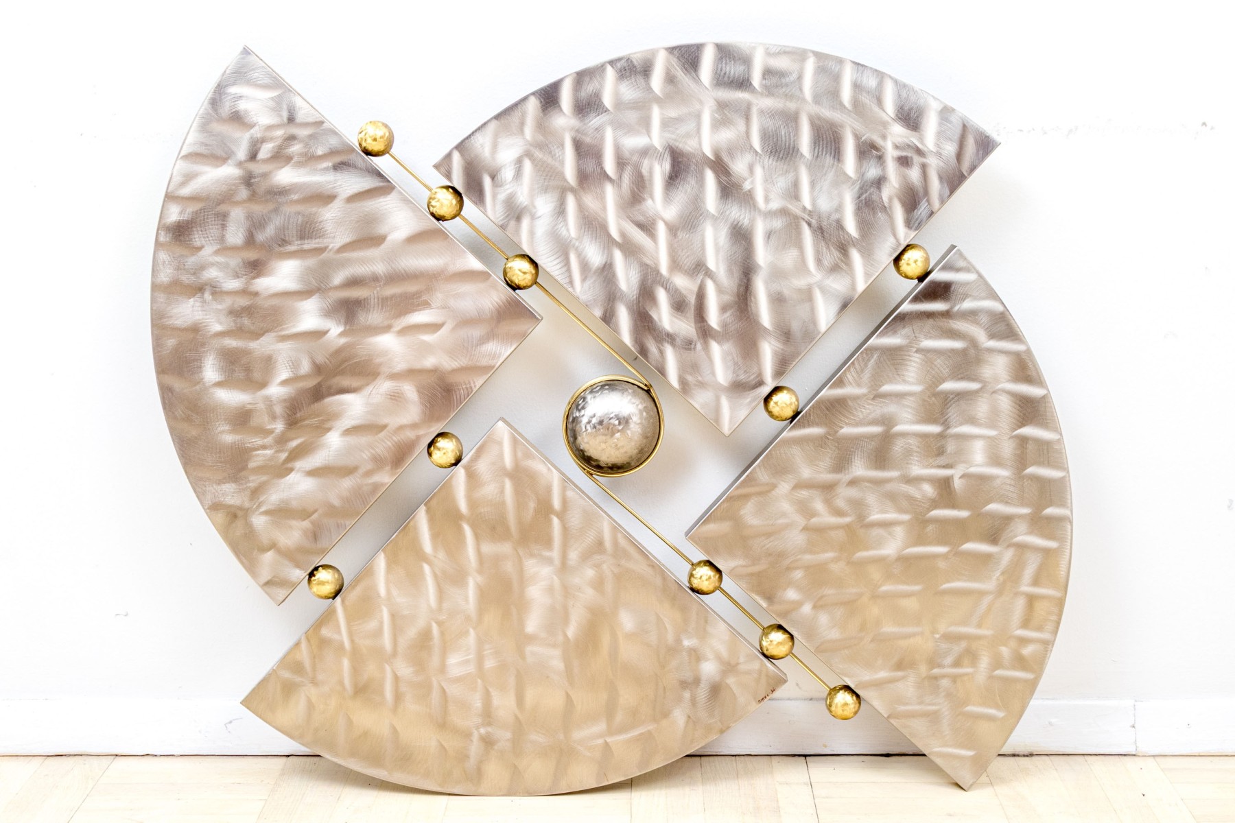 The decorative wall art having hand decorated sheet metal segments with brass finish, with an overall appearance of geometric abstract form or an abstracted rotor blade as though it was in motion.