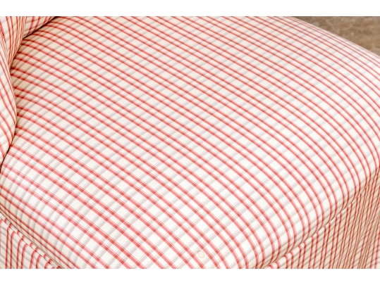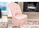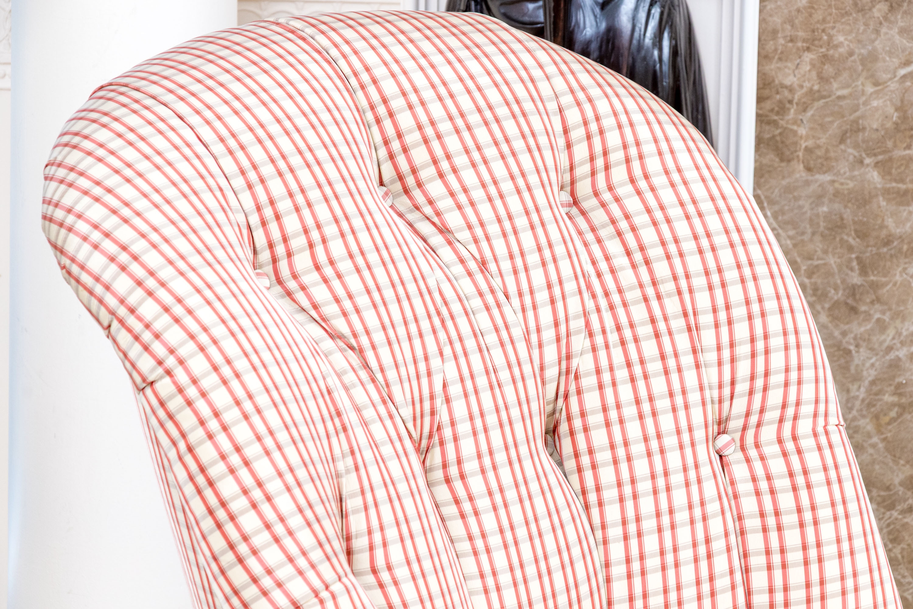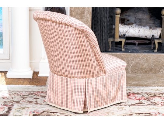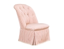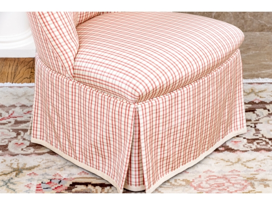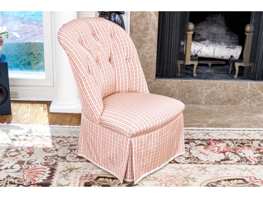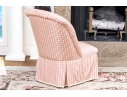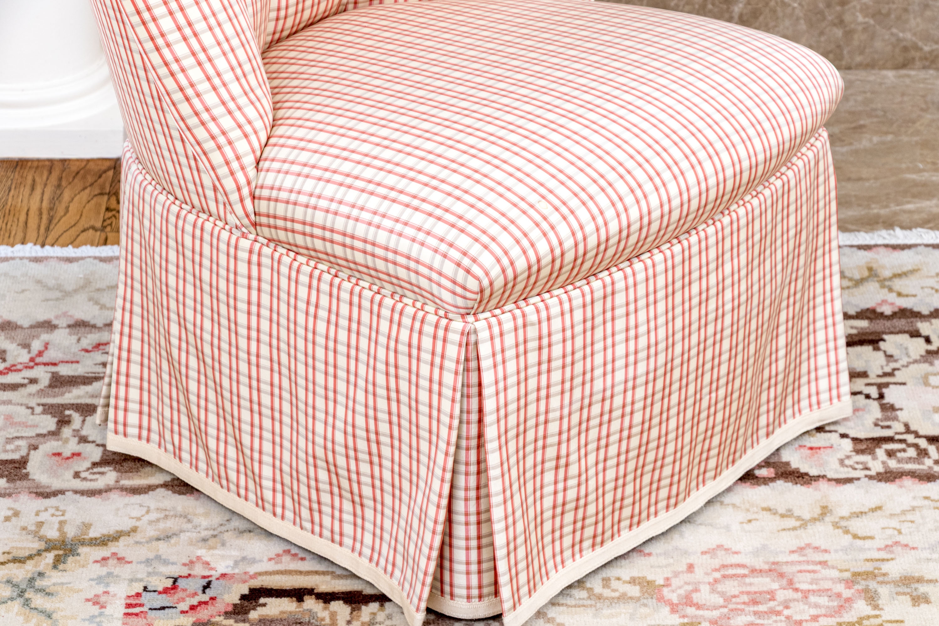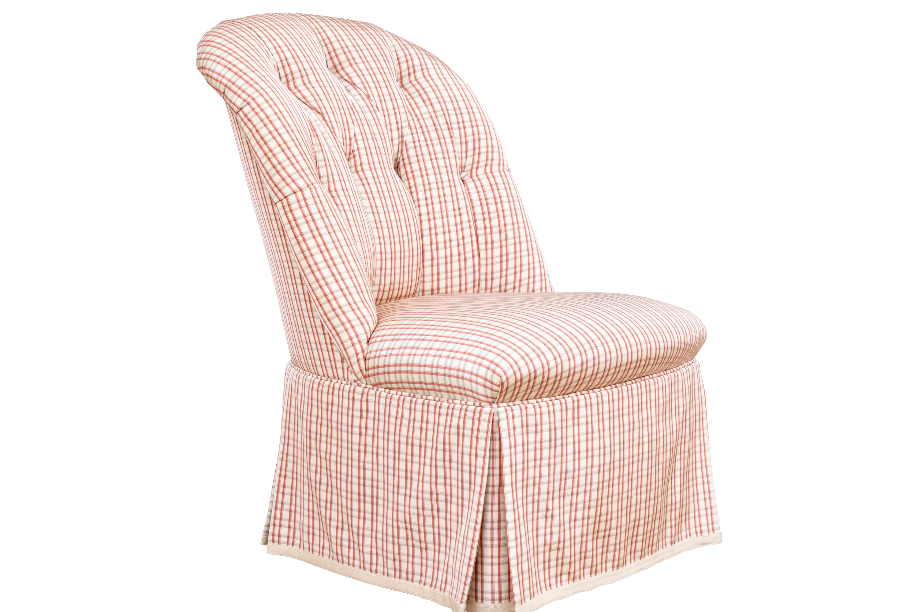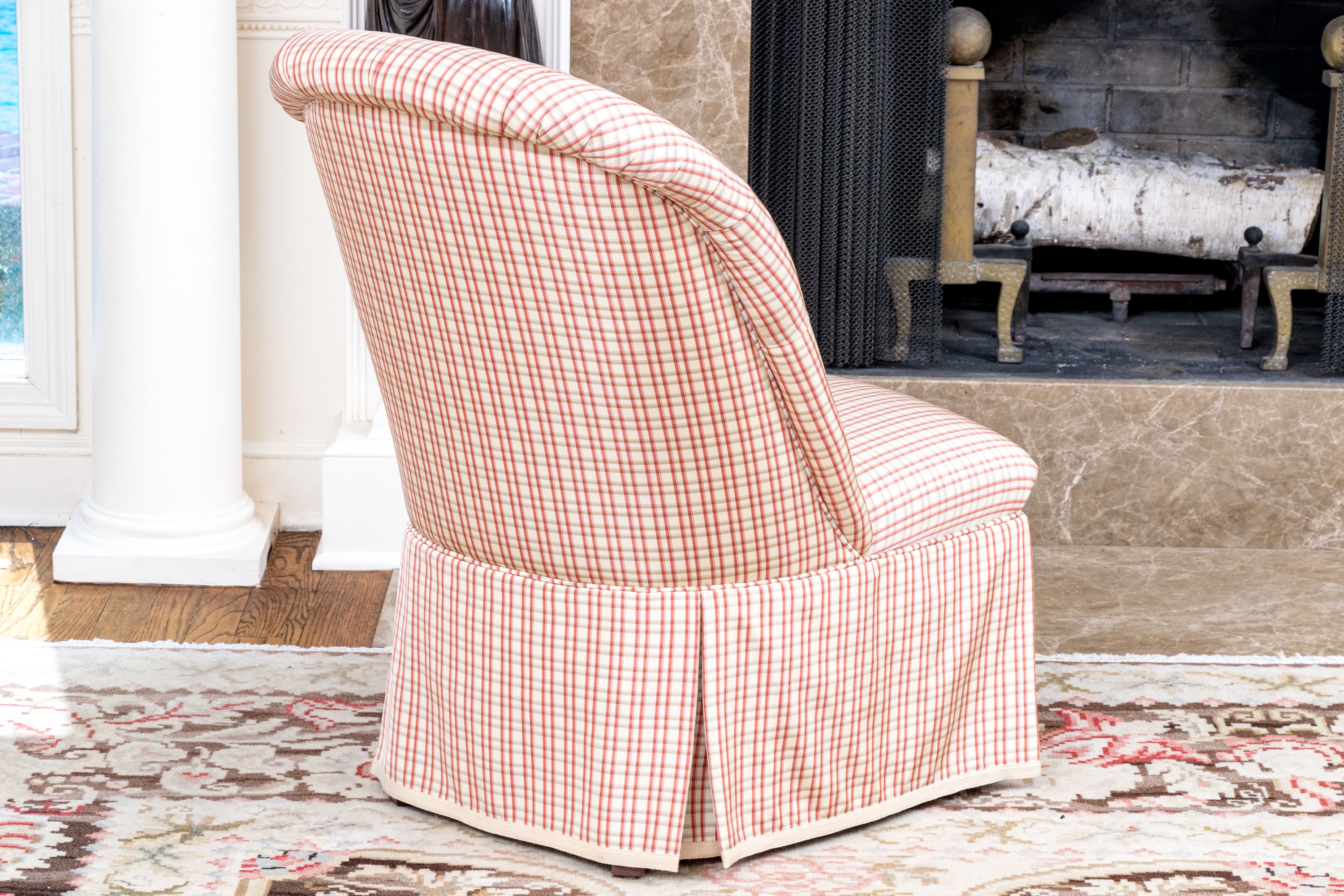 An impeccably upholstered diminutive Slipper Chair on four legs and apron to conceal with trim bands to the base. The uphosltered chair with rolled and tufted seat back.