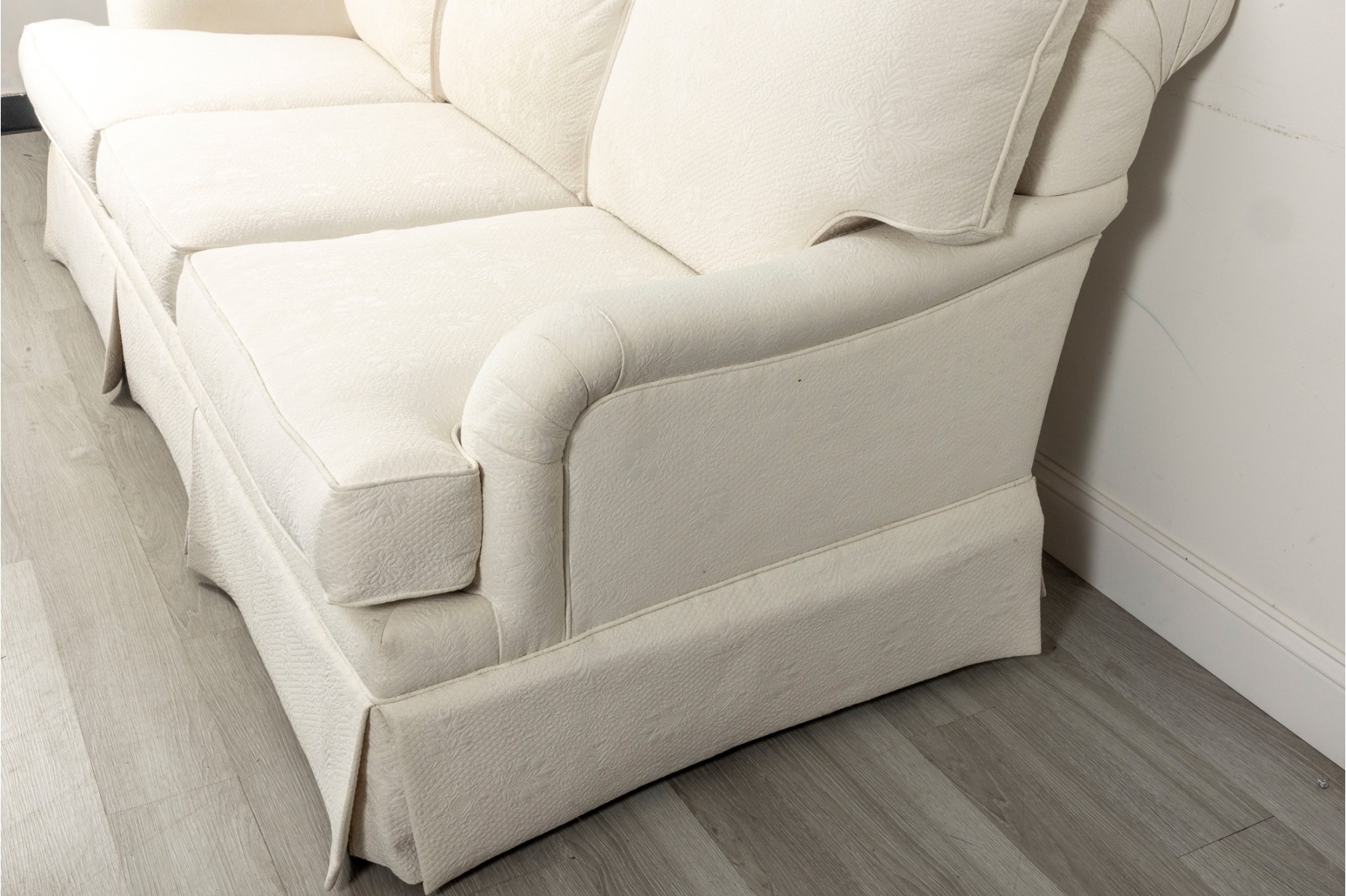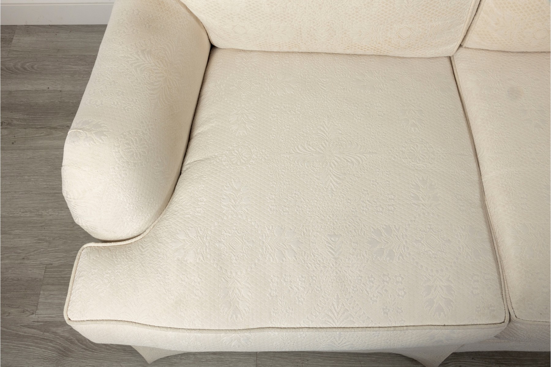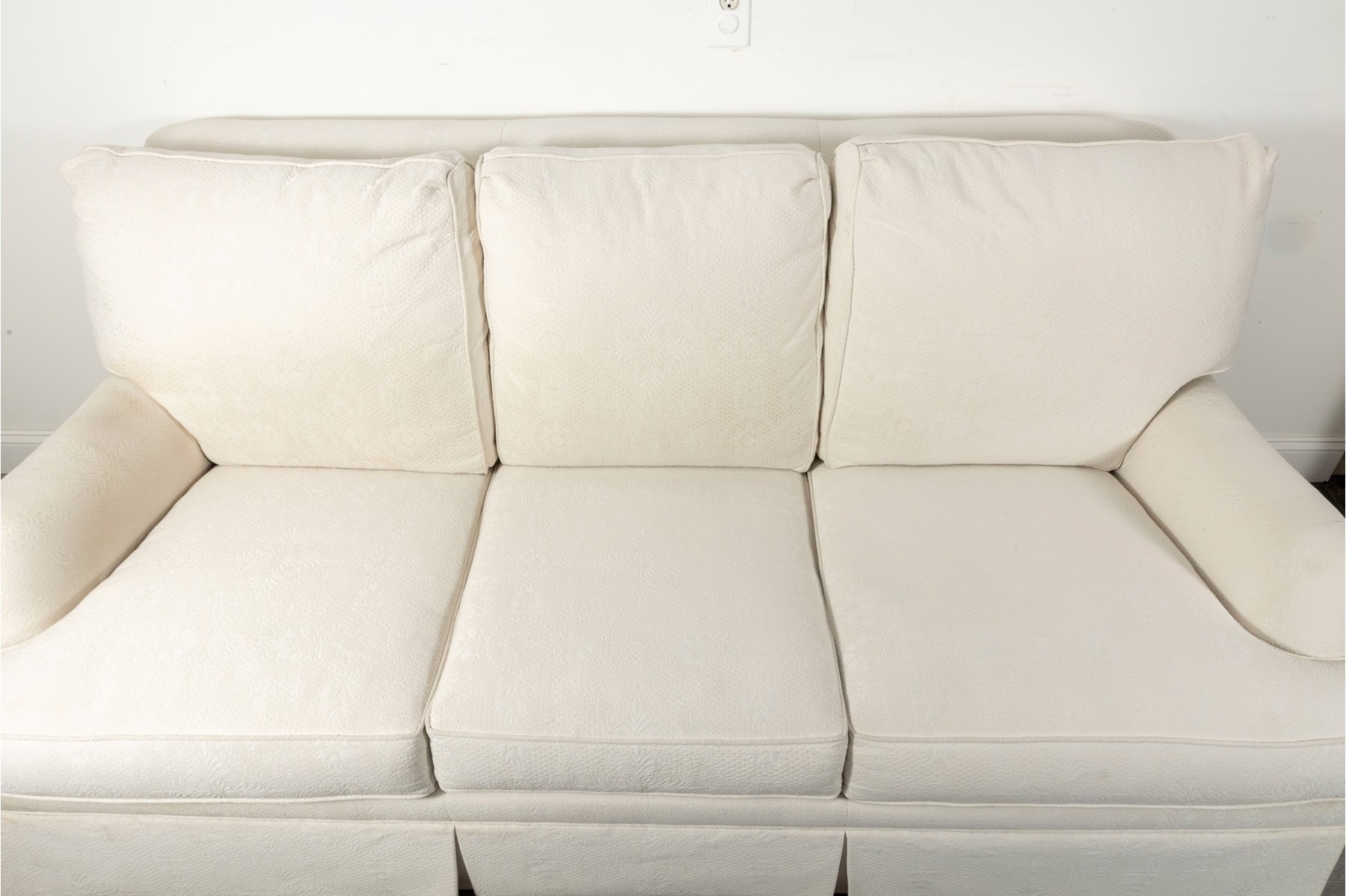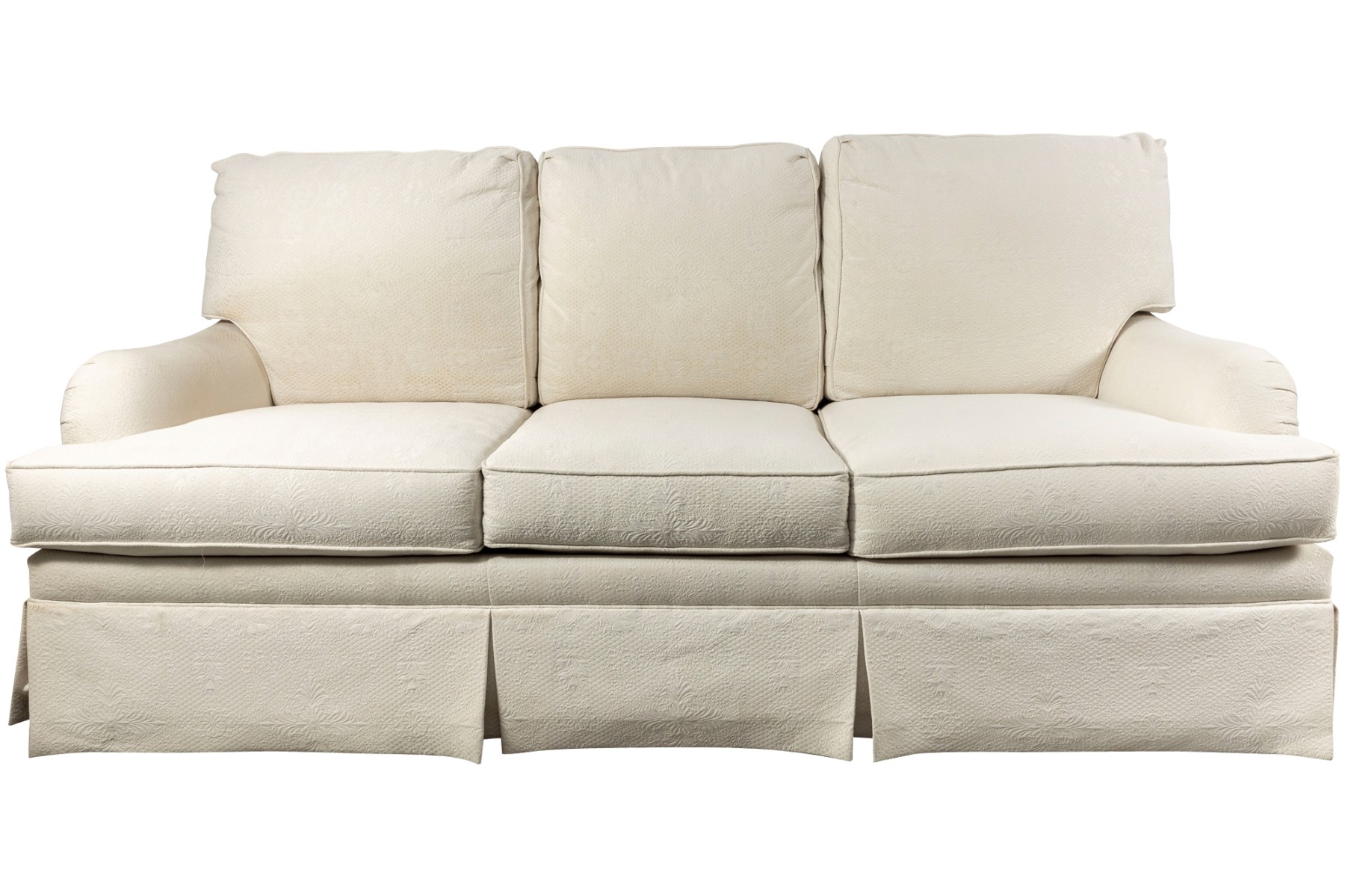 A large, three cushion Ethan Allen sofa with custom ivory white upholstery threaded with indistinct floral patterns. Cushioned with their Featherblend® filling, deep-seat cushions with thick piping provide a relaxing lounging experience.