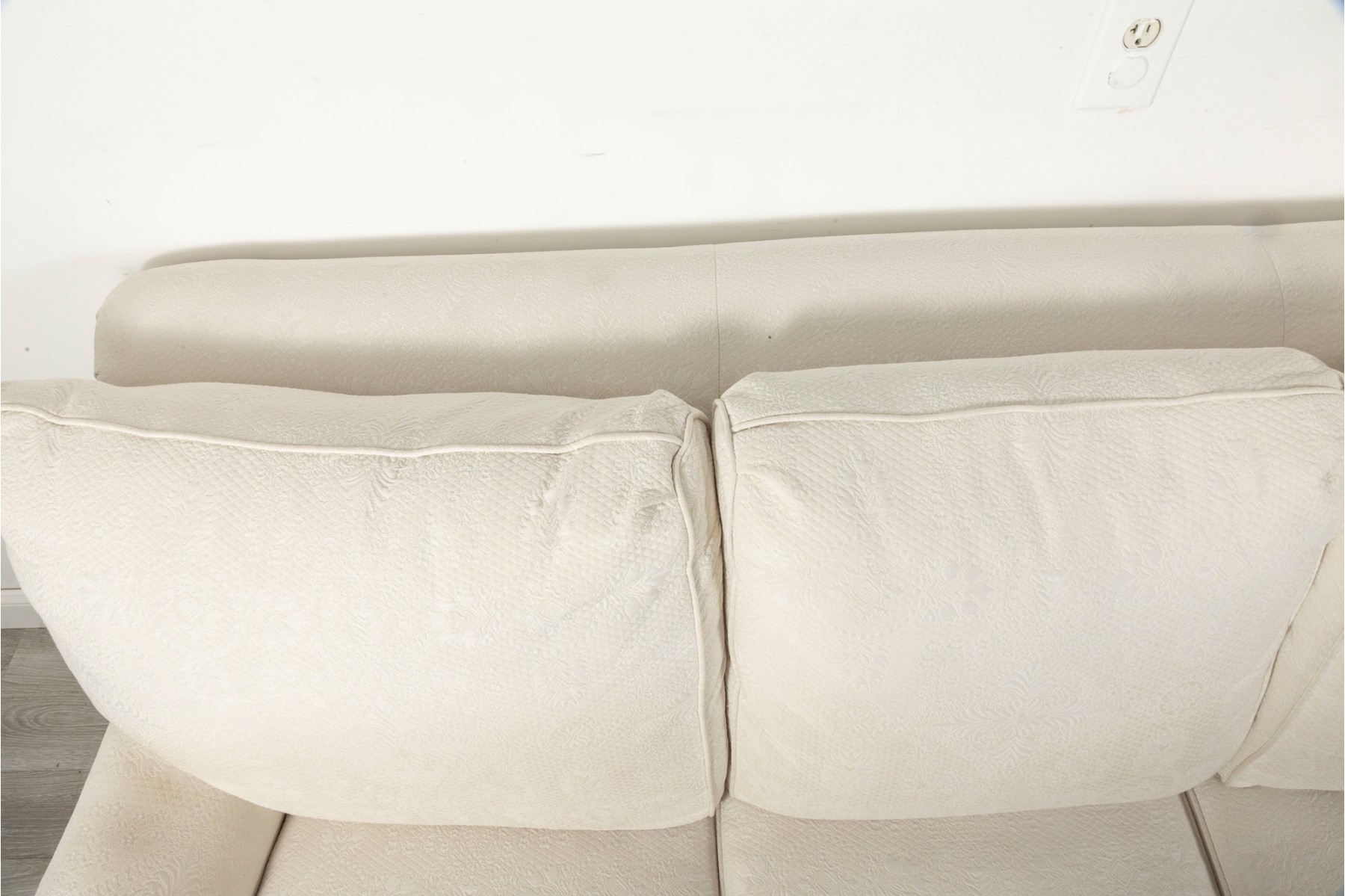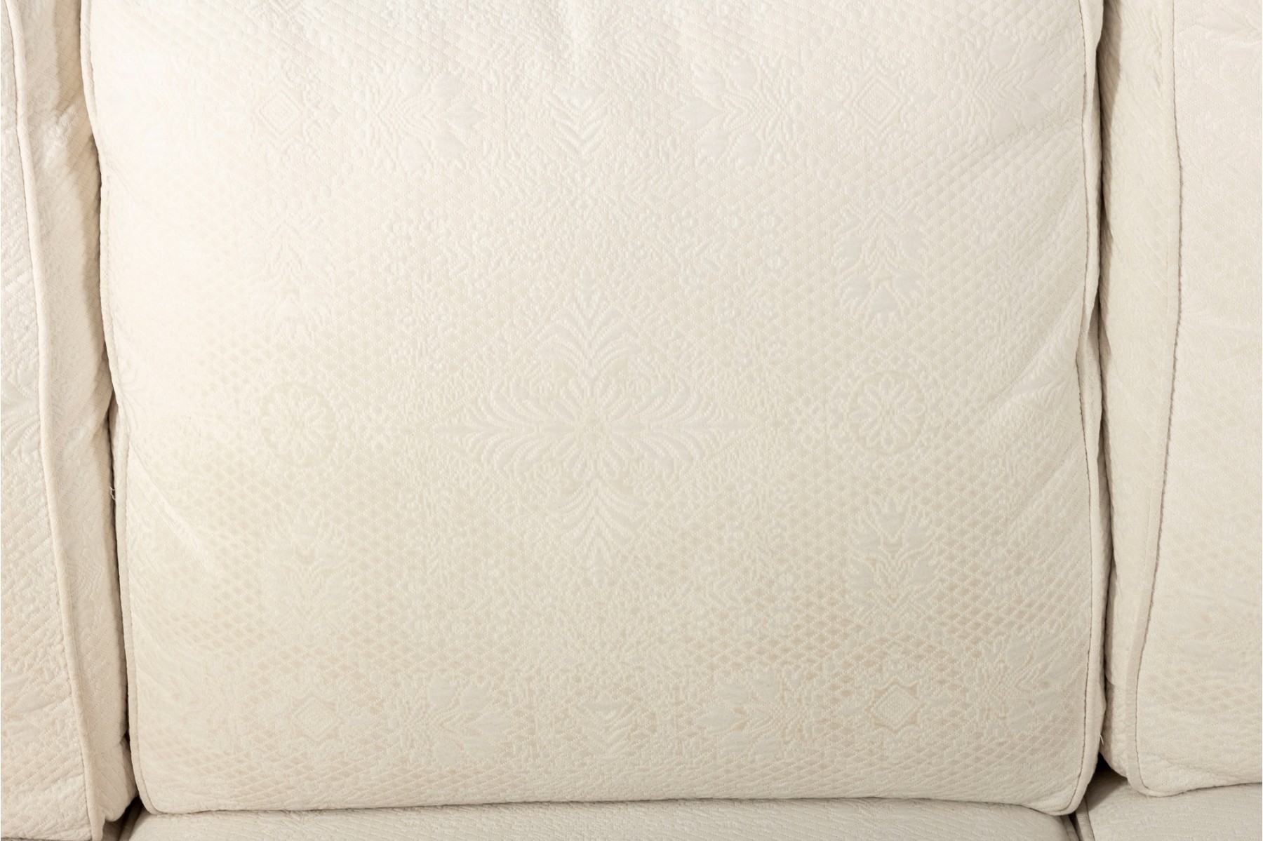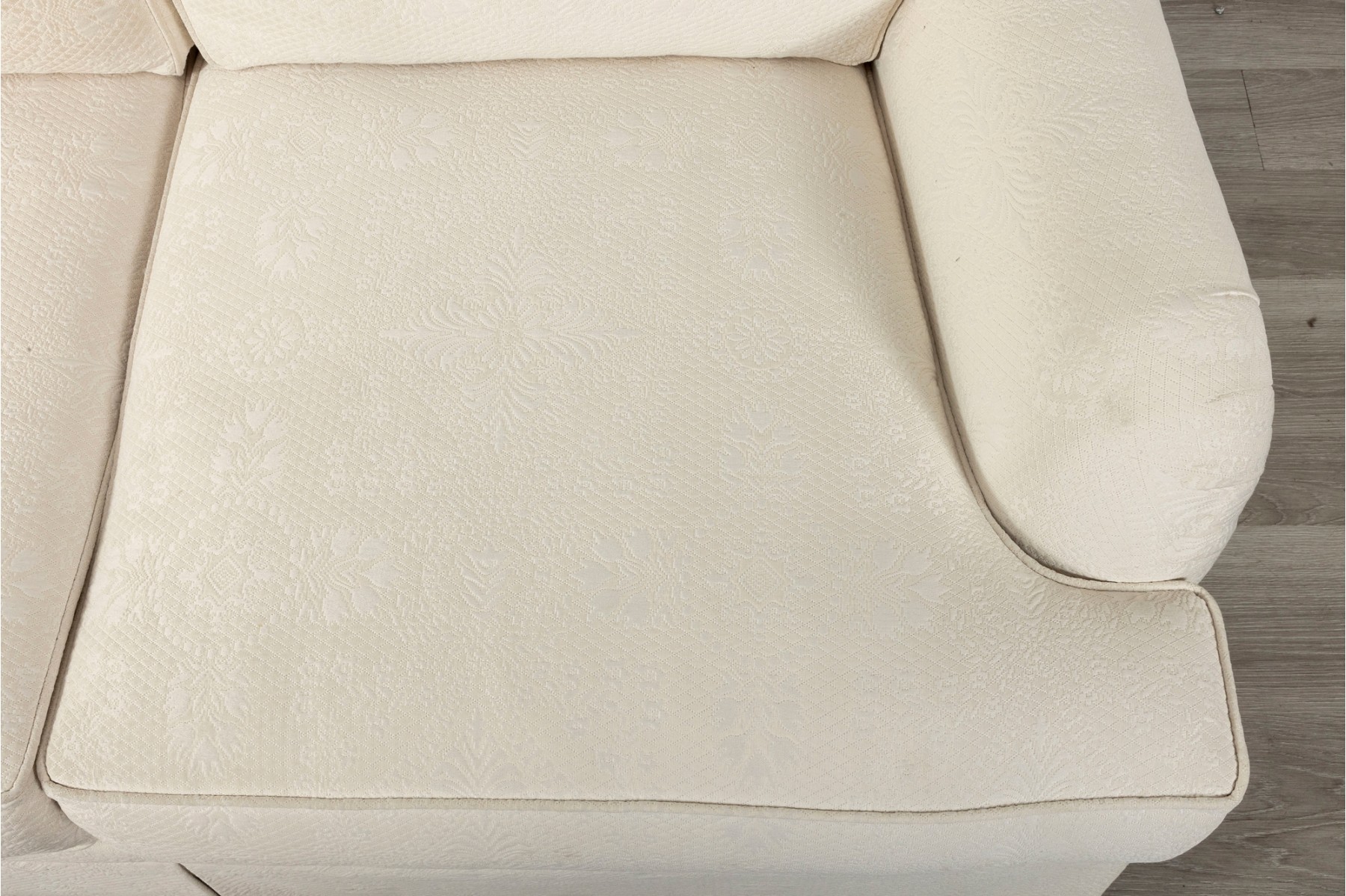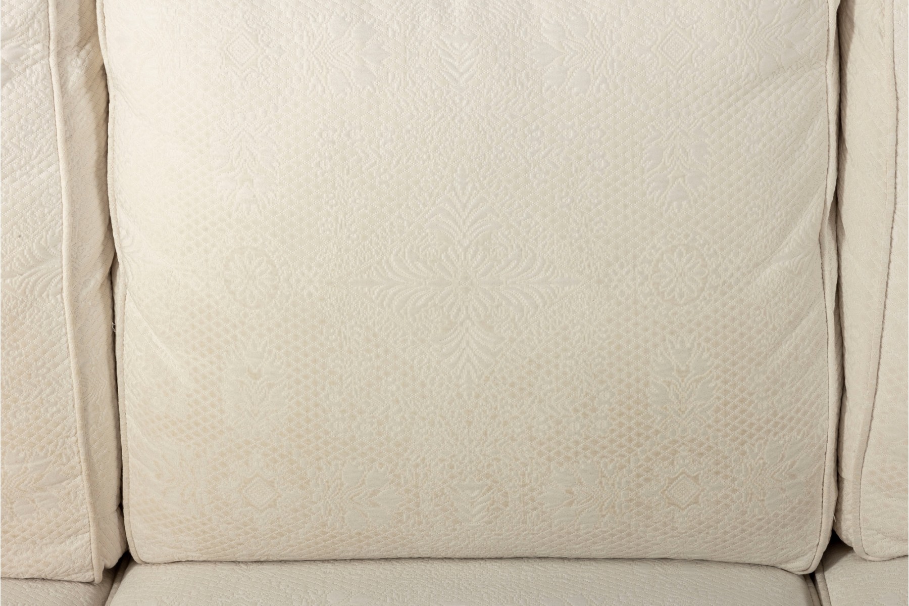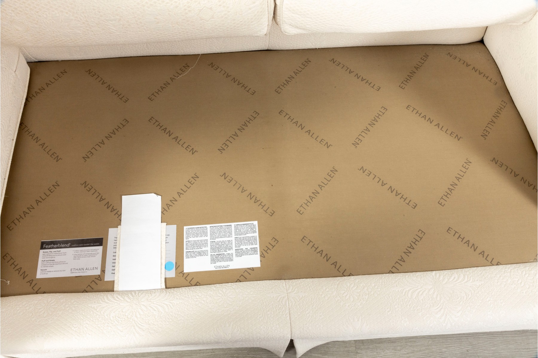 A large, three cushion Ethan Allen sofa with custom ivory white upholstery threaded with indistinct floral patterns. Cushioned with their Featherblend® filling, deep-seat cushions with thick piping provide a relaxing lounging experience.