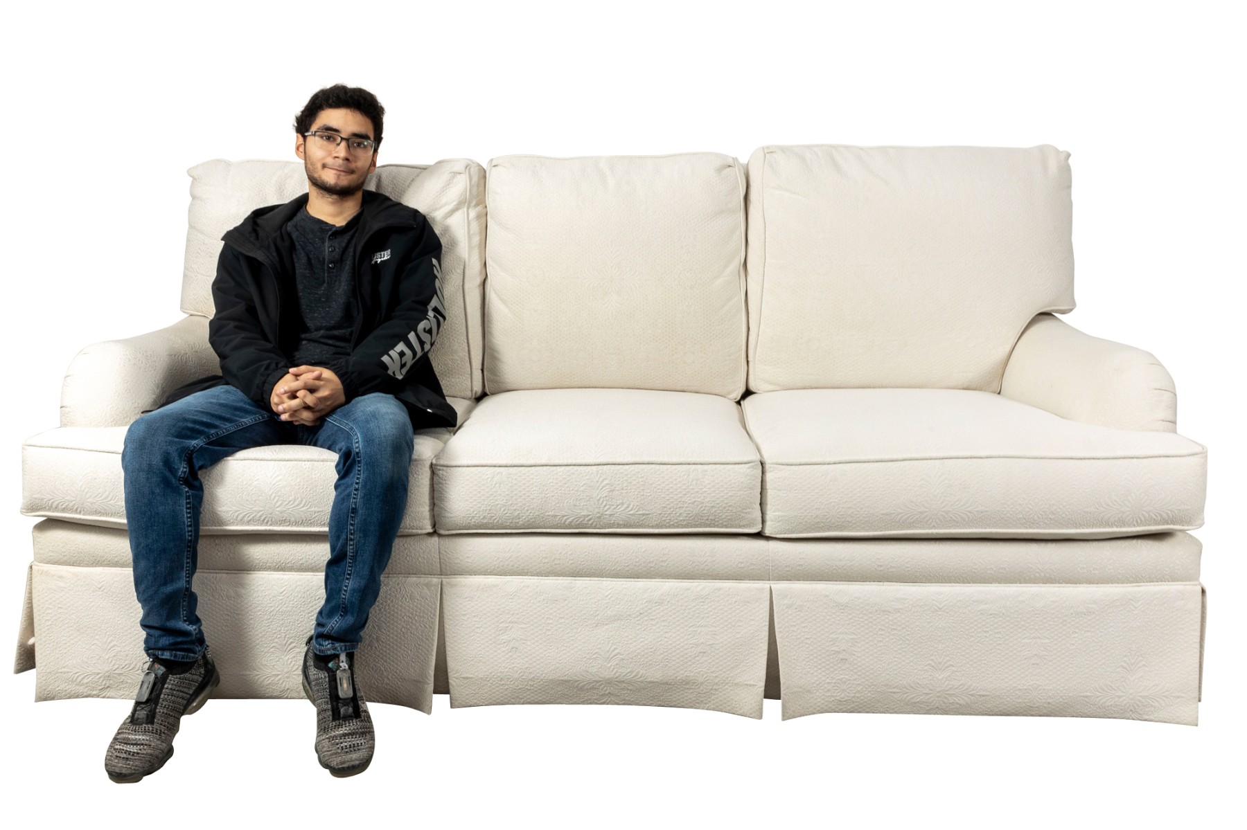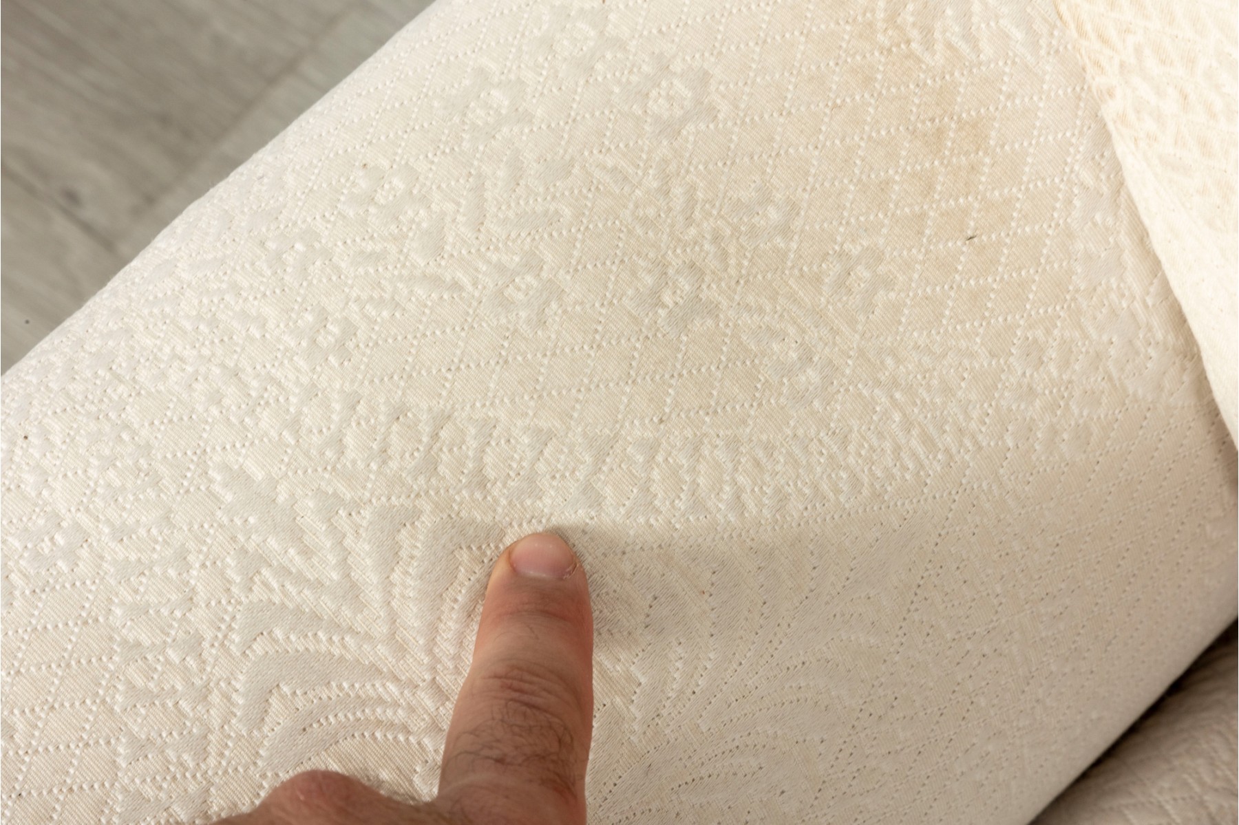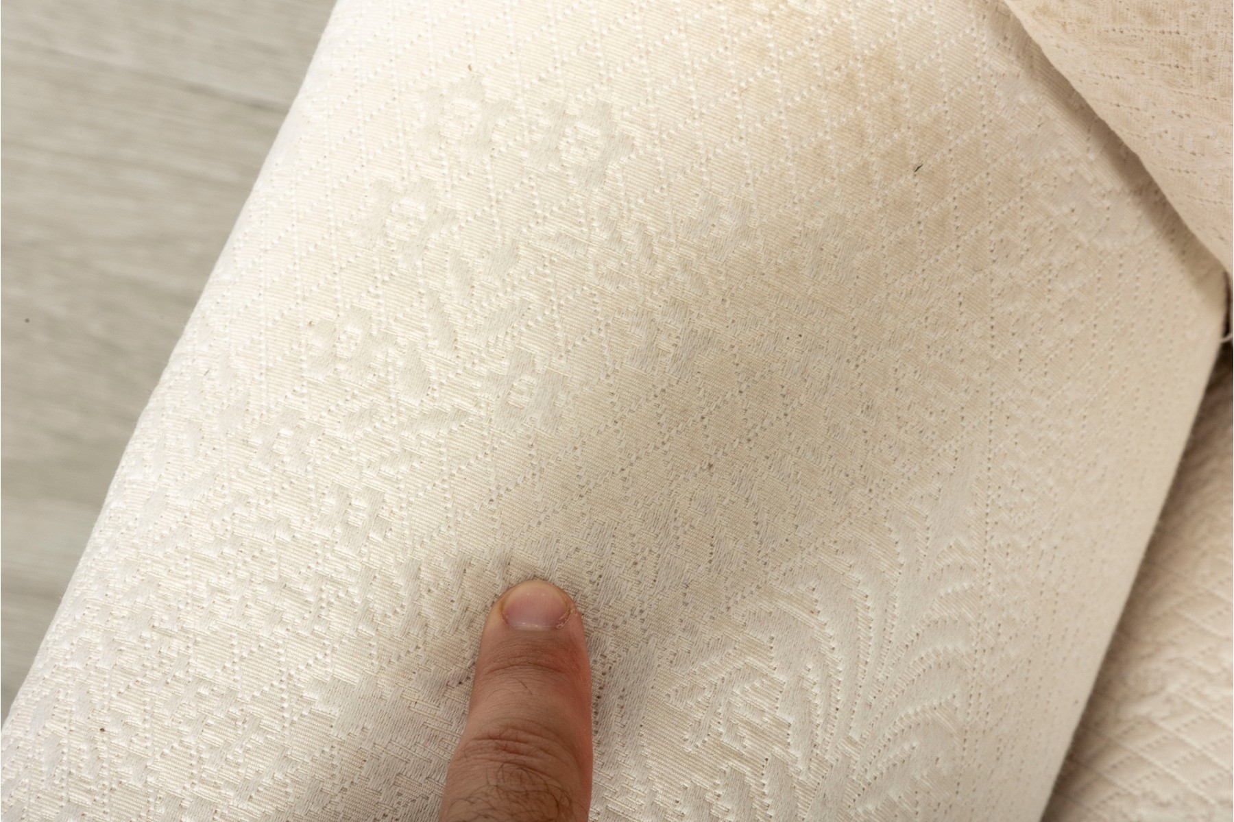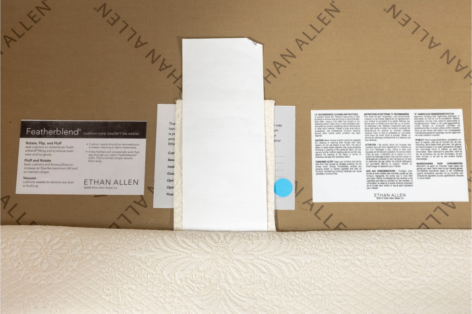 A large, three cushion Ethan Allen sofa with custom ivory white upholstery threaded with indistinct floral patterns. Cushioned with their Featherblend® filling, deep-seat cushions with thick piping provide a relaxing lounging experience.