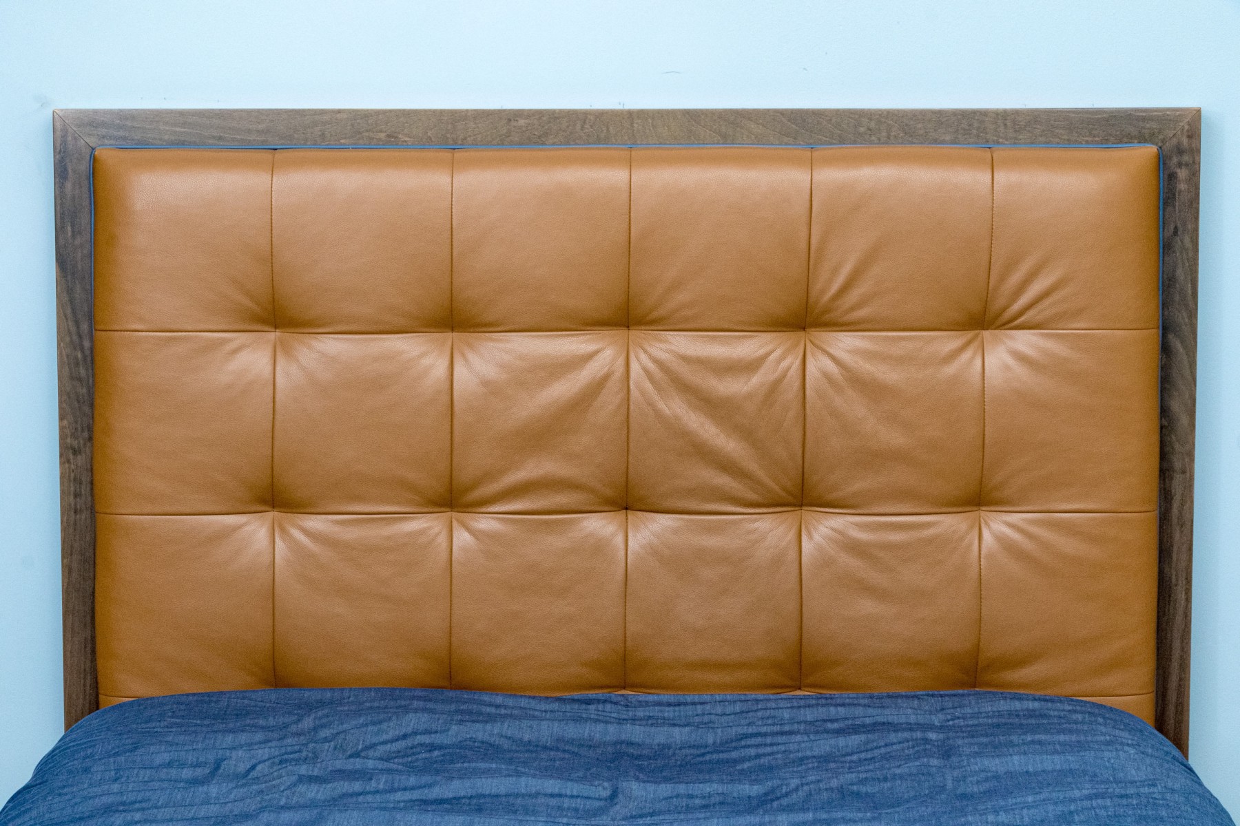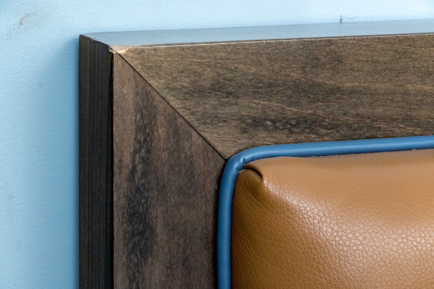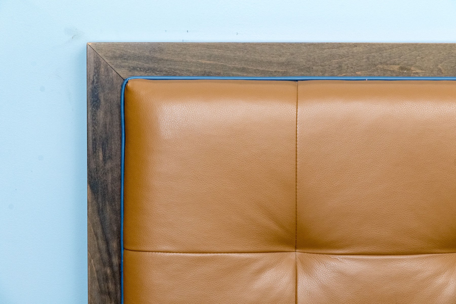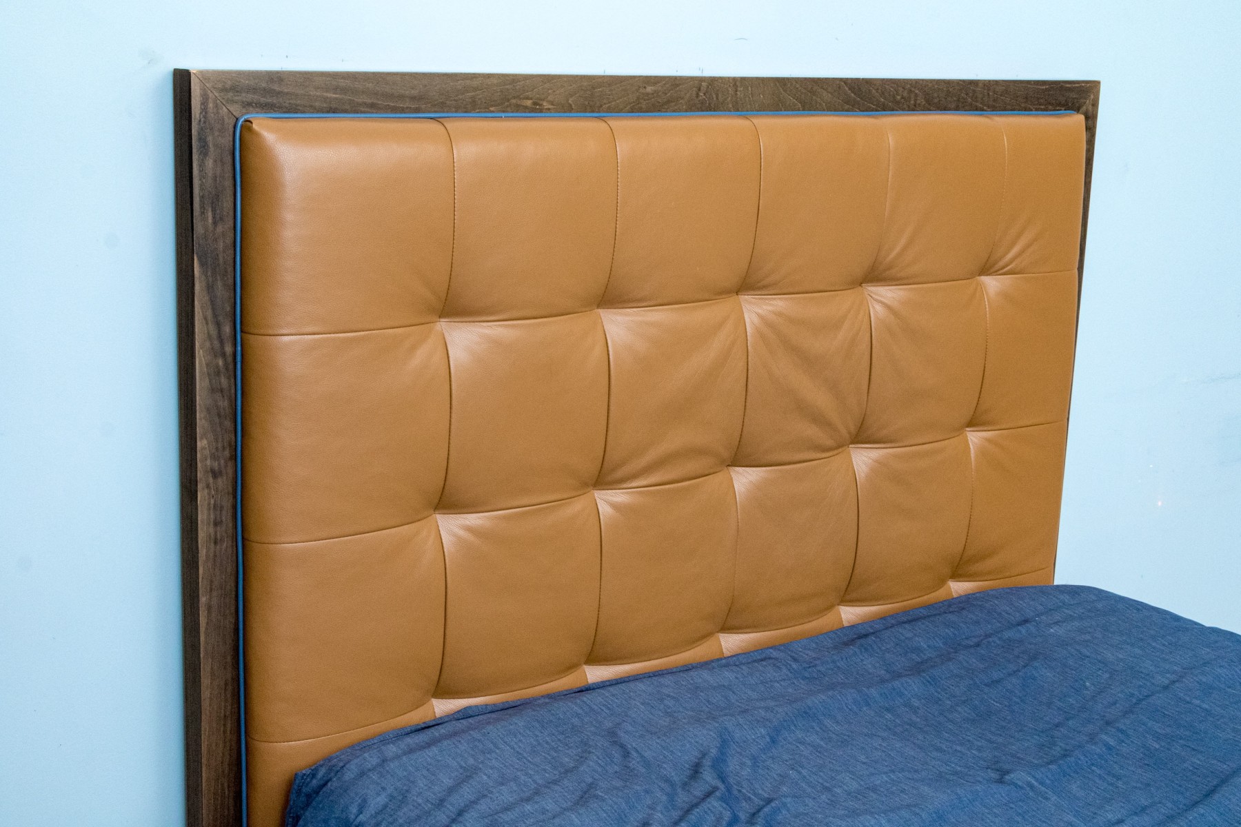 Ful size headboard with wood frame and modern tufted faux leather. Blue faux leather contrast welting. Mattress & linens not included.