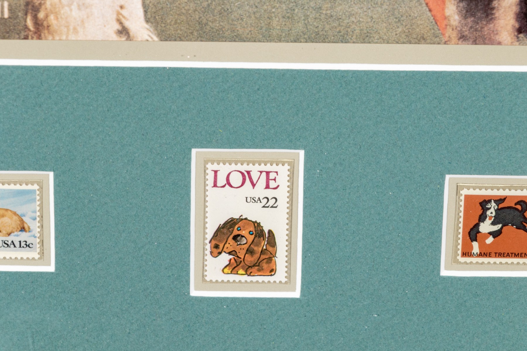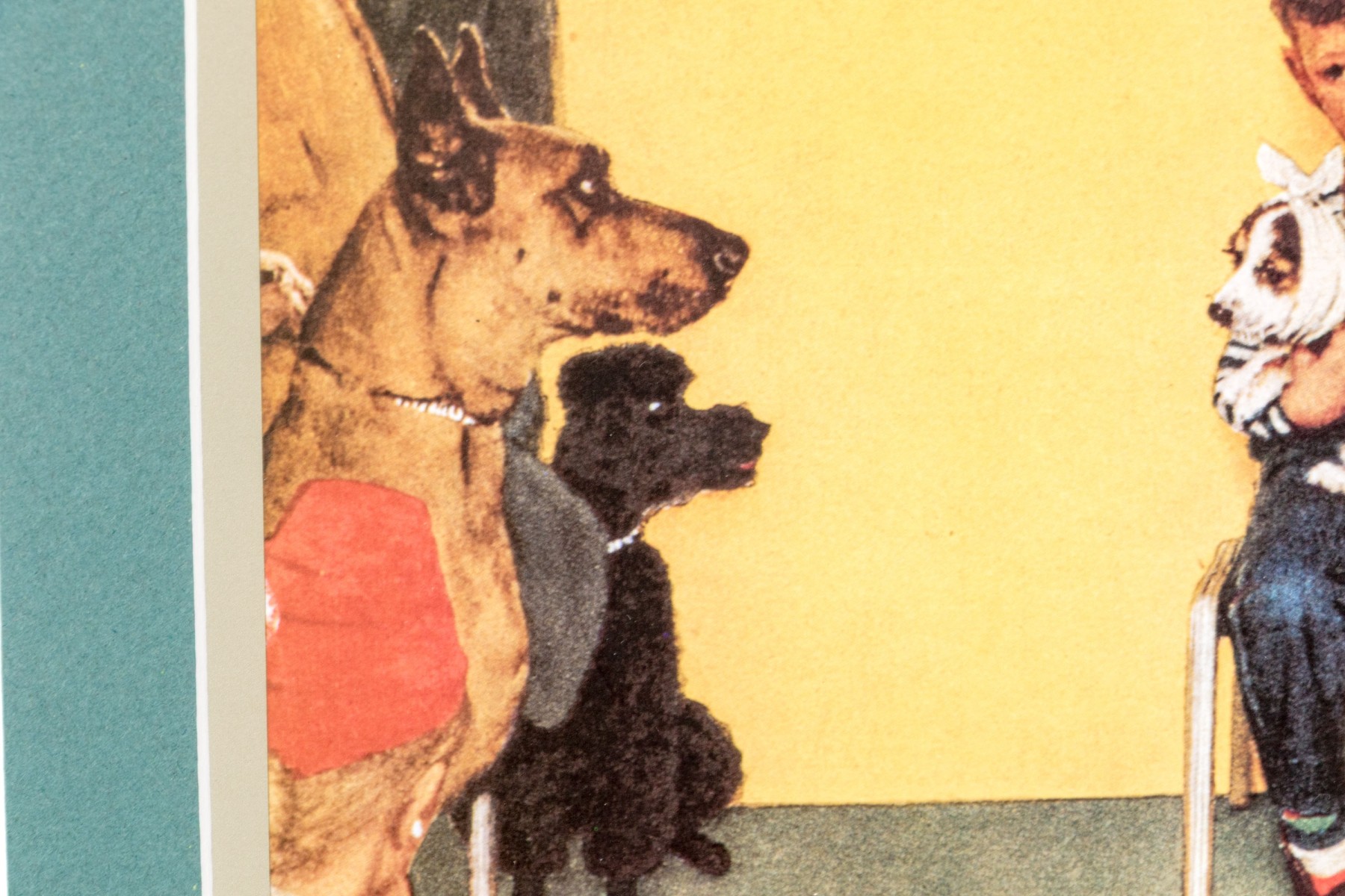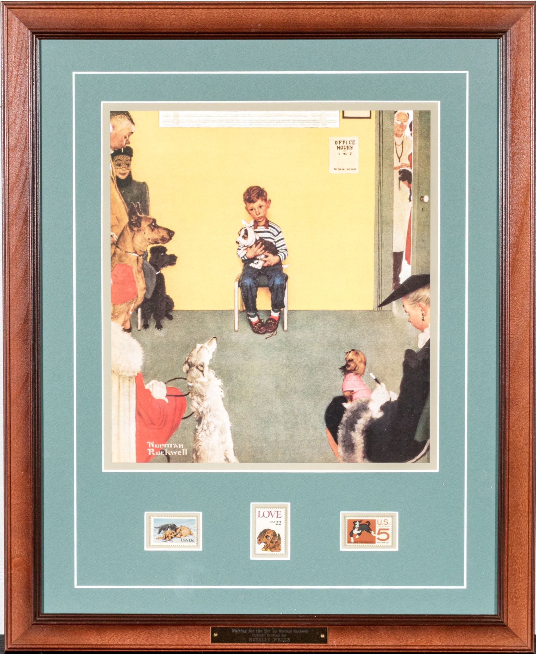 Framed decorative print of Norman Rockwell's "Waiting for the Vet" with three dog related stamps.