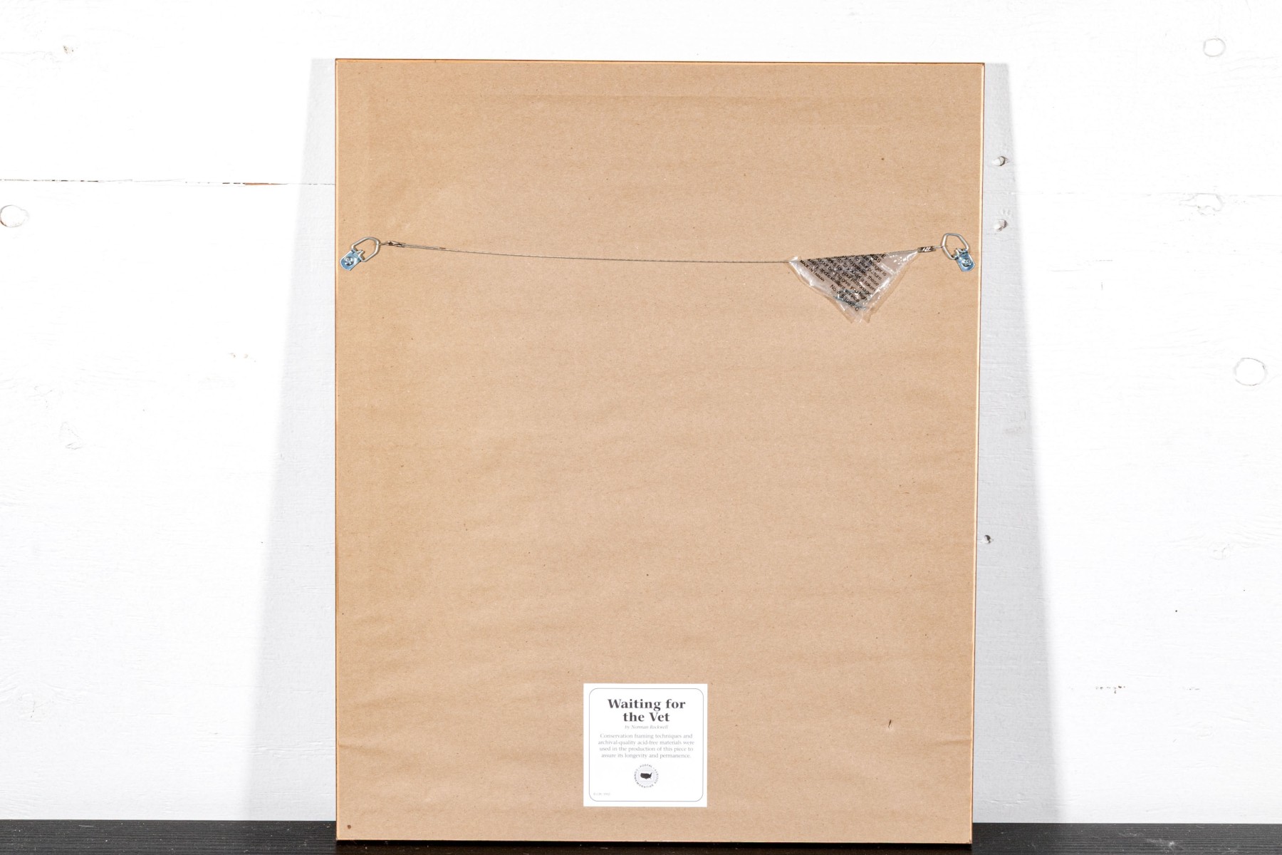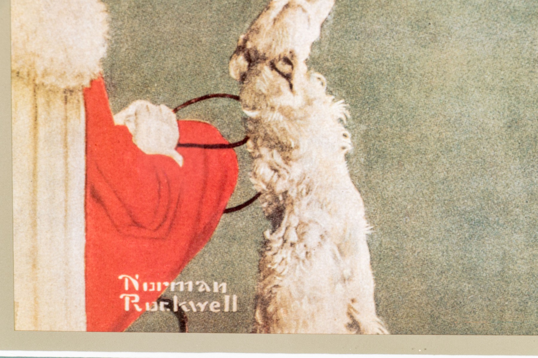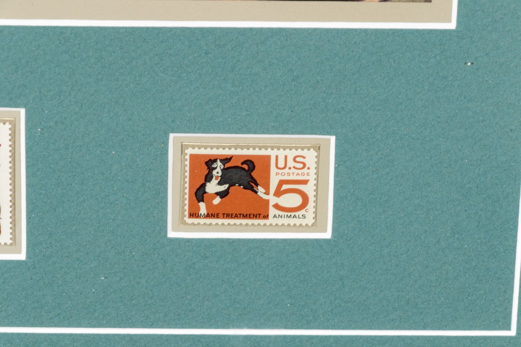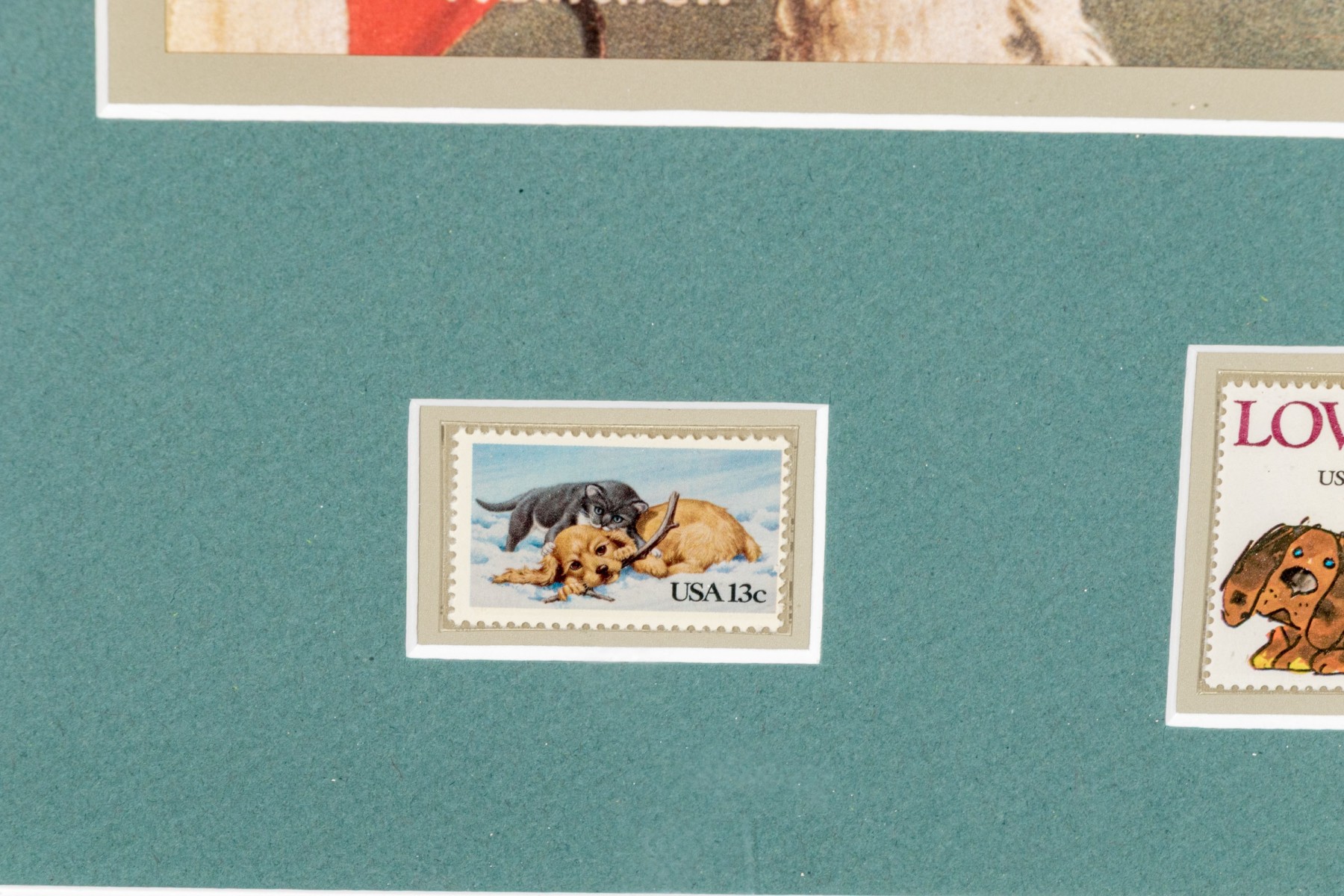 Framed decorative print of Norman Rockwell's "Waiting for the Vet" with three dog related stamps.