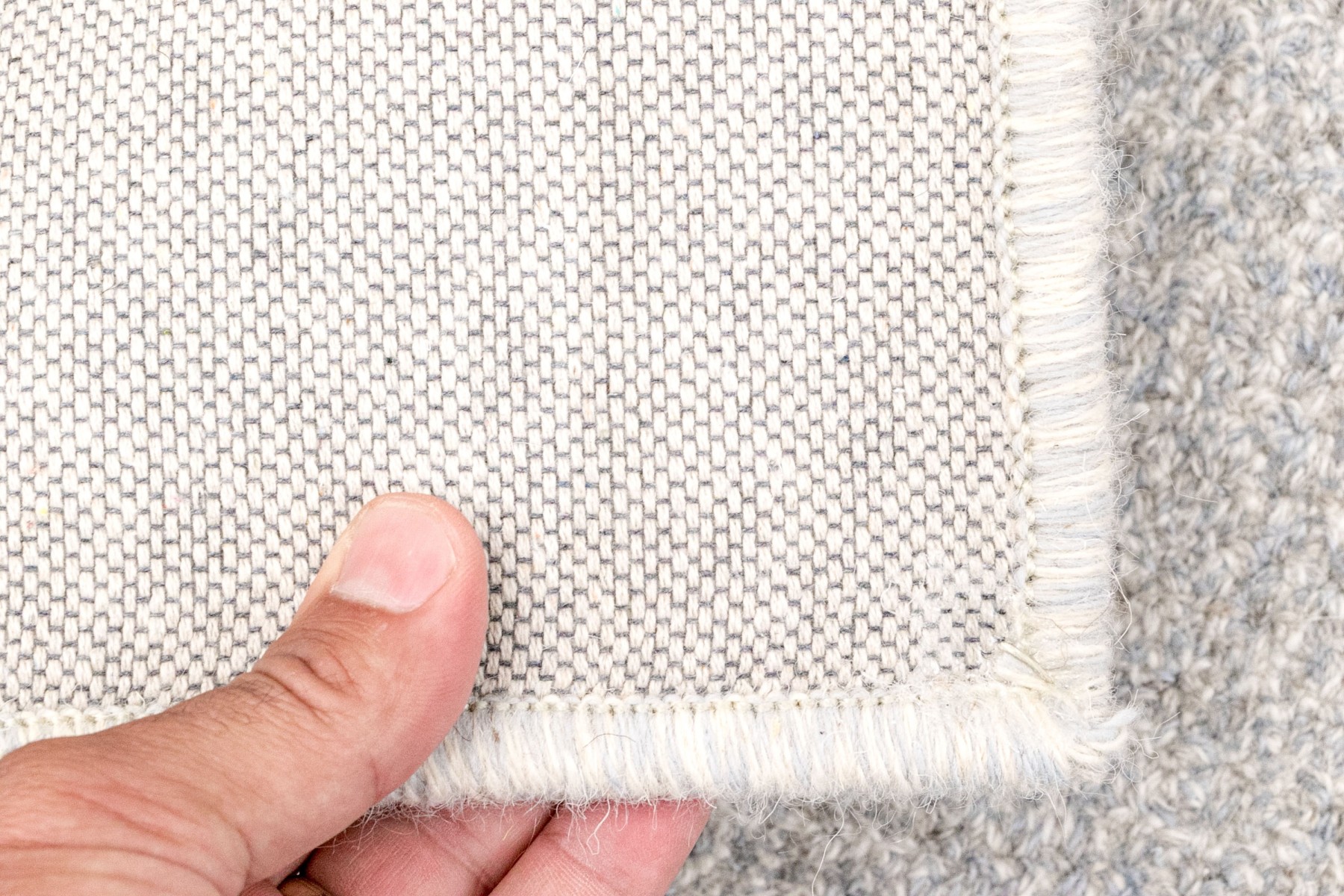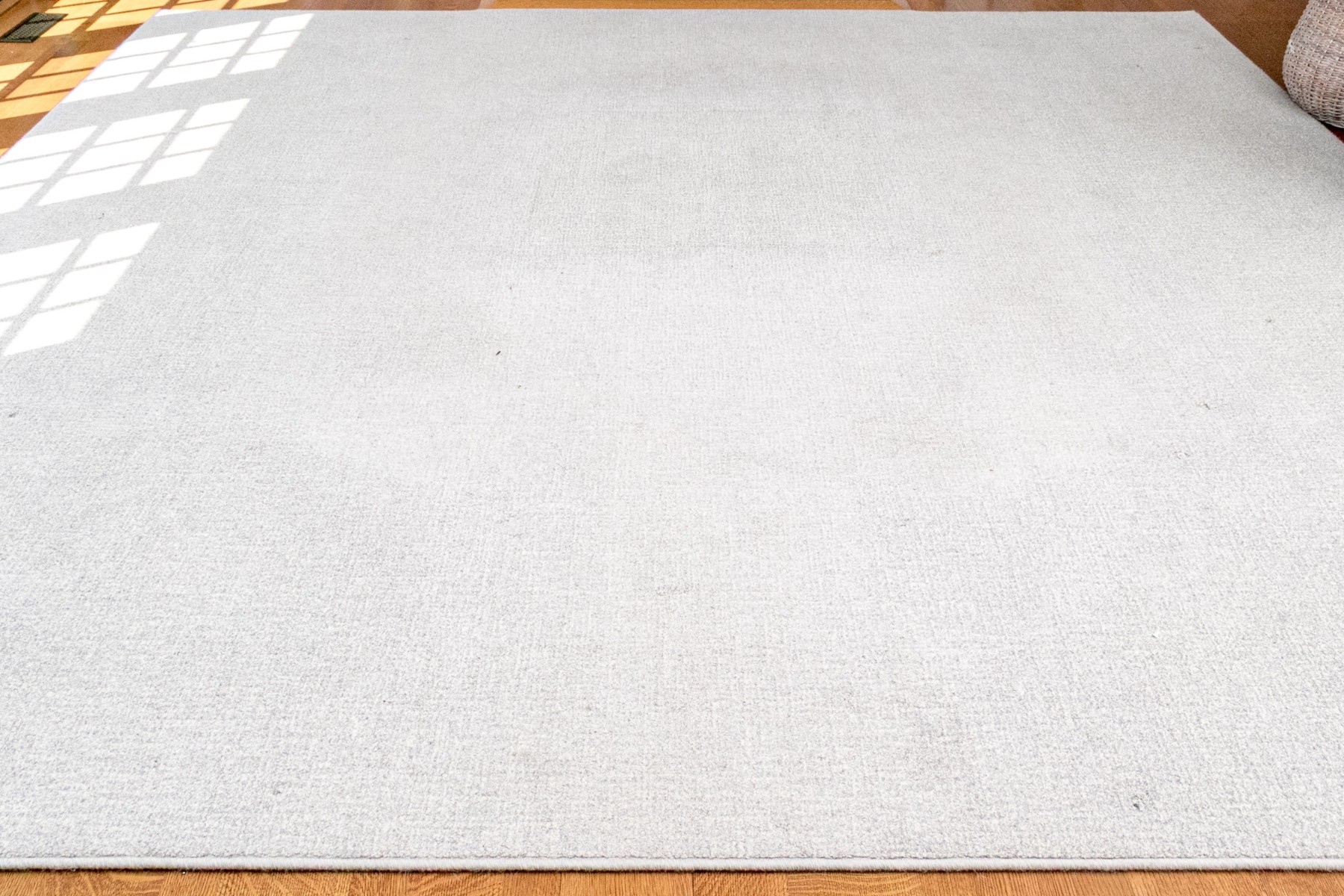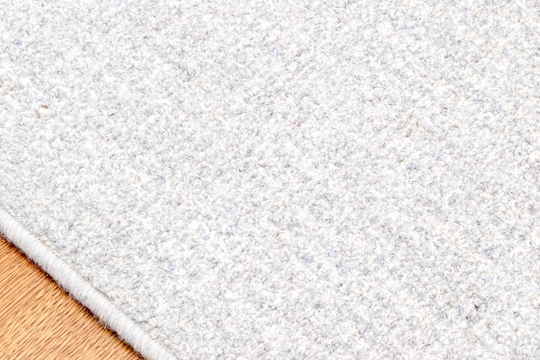A gorgeous custom hand-loomed wool area rug in gray with subtle cream white and pale blue undertones heathered for an understated, calming texture.