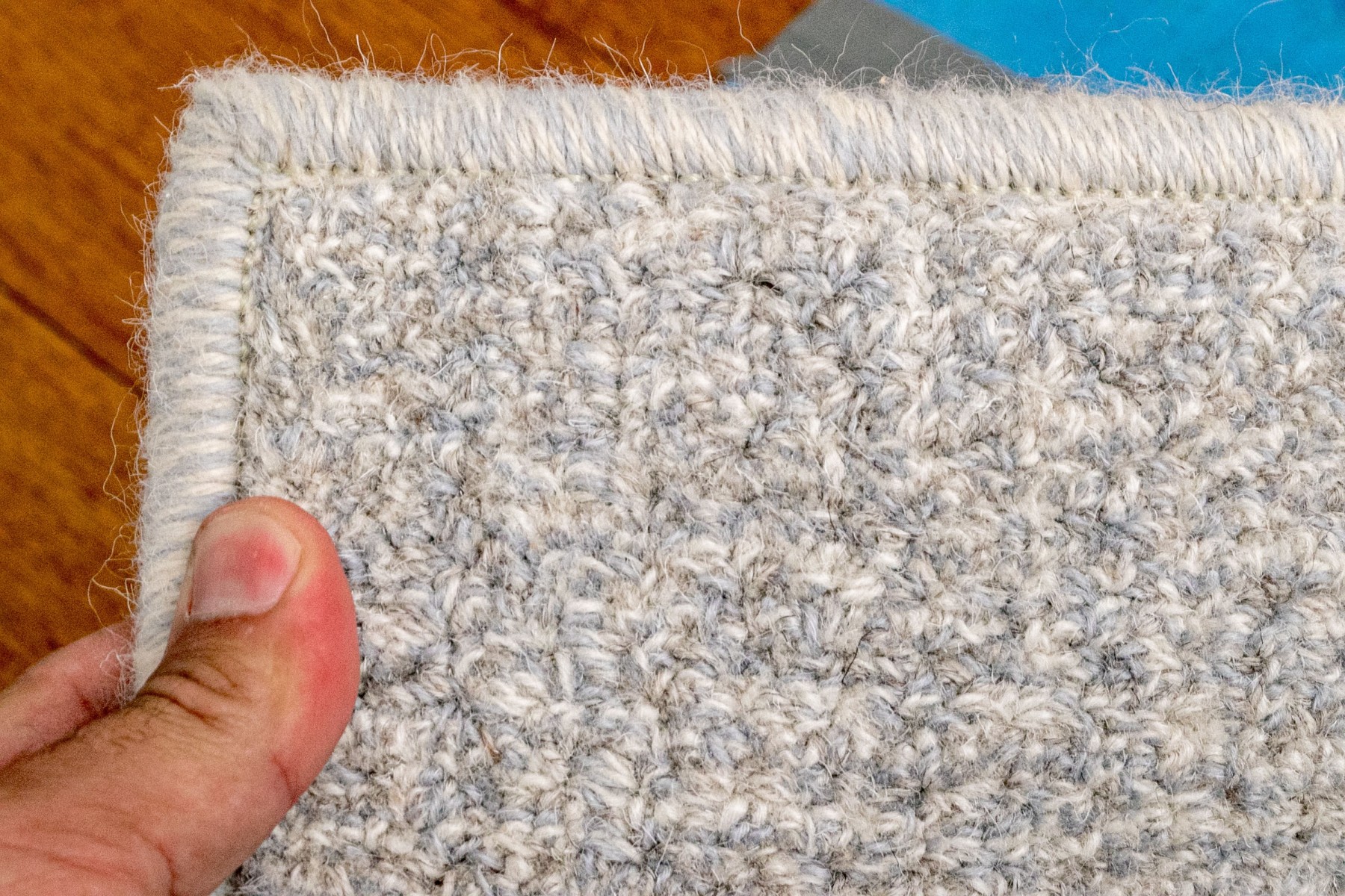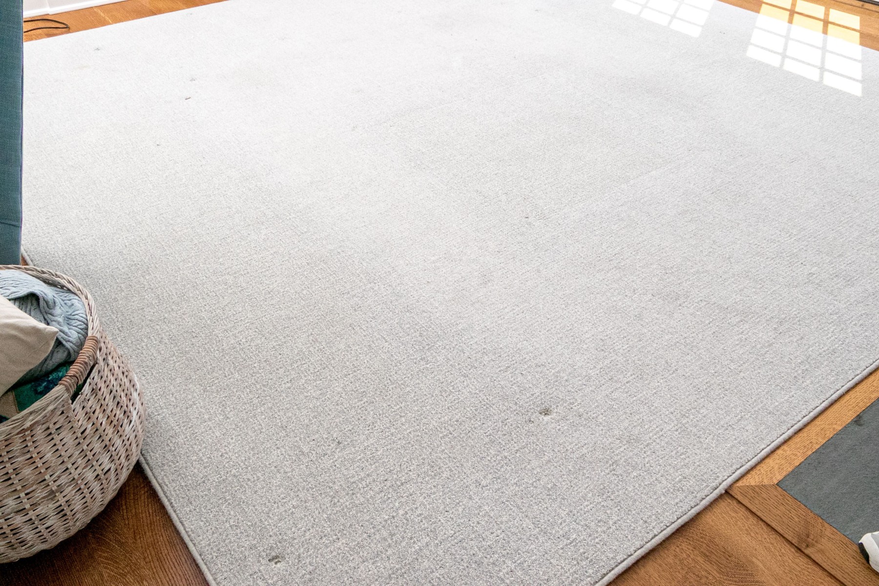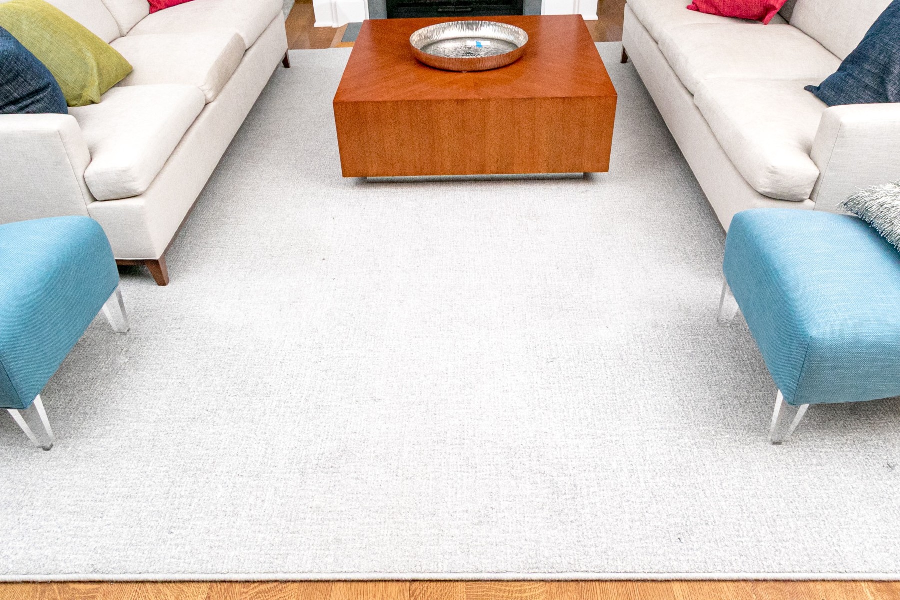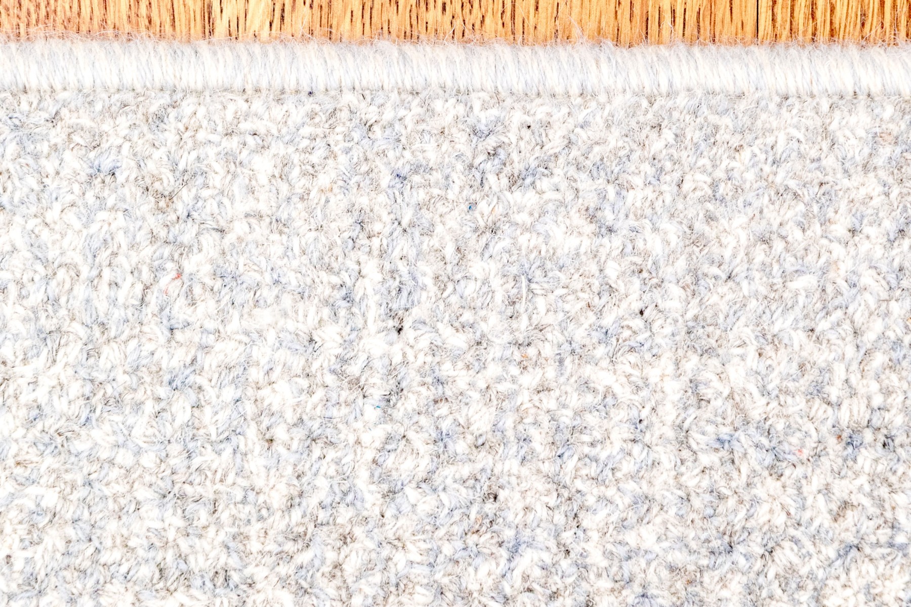 A gorgeous custom hand-loomed wool area rug in gray with subtle cream white and pale blue undertones heathered for an understated, calming texture.