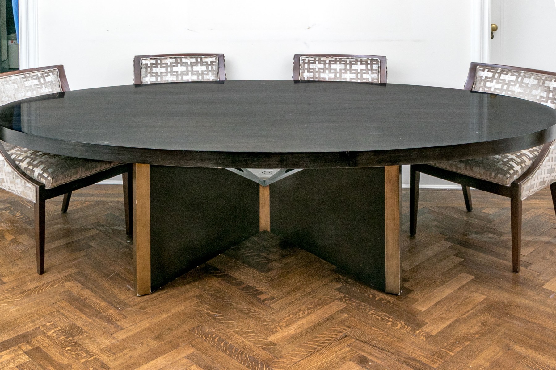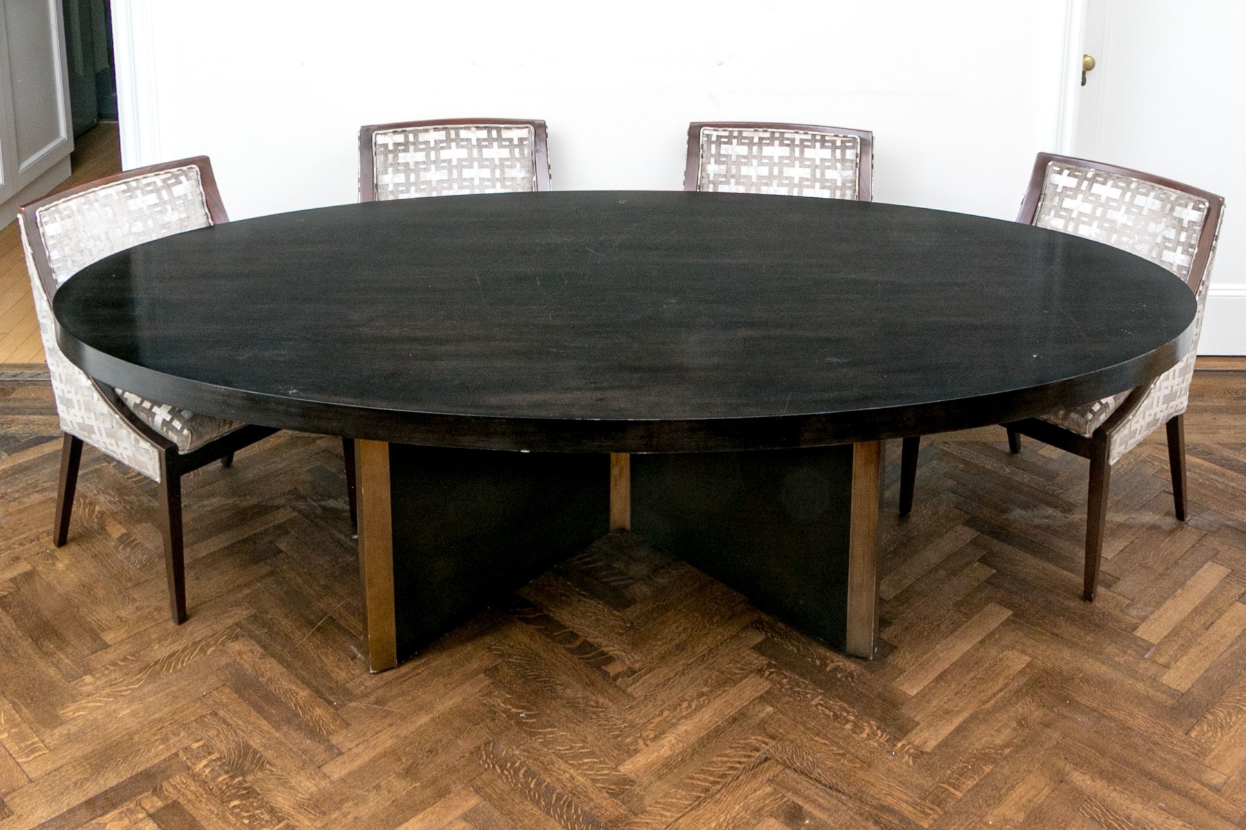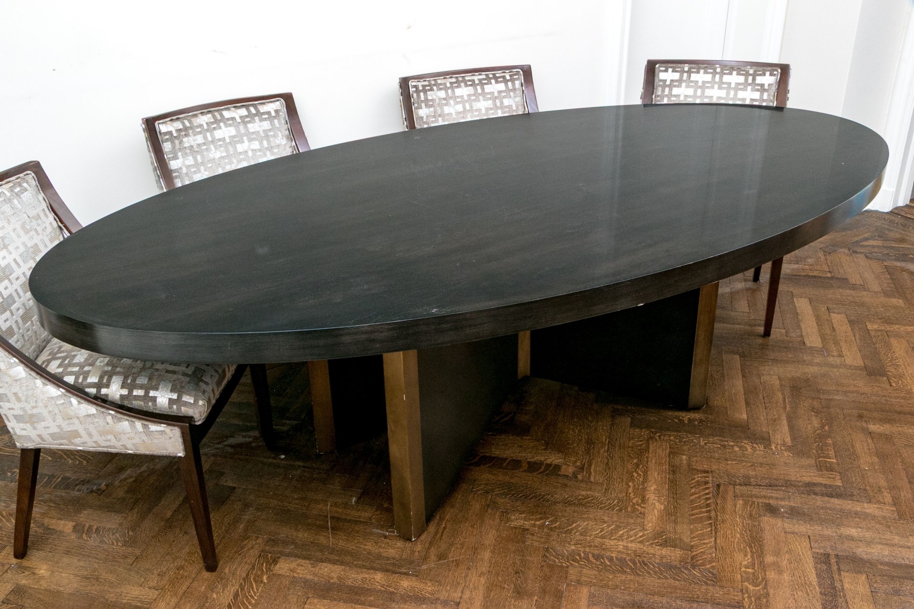 A gorgeous, high quality dining table featuring a thick oval tabletop in a rich ebonized finish. The tabletop is affixed to a stylish X-form pedestal with great mid-century and brutalist influence. The pedestal sport a similar ebonized finish with luxurious vertical gilt bands at the edges and waist.