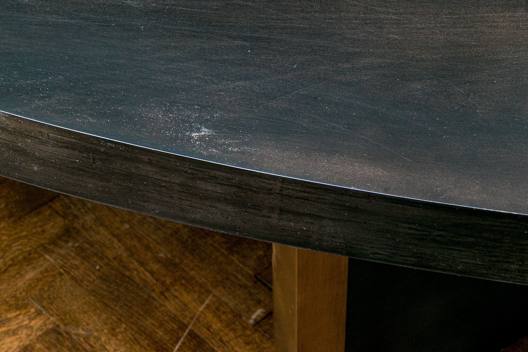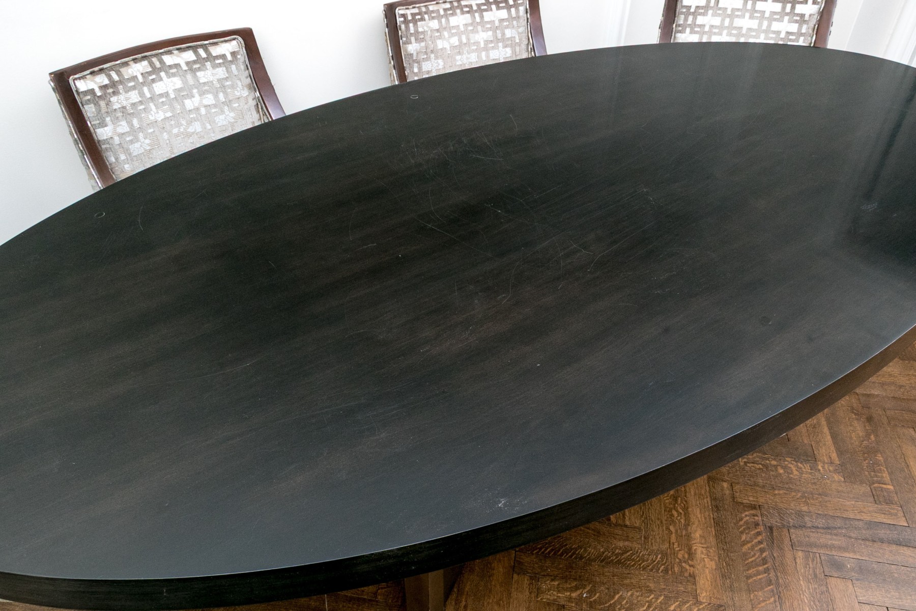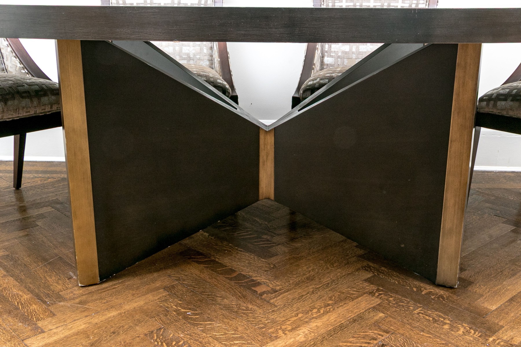 A gorgeous, high quality dining table featuring a thick oval tabletop in a rich ebonized finish. The tabletop is affixed to a stylish X-form pedestal with great mid-century and brutalist influence. The pedestal sport a similar ebonized finish with luxurious vertical gilt bands at the edges and waist.