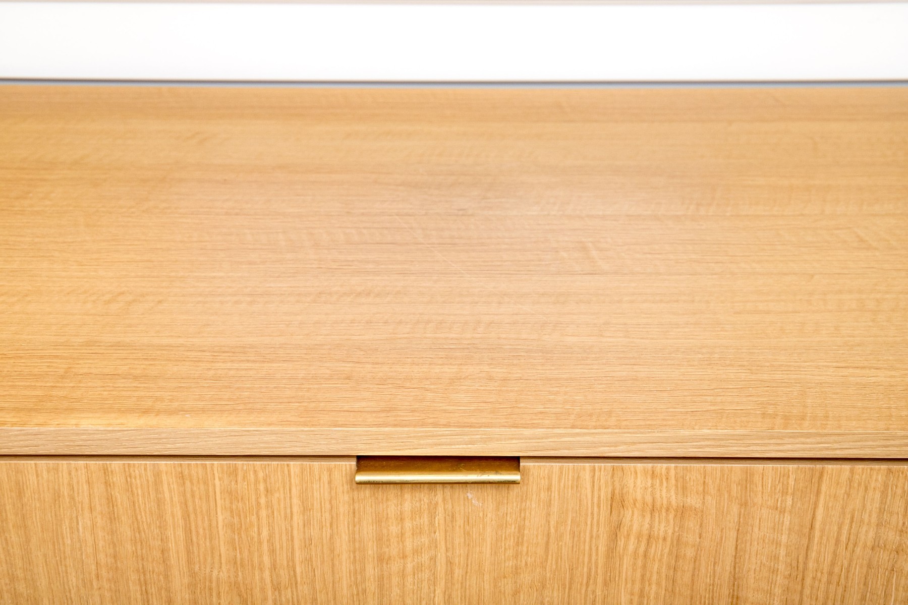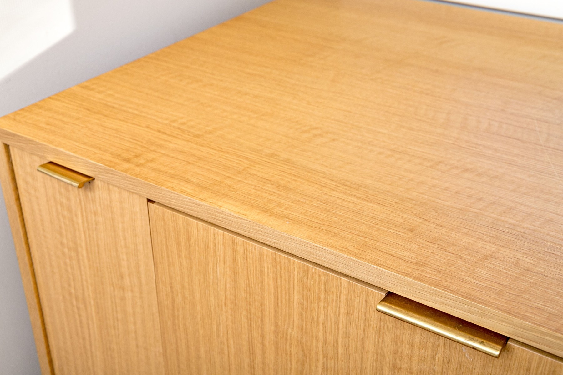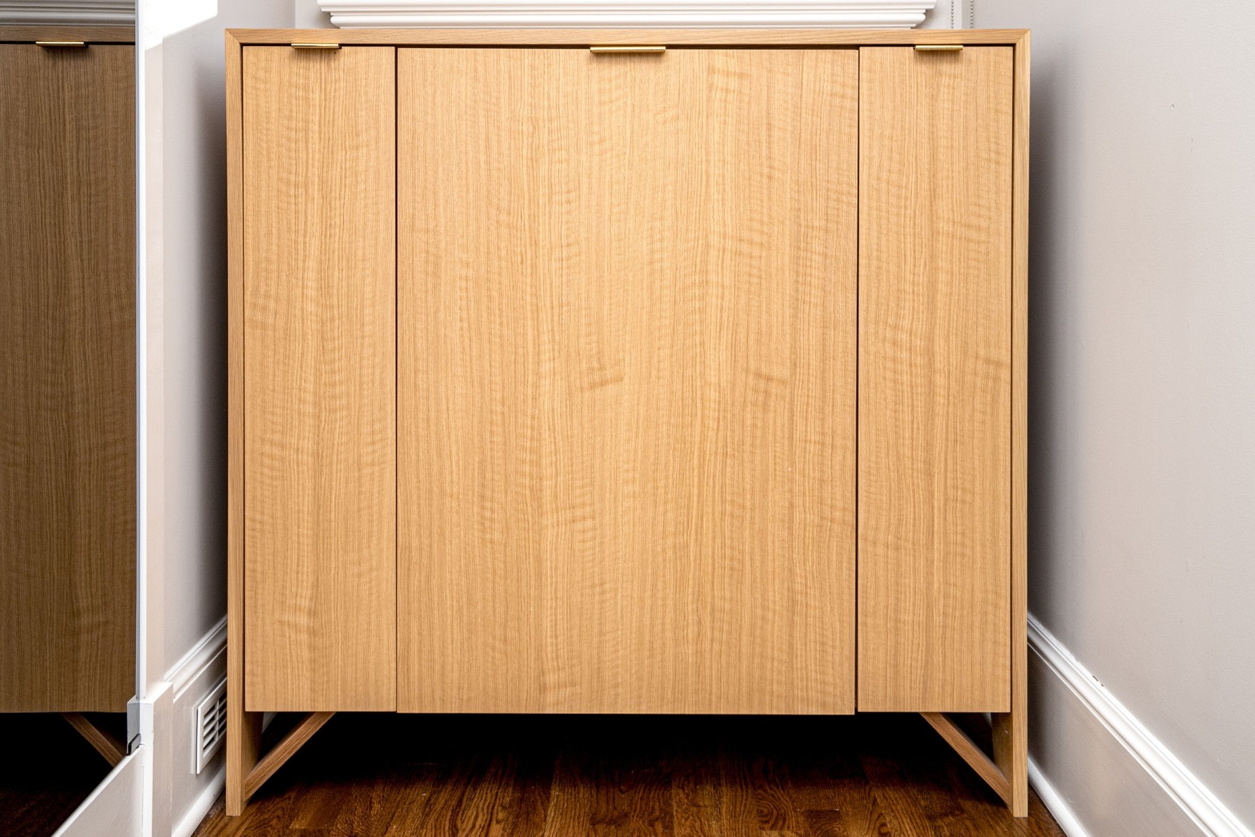 A luxurious custom Liebherr drinks fridge flanked by storage cabinets in gorgeous blonde wood. The cabinet sports a clean, minimalist design with a rectangular top leading into sleek legs flanking a center with three panels topped by low-profile brass handles. The center panel opens to the fridge, while the thin side cabinets open to shelved interiors. High quality construction with a sophisticated aesthetic.