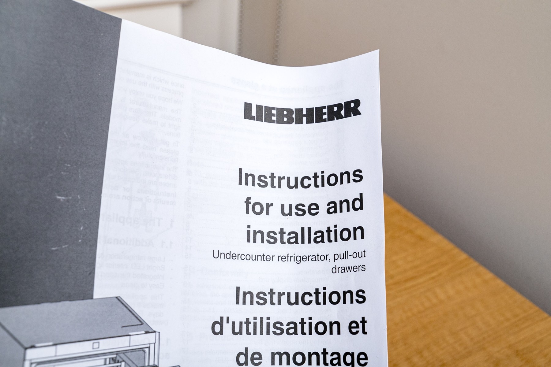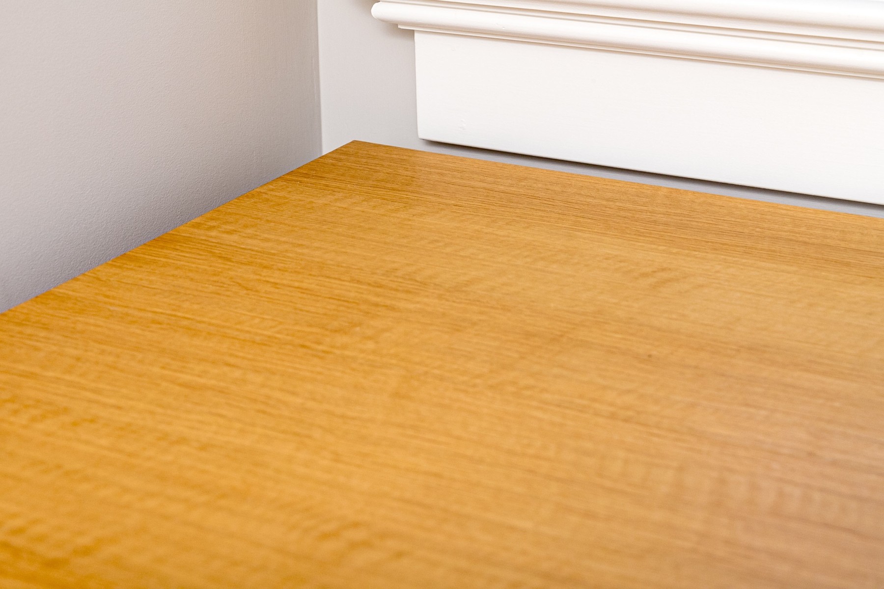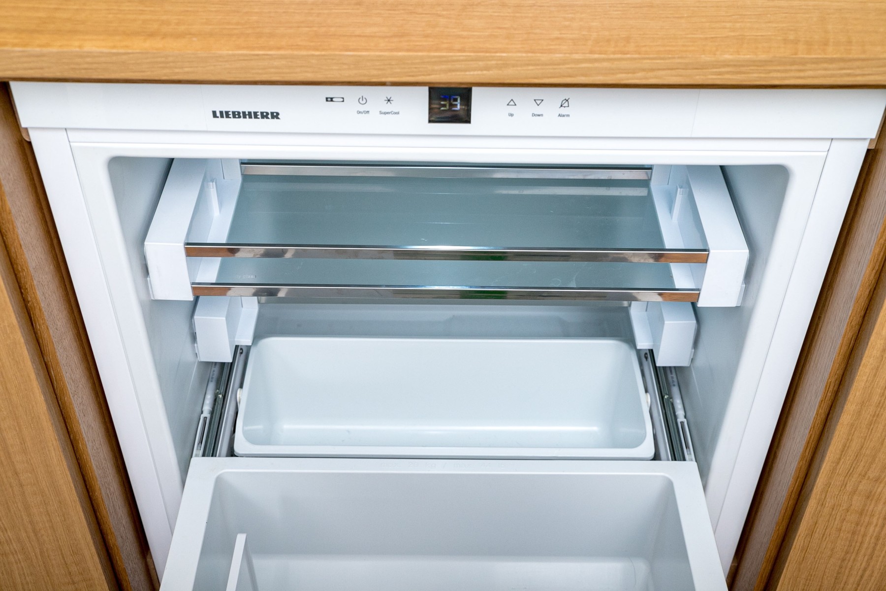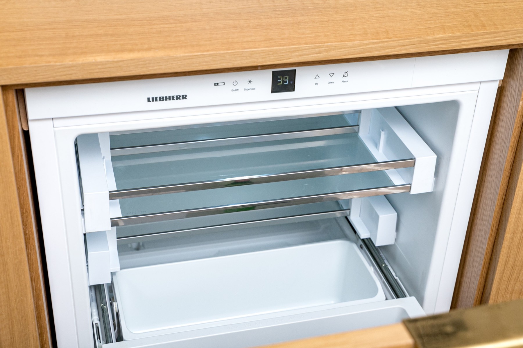 A luxurious custom Liebherr drinks fridge flanked by storage cabinets in gorgeous blonde wood. The cabinet sports a clean, minimalist design with a rectangular top leading into sleek legs flanking a center with three panels topped by low-profile brass handles. The center panel opens to the fridge, while the thin side cabinets open to shelved interiors. High quality construction with a sophisticated aesthetic.