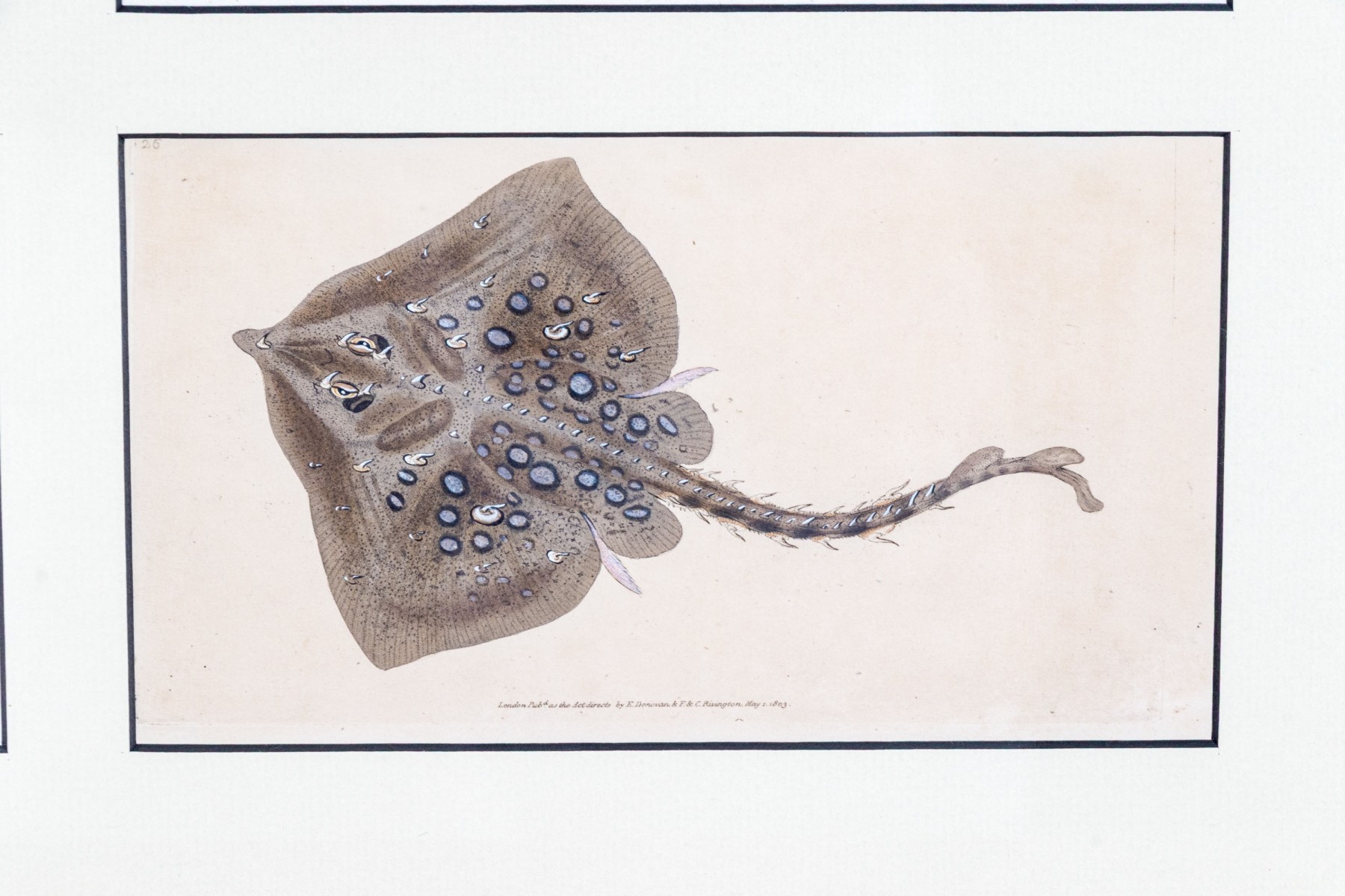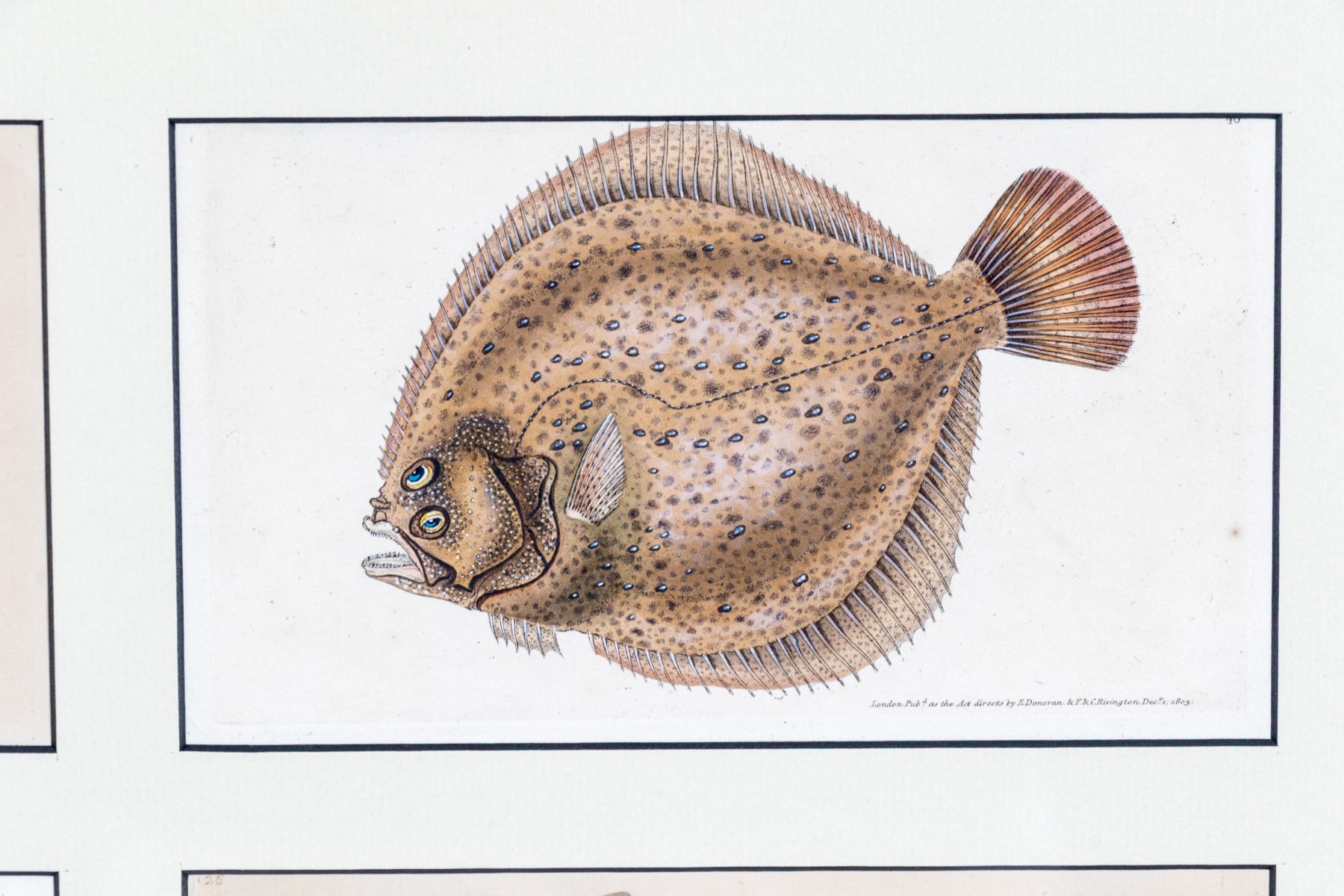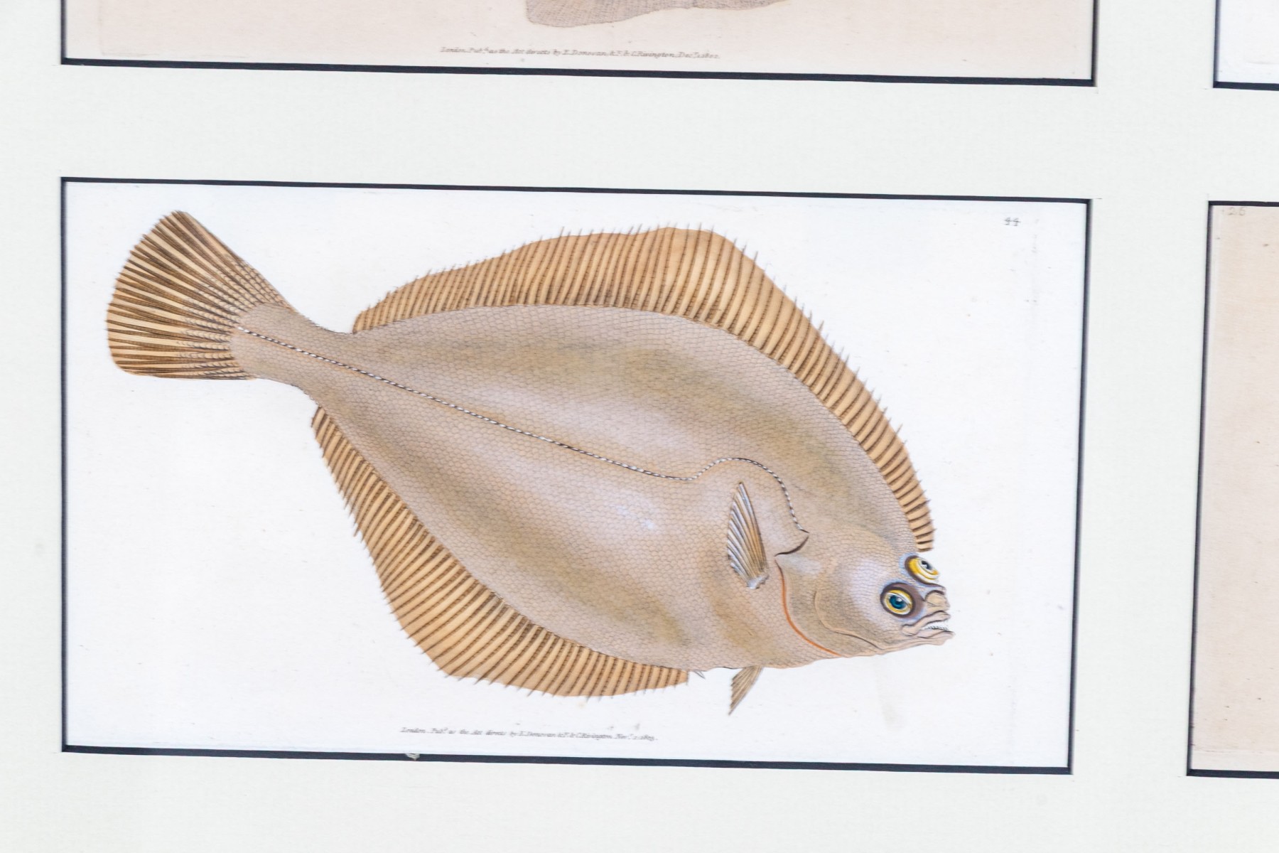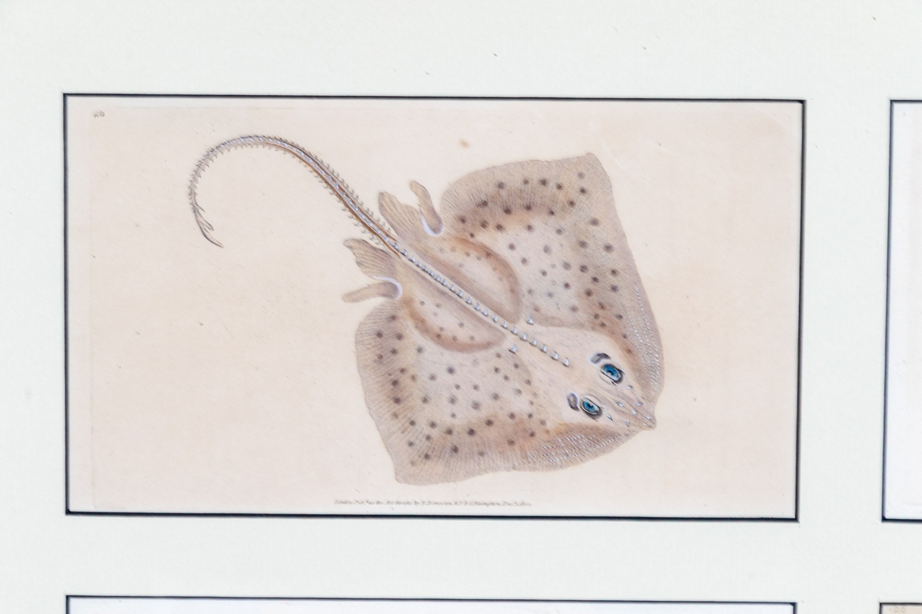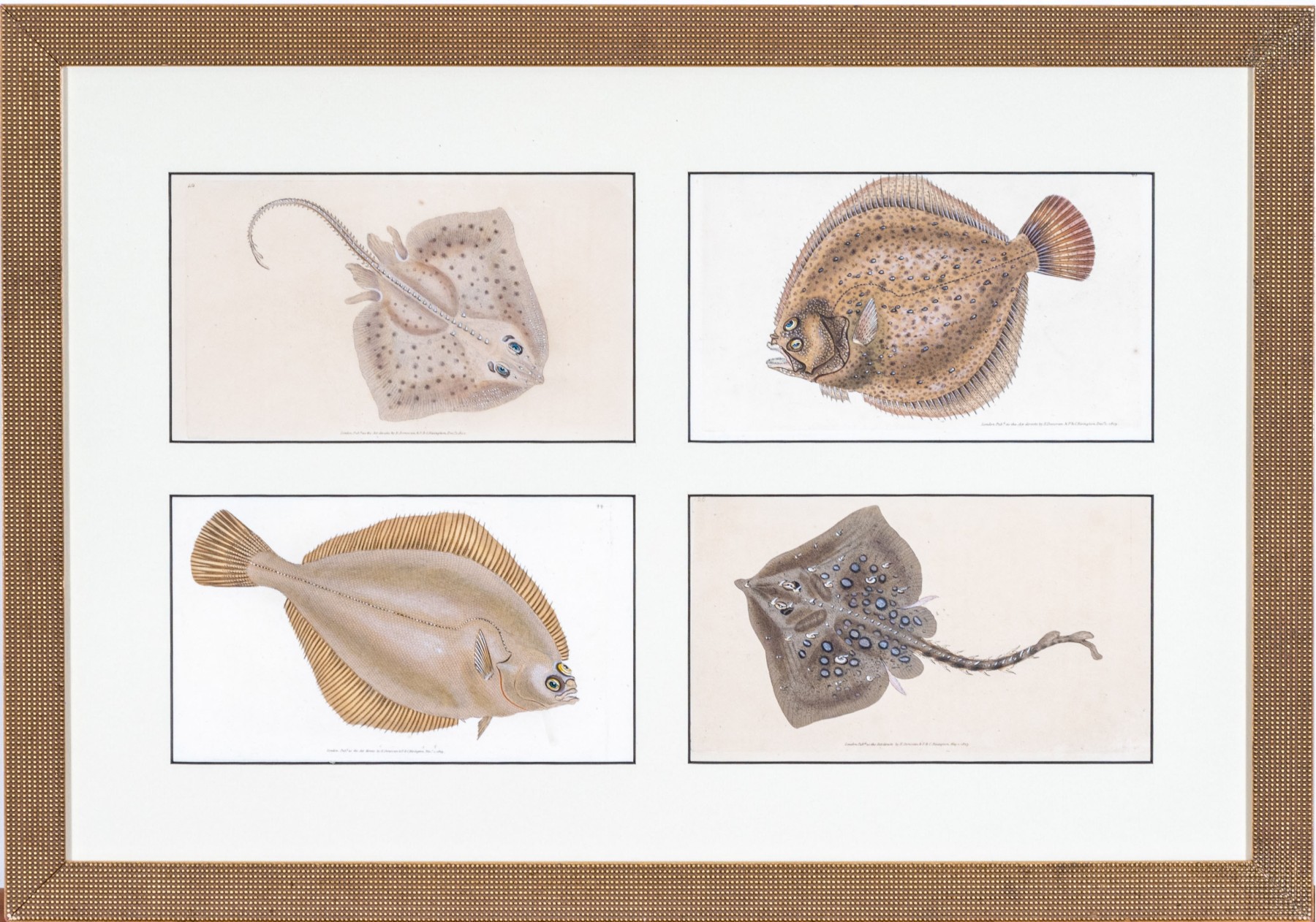 A wonderful group of four hand-colored fish prints displayed glazed and custom matted in a single frame with a decorative textural gilt finished.