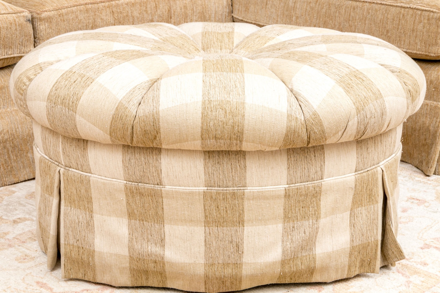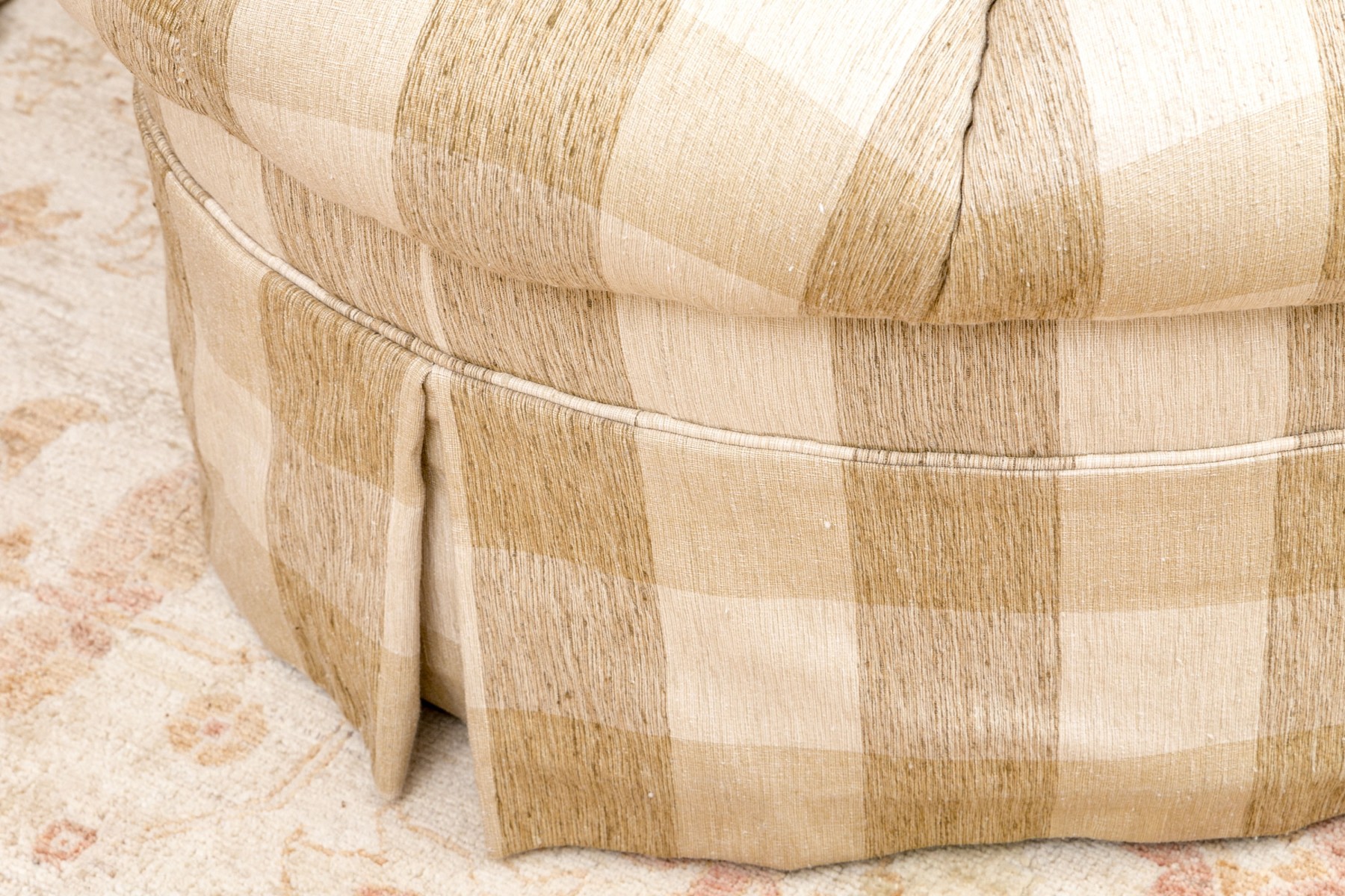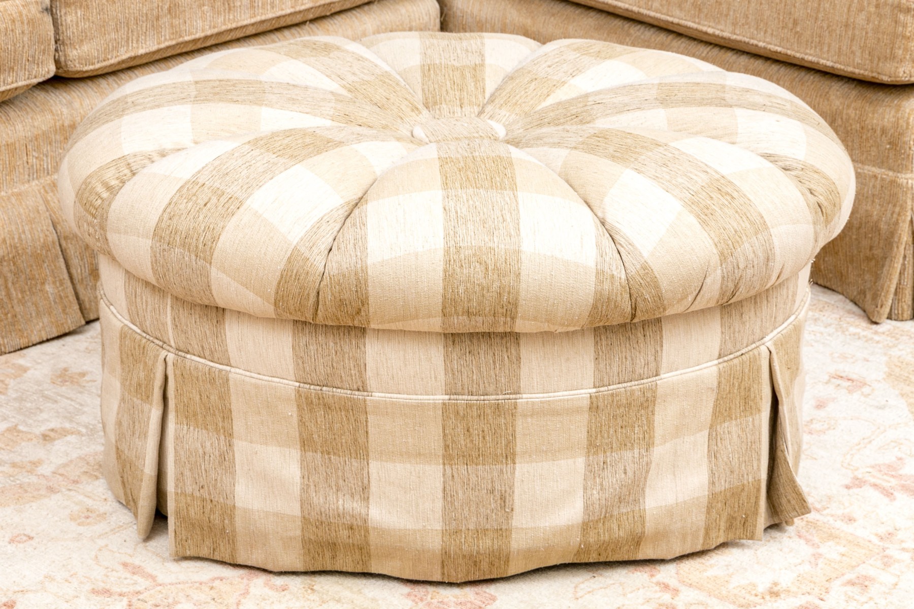 A charming circular ottoman custom upholstered in cream and beige buffalo plaid. Features a plump top with a center button tuft and a simply pleated apron. Raised on caster feet.