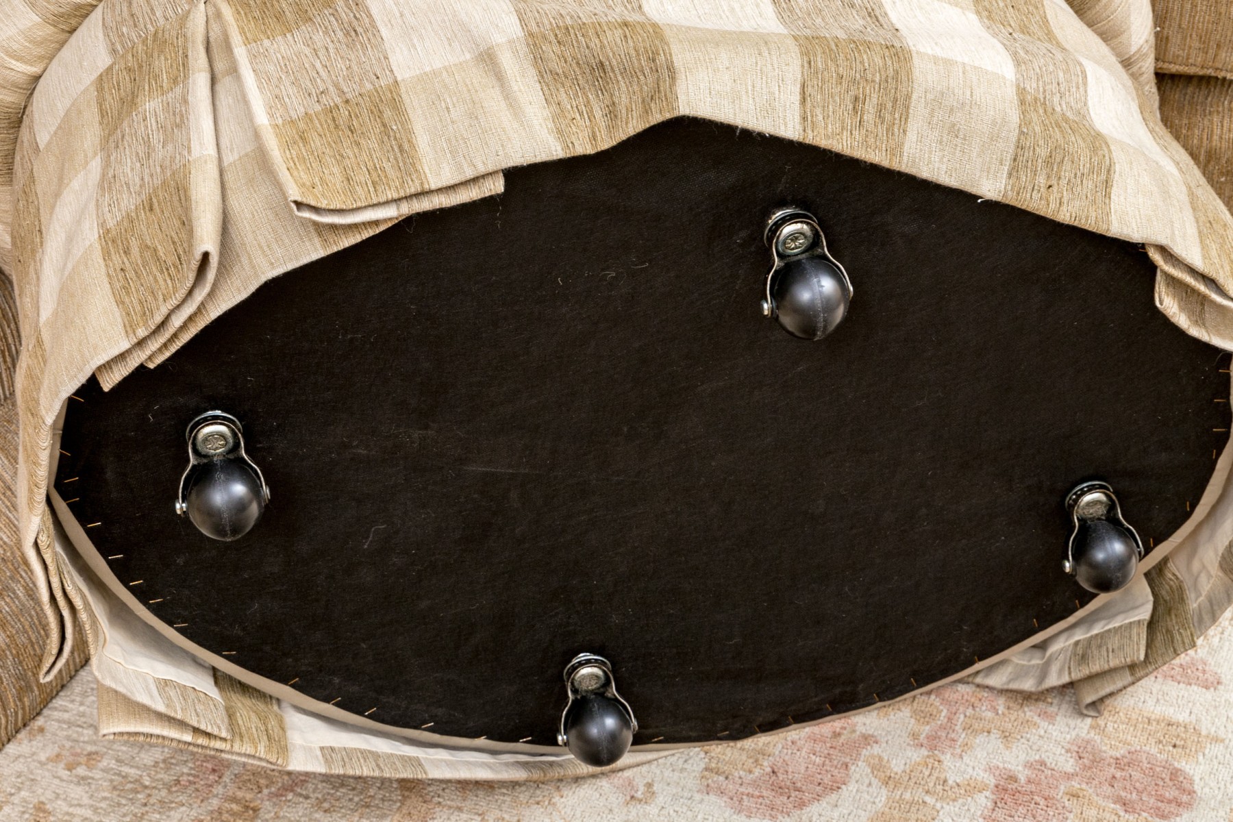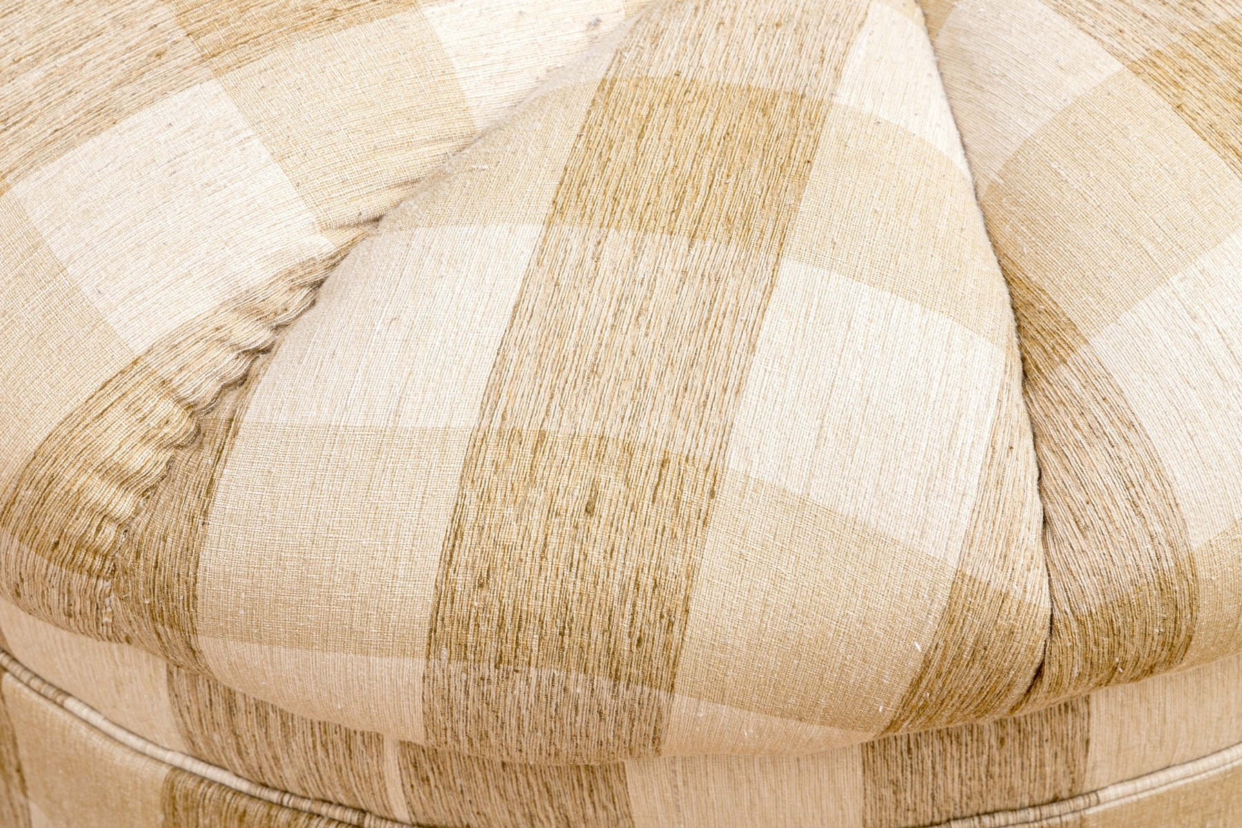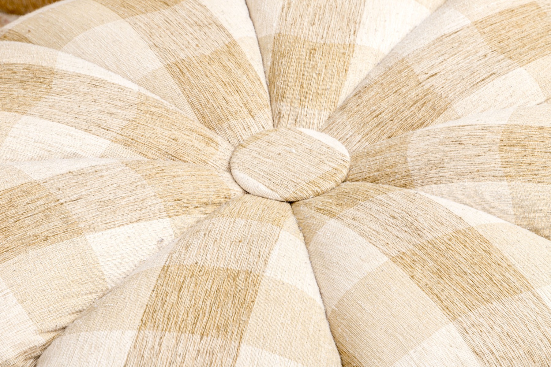 A charming circular ottoman custom upholstered in cream and beige buffalo plaid. Features a plump top with a center button tuft and a simply pleated apron. Raised on caster feet.