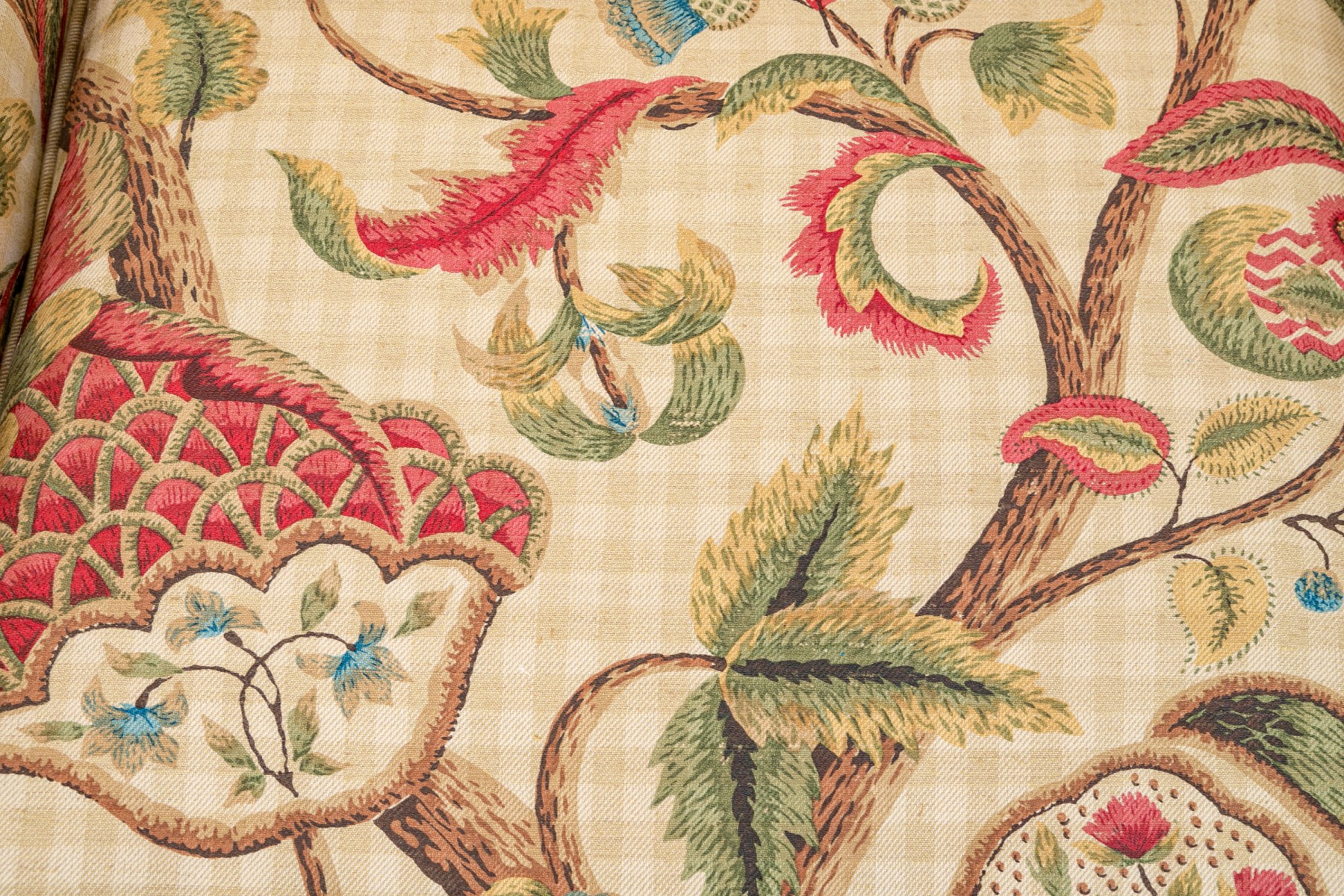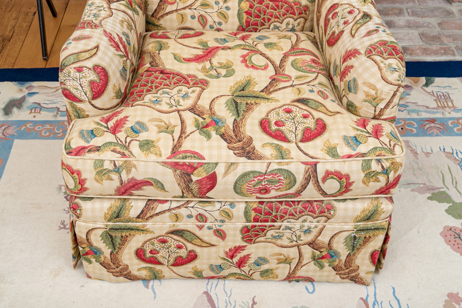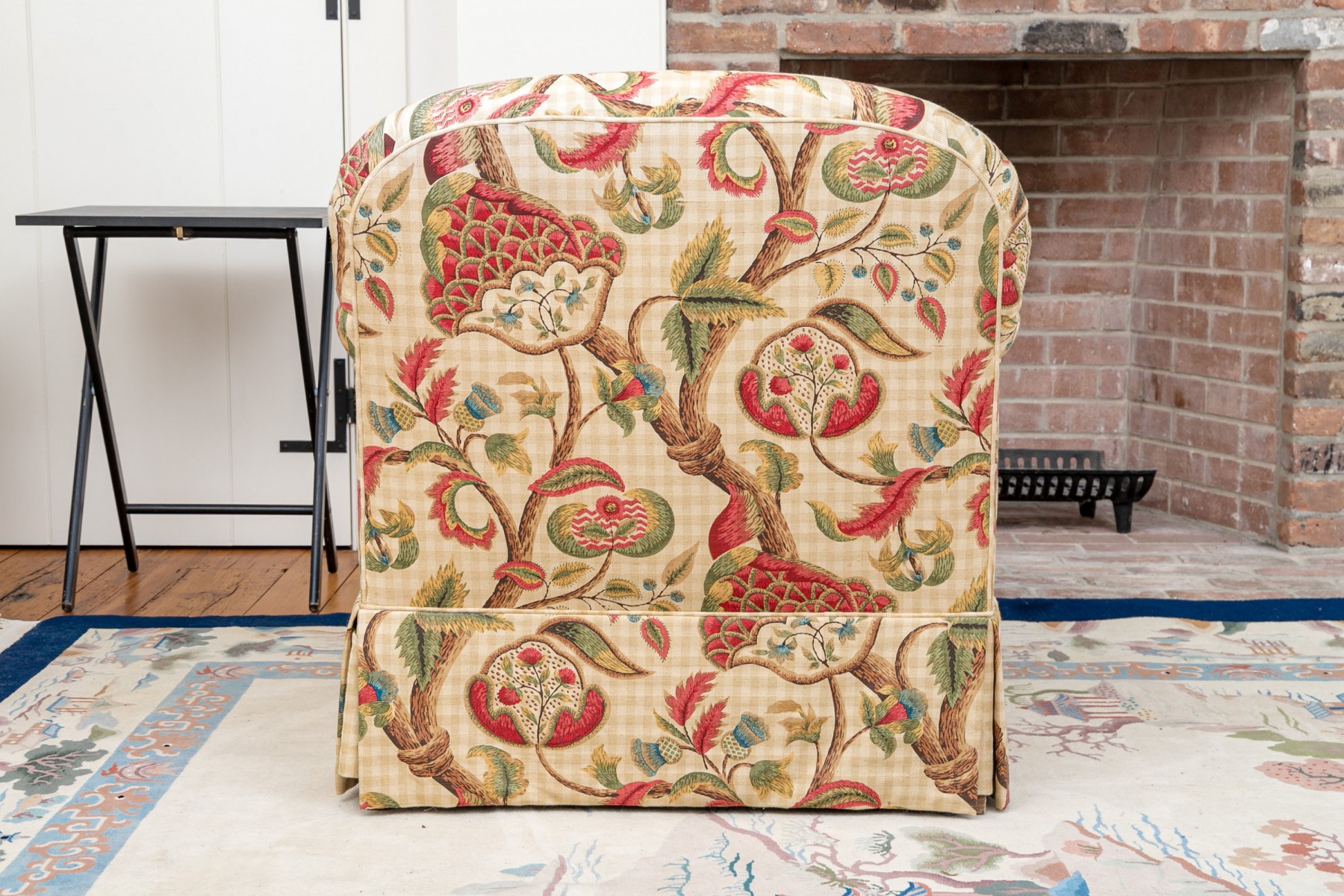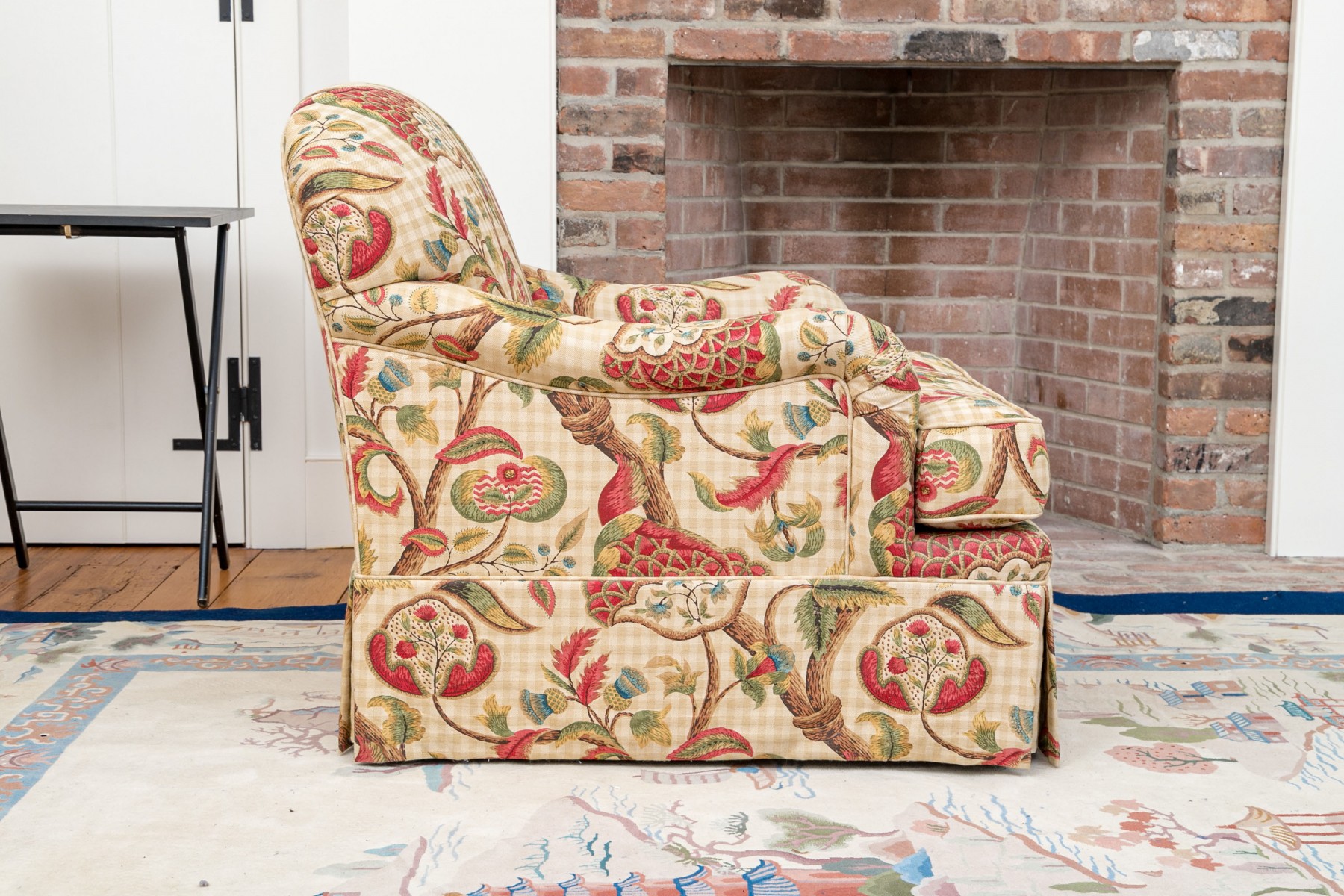 This custom upholstered armchair, with its pleated skirt and tapering rolled arms, offers both style and comfort. Its has a loose seat cushion, making it a cozy addition to any living space.