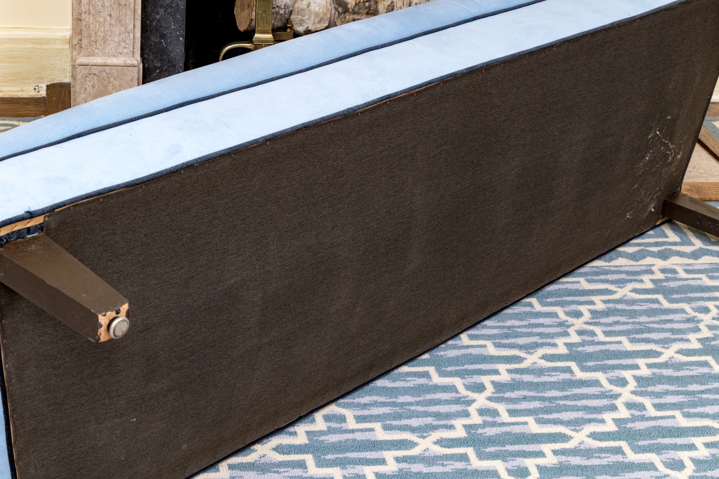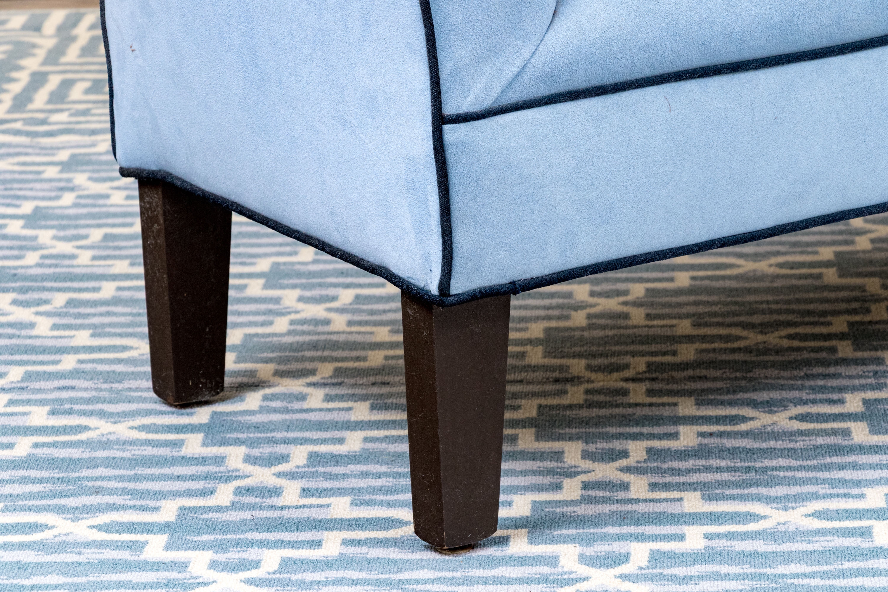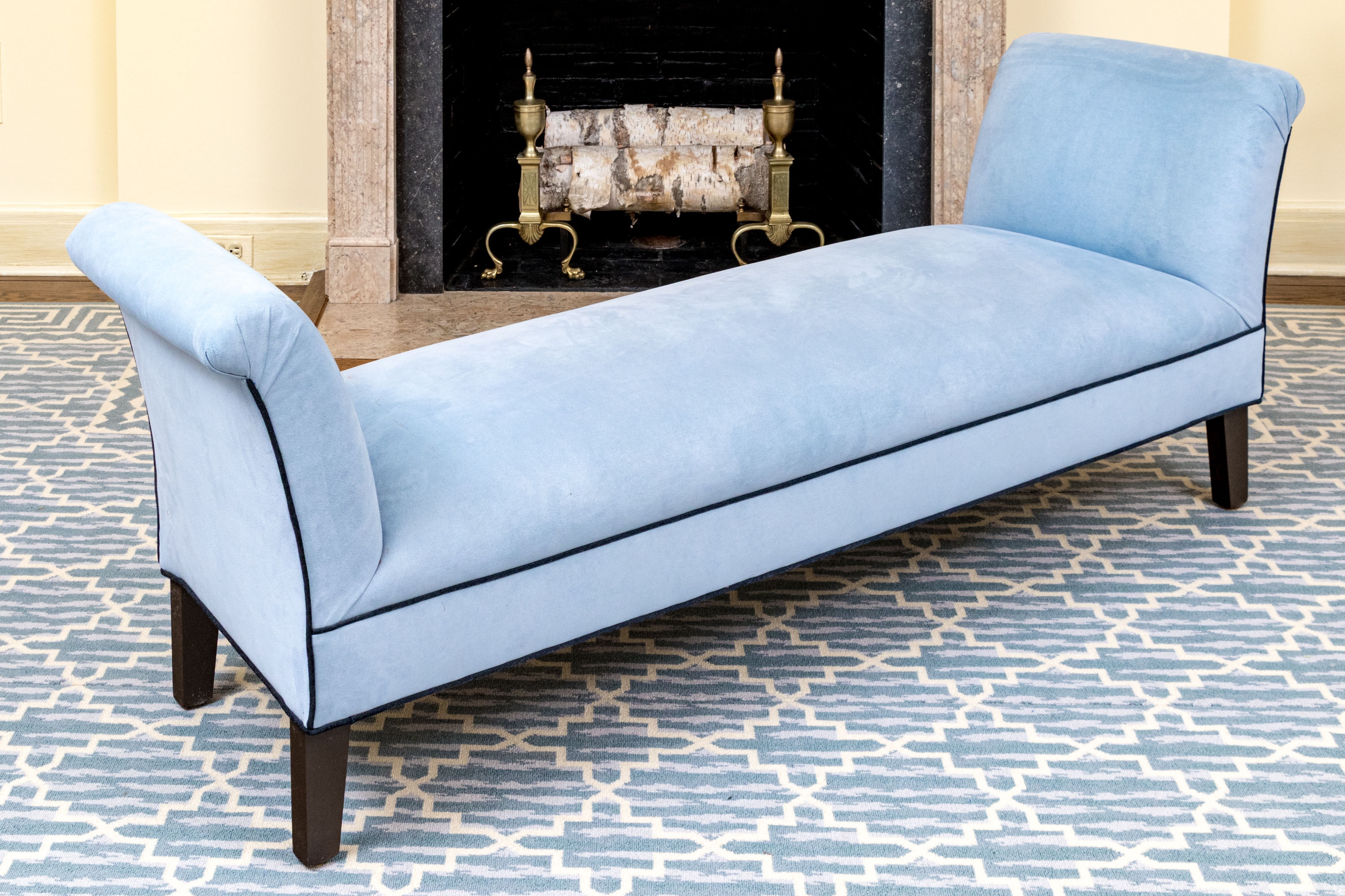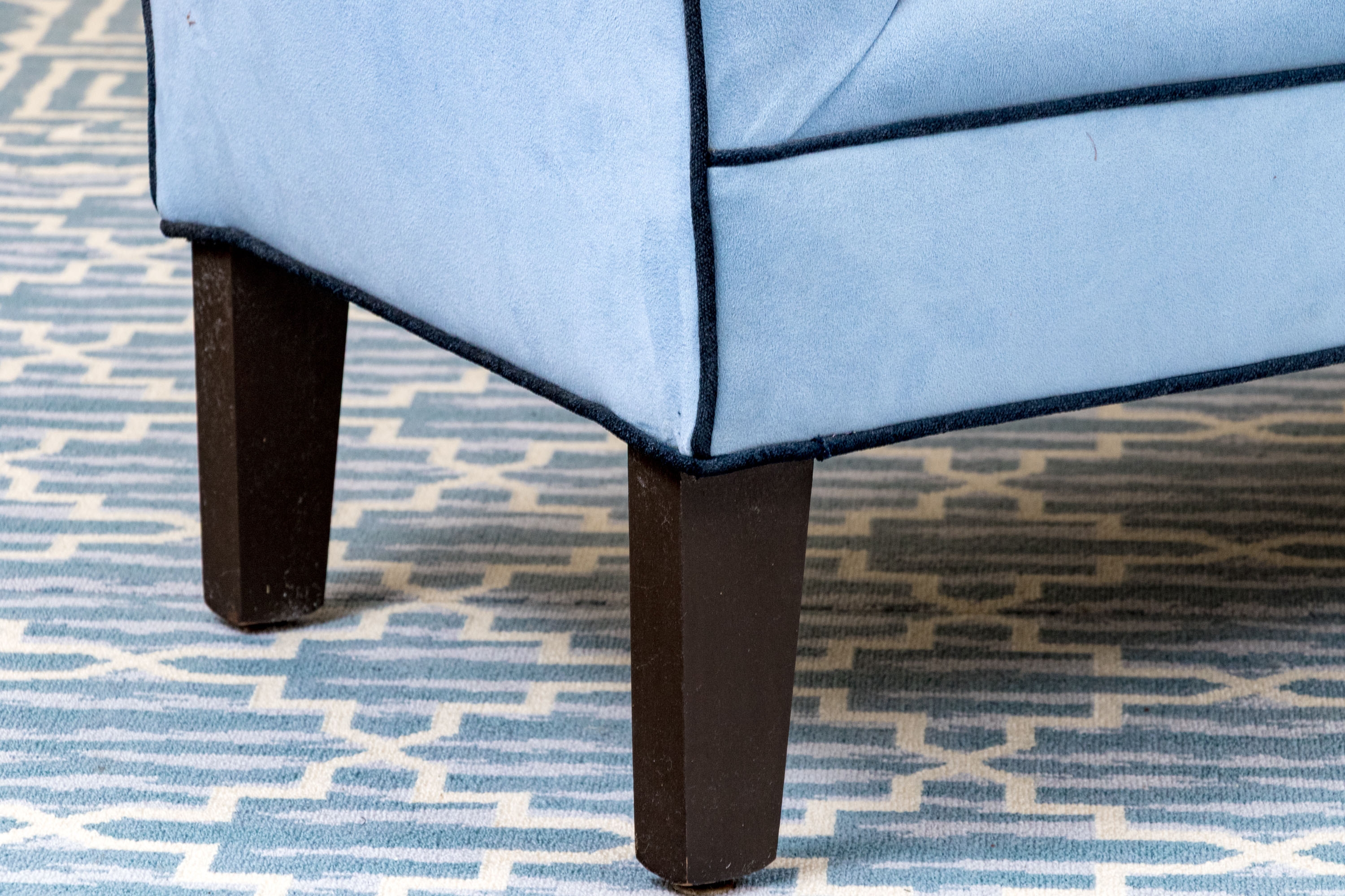 On four dark stained wood legs. The custom upholstered blue long seat cushion with flared arms has a darker blue hued piped trim for decorative effect.
