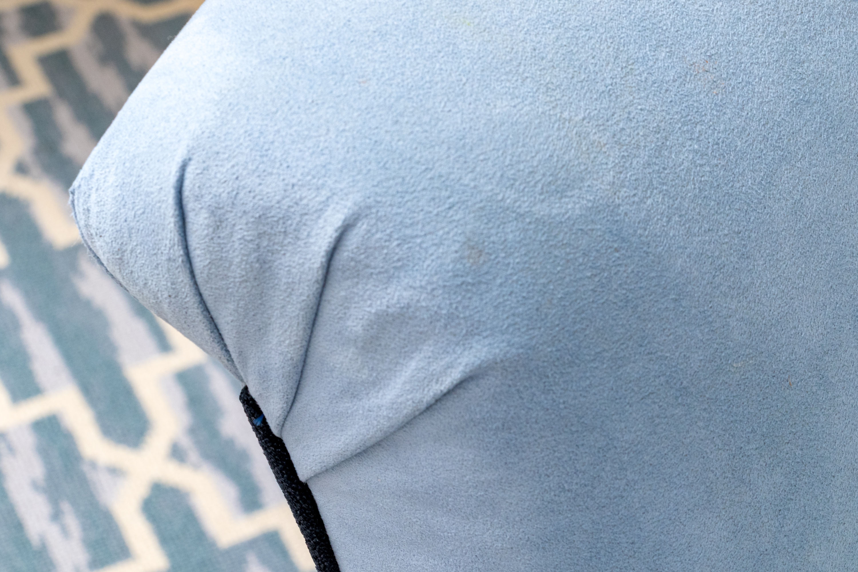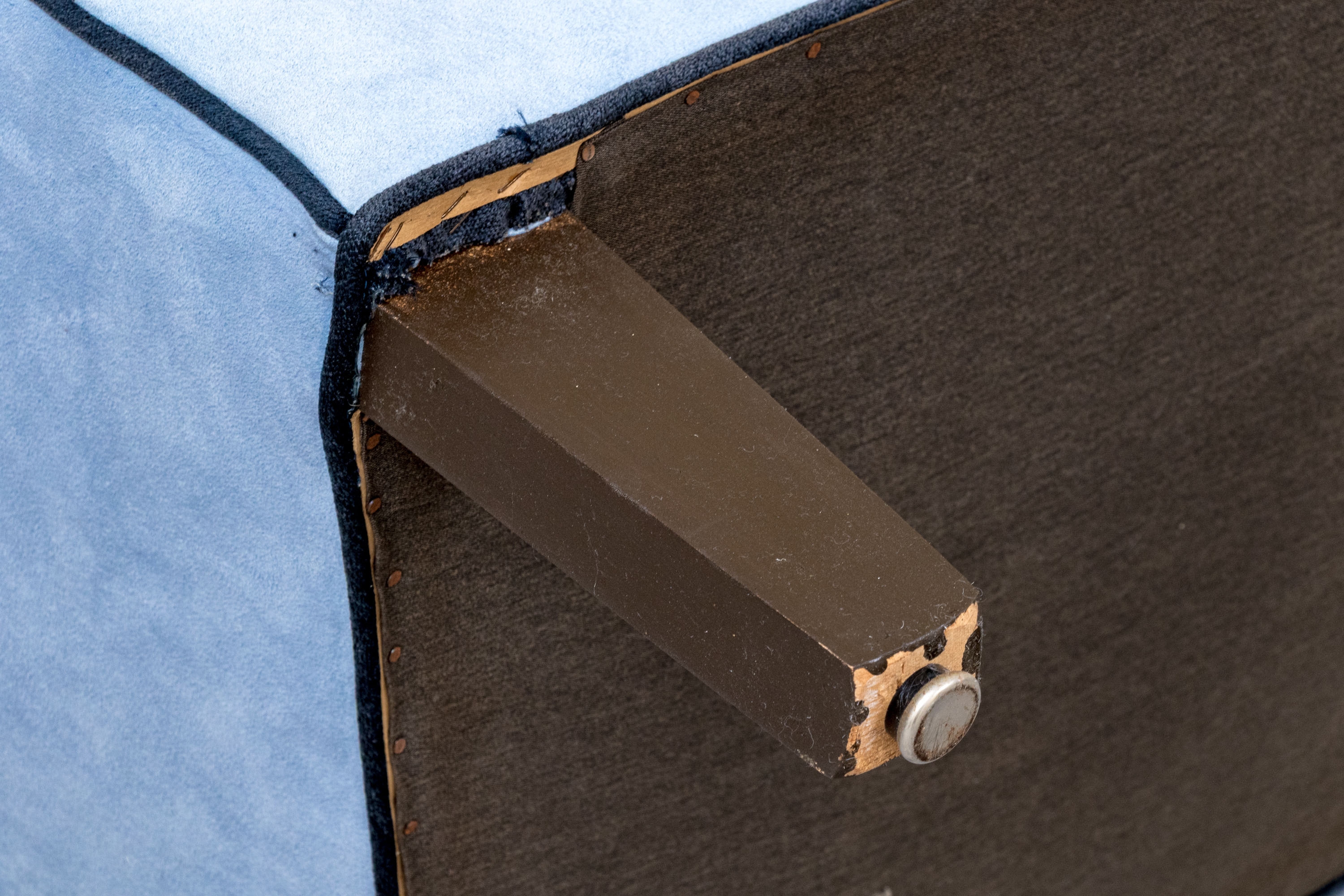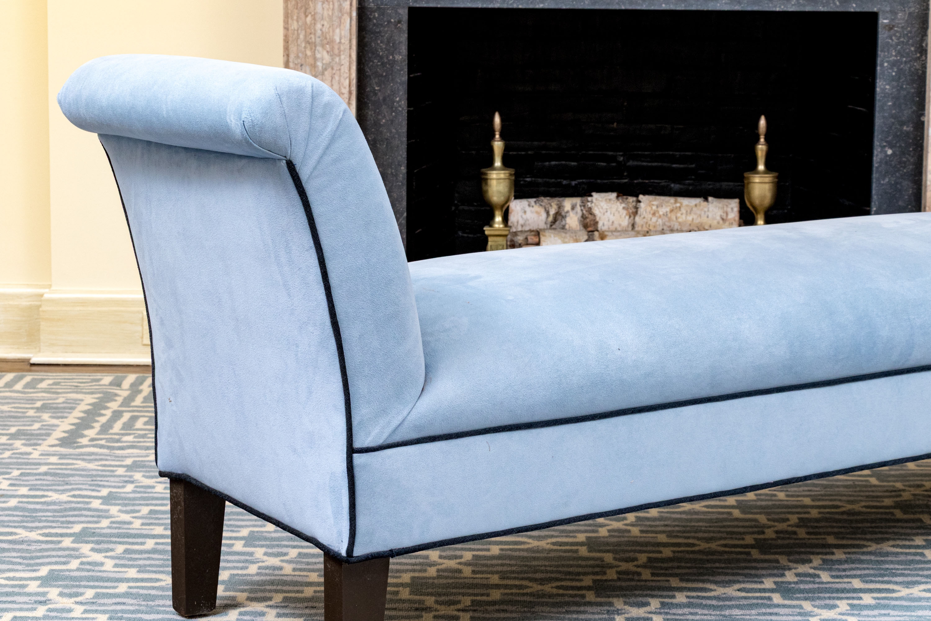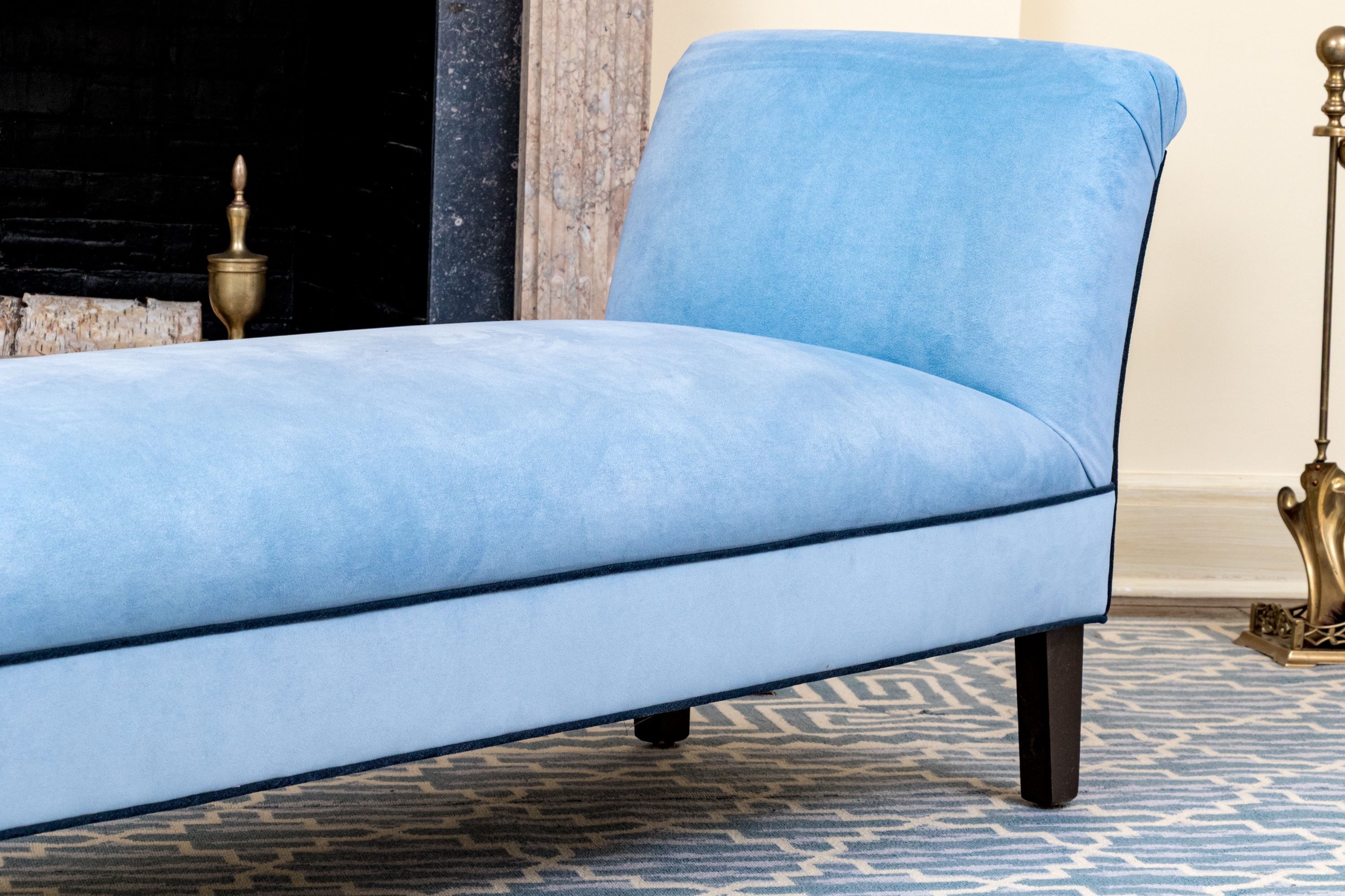 On four dark stained wood legs. The custom upholstered blue long seat cushion with flared arms has a darker blue hued piped trim for decorative effect.