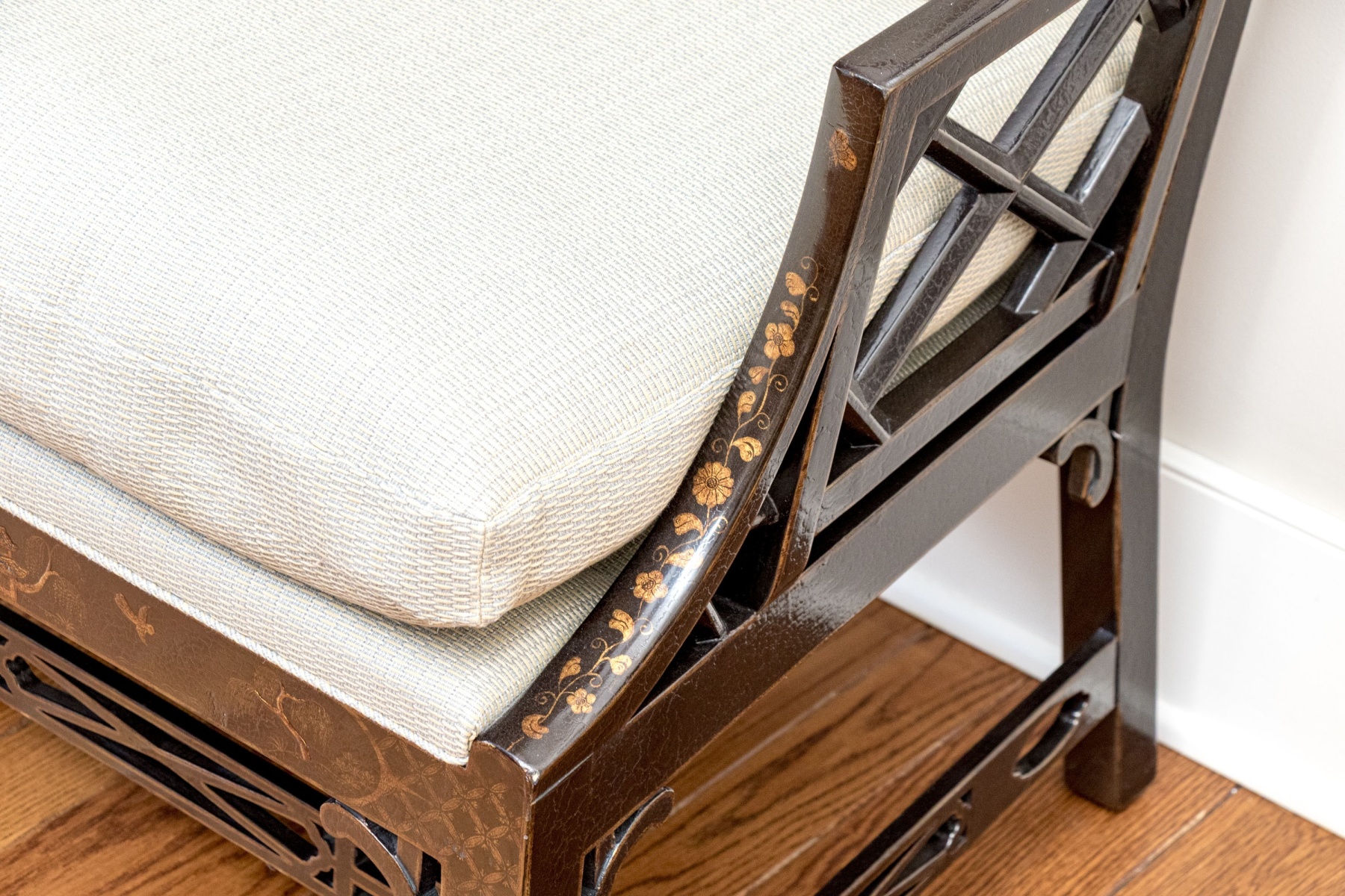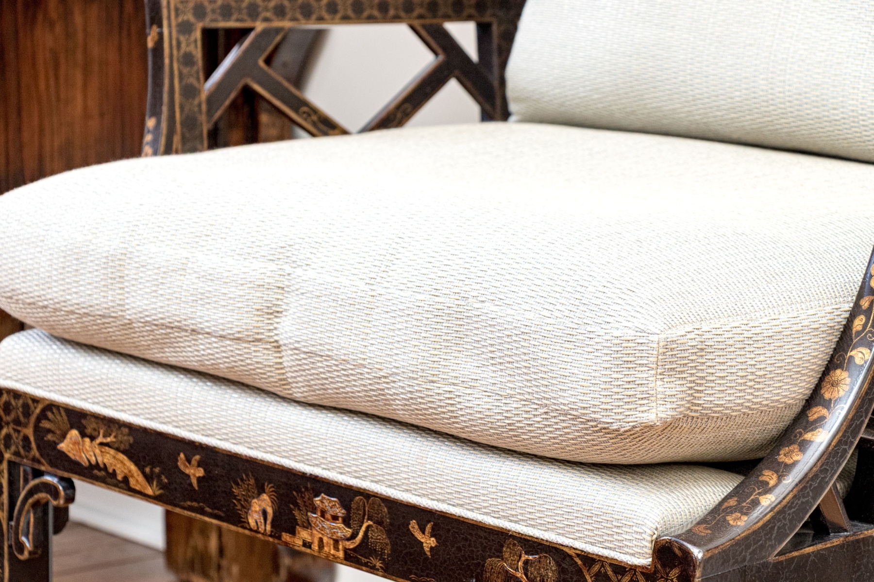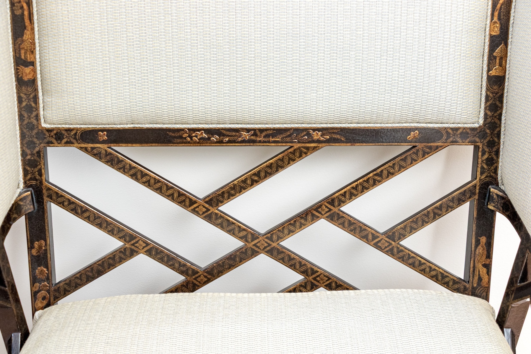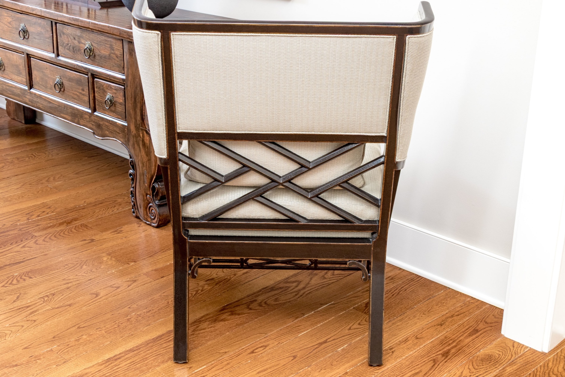 A handsome pair of chinoiserie wing chairs designed with four legs and pierced stretcher supports with openwork geometric arms and upholstered seat, seat back and verso along with loose upholstered seat cushion and seat back cushion.