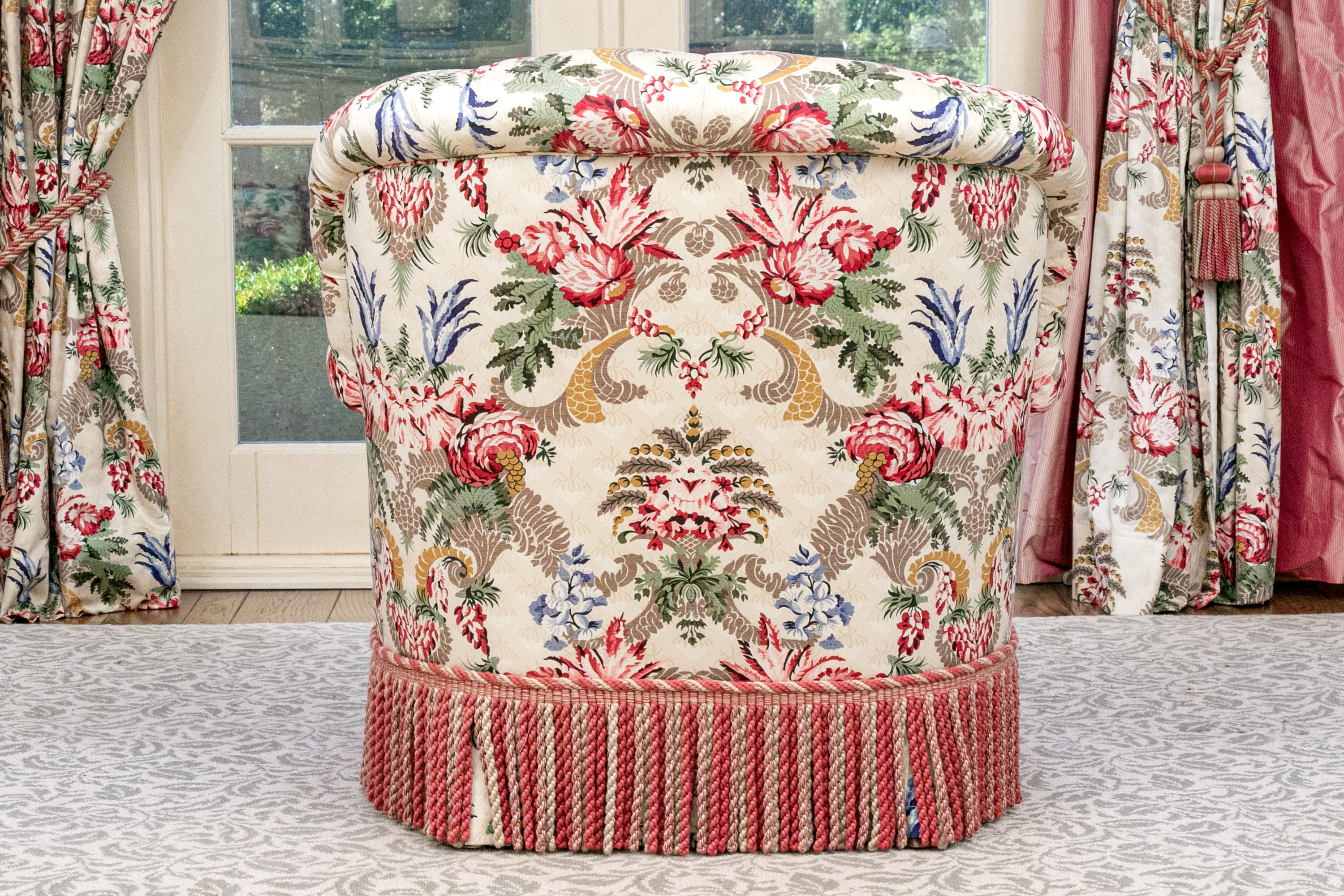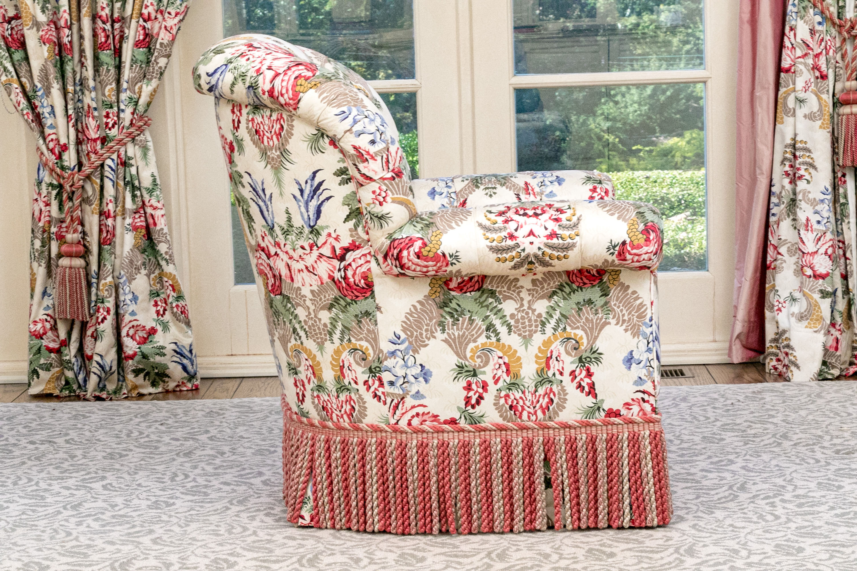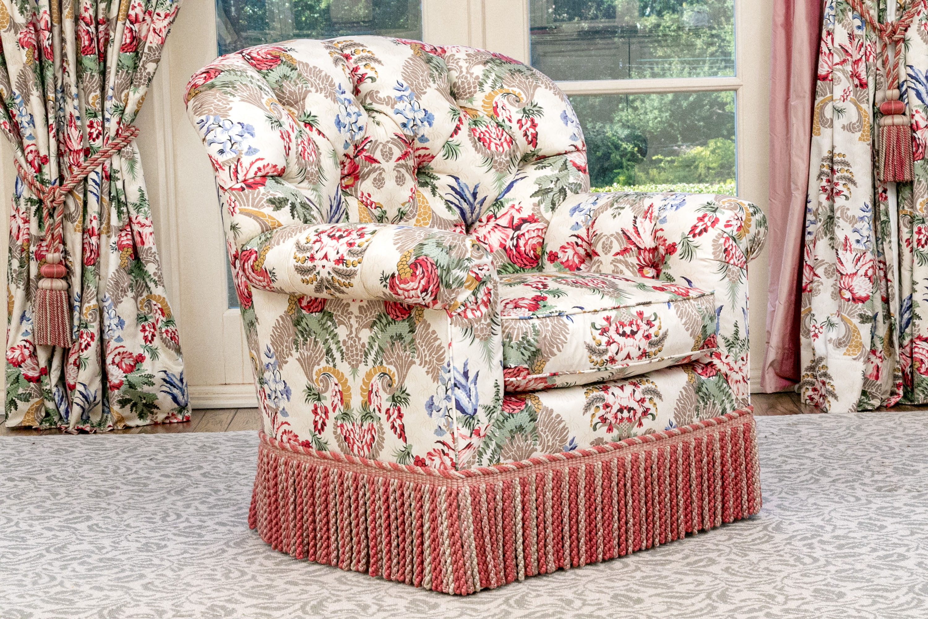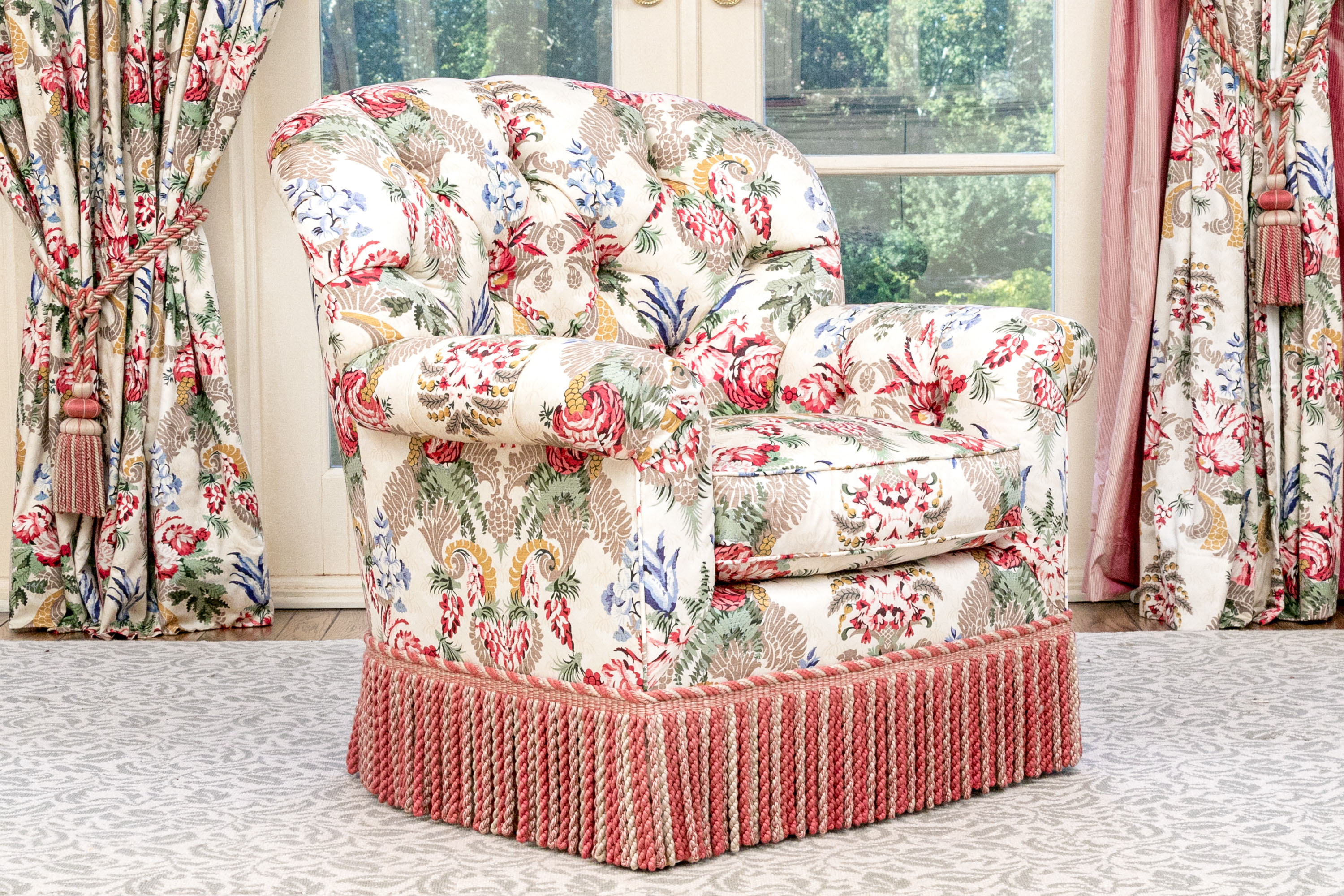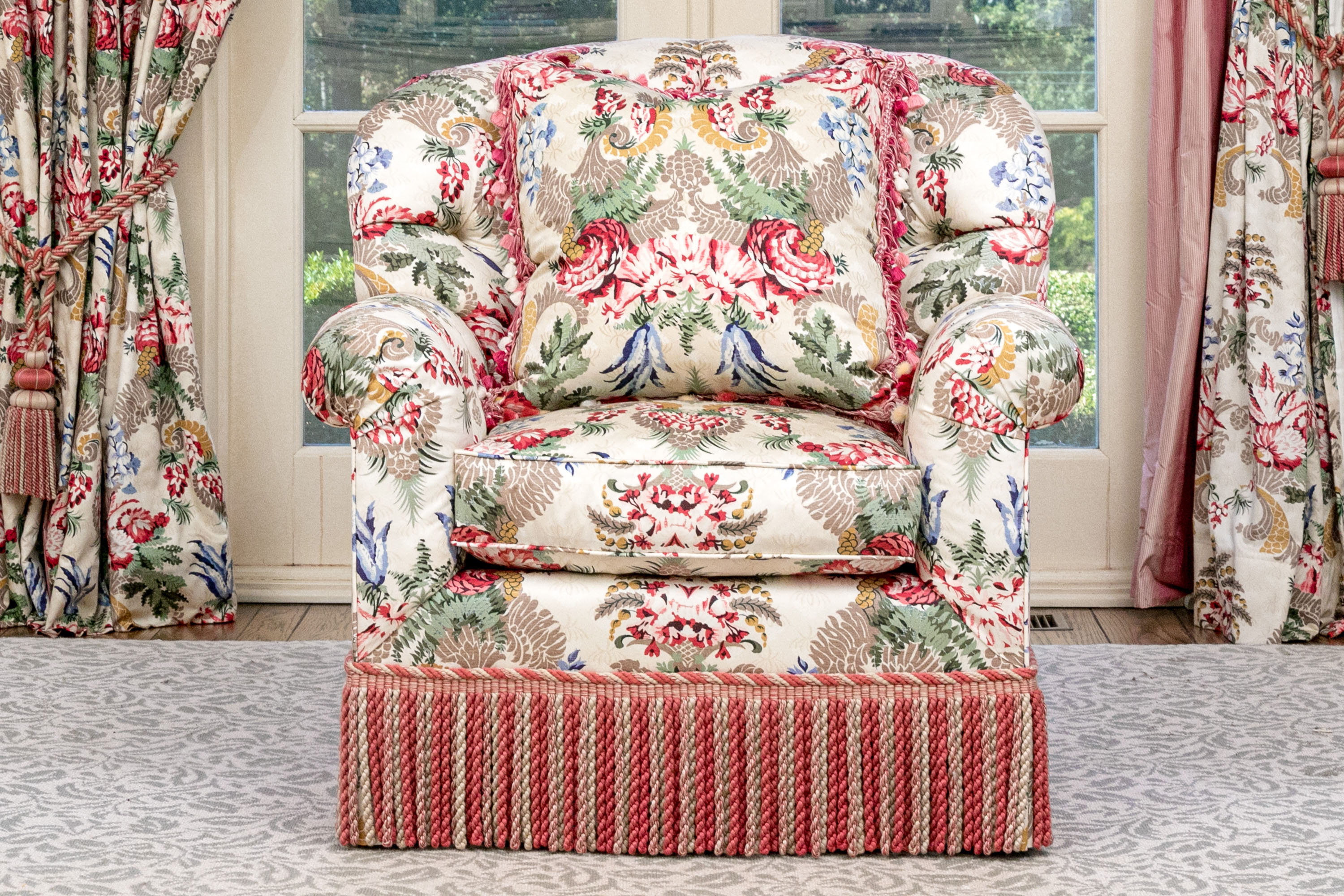 A distinguished armchair boasting an oversized button tufted back, rolled arms, and loose seat cushion. Accompanied by a large accent pillow in matching cream upholstery decorated with bold and elegant designs of symmetrical foliage in yellow, taupe, red, and blue. The pillow is finished with a red tassel fringe, complimenting a red and taupe bullion fringe skirt on the chair.