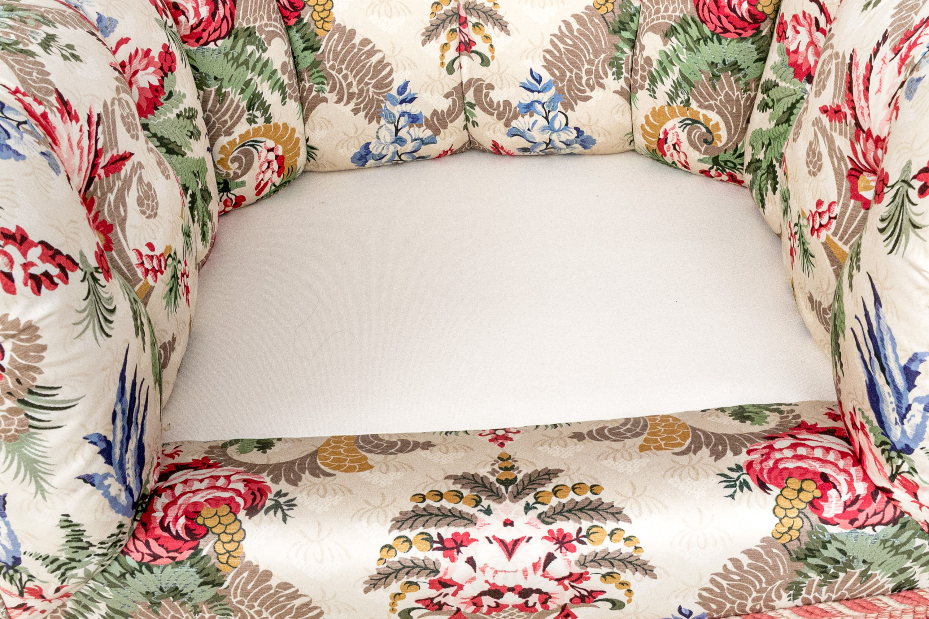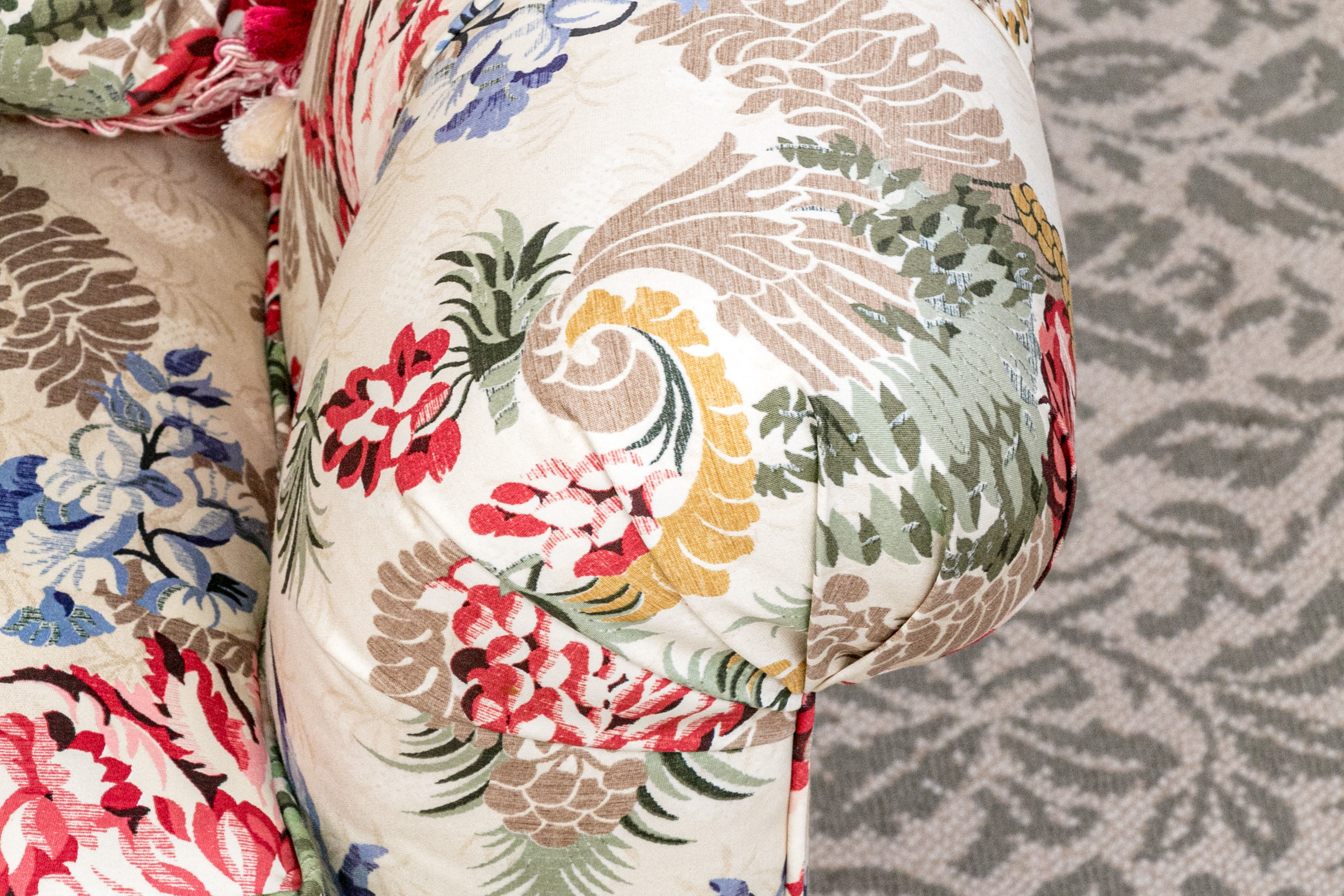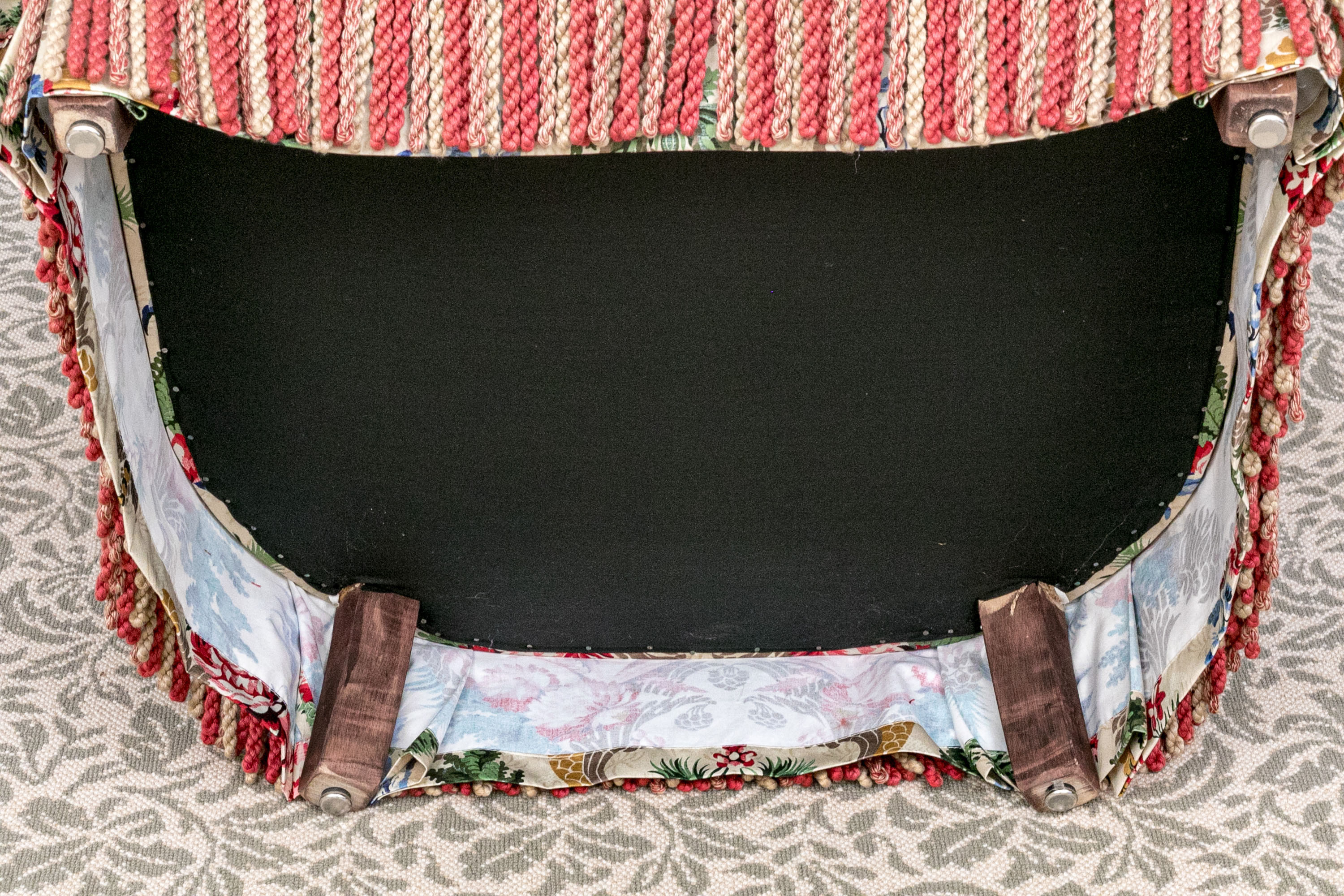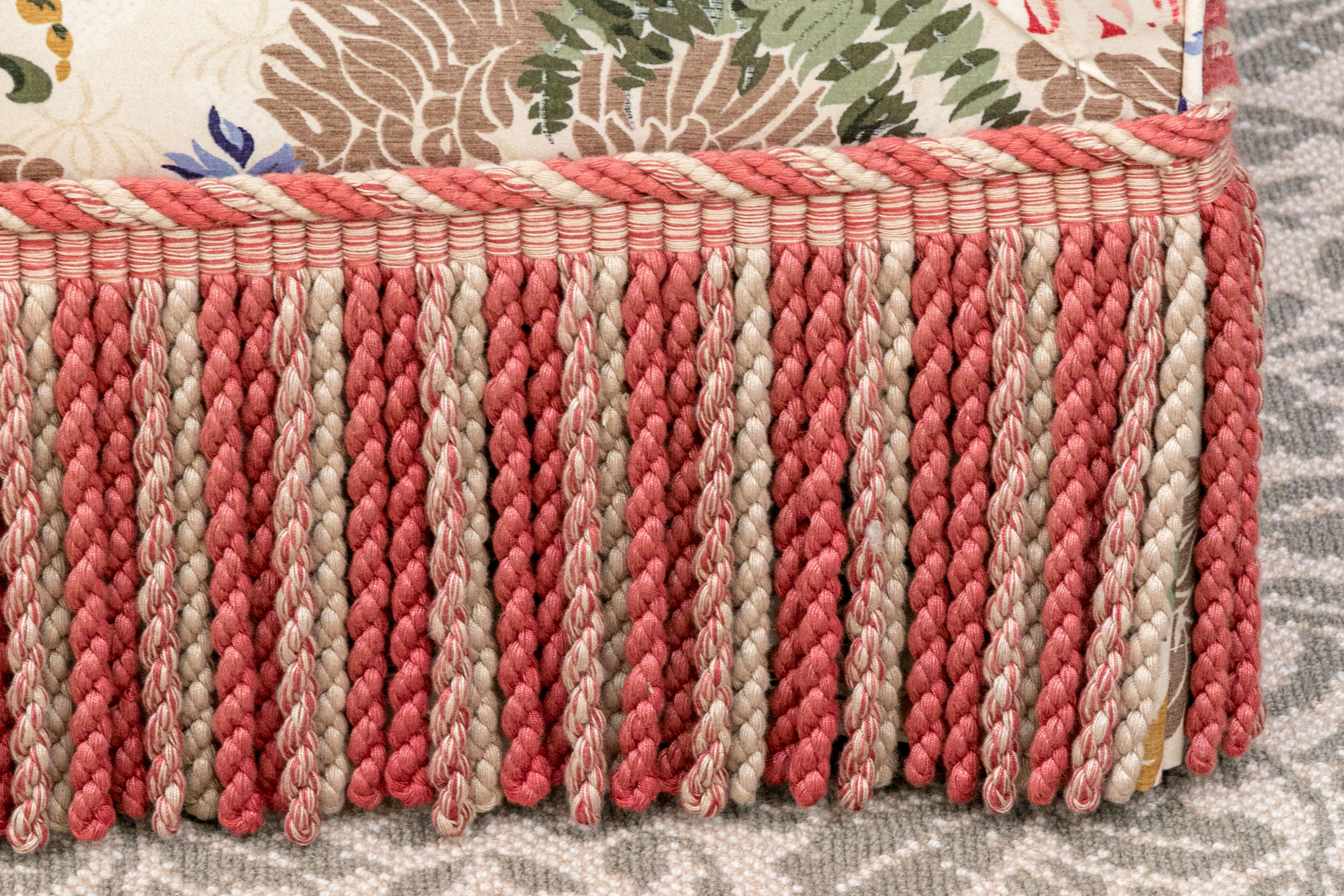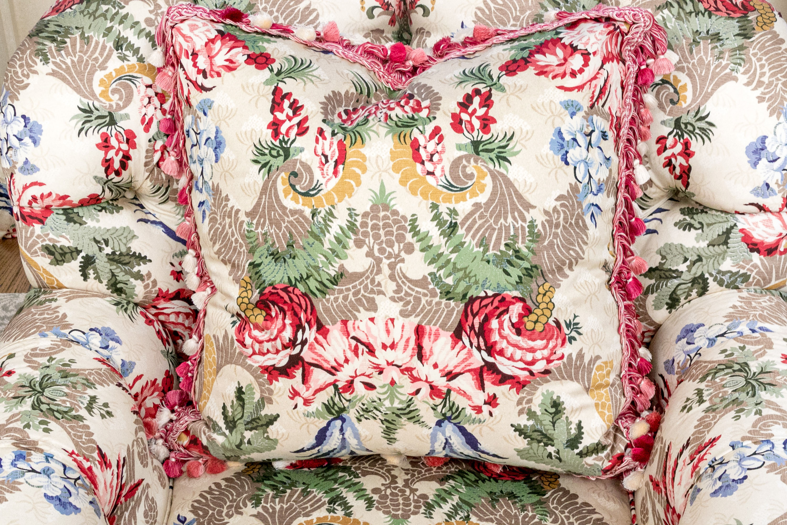 A distinguished armchair boasting an oversized button tufted back, rolled arms, and loose seat cushion. Accompanied by a large accent pillow in matching cream upholstery decorated with bold and elegant designs of symmetrical foliage in yellow, taupe, red, and blue. The pillow is finished with a red tassel fringe, complimenting a red and taupe bullion fringe skirt on the chair.