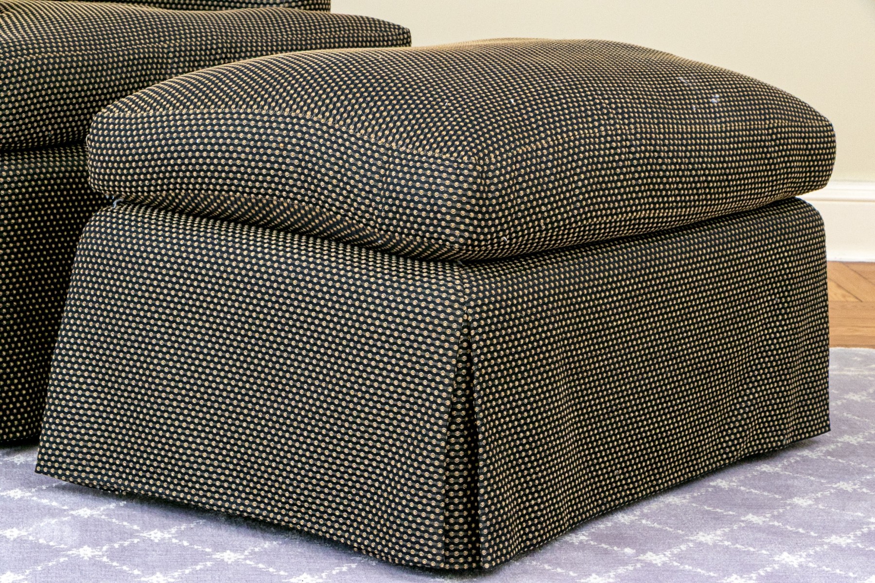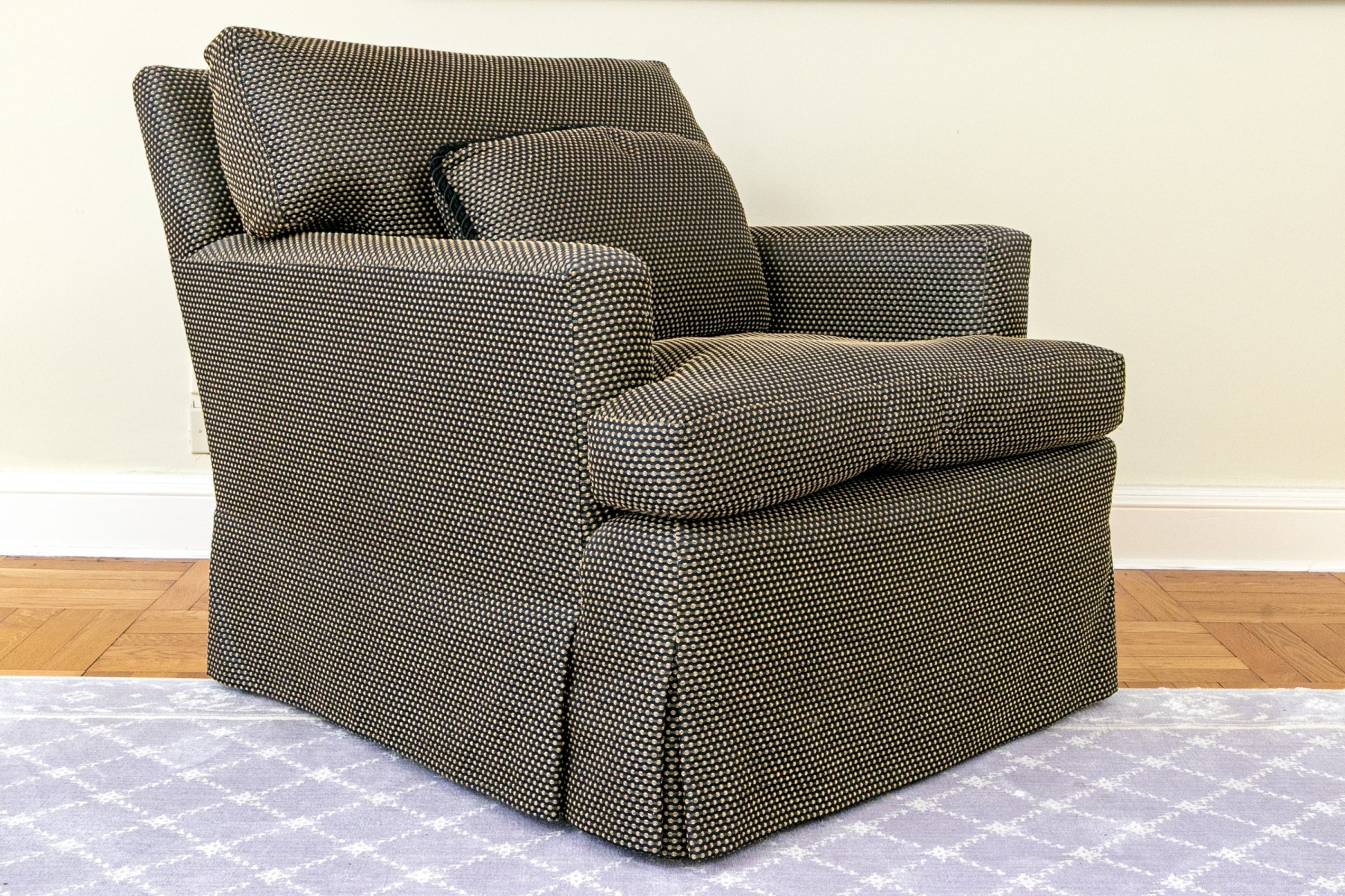 The custom upholstered armchair and ottoman have down filled cushions. Both chair and ottoman on casters has an apron to conceal the underneath as does the ottoman. The chair has a loose upholstered seat and seat back cushion with a loose upholstered accent bolster cushion. Dimensions: 16" H x 27 1/2 x 17 1/2" D, ottoman